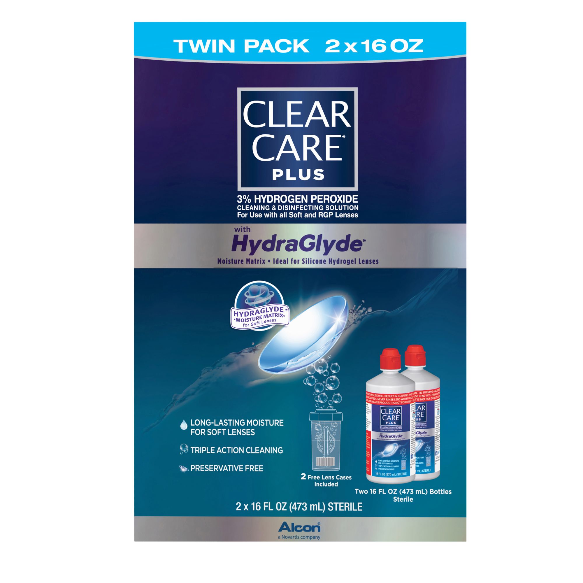 Makes your lenses feel like new Long-lasting moisture Triple action cleaning HydraGlyde Moisture Matrix Preservative-free Includes two 16-oz. bottles and 2 lens cases