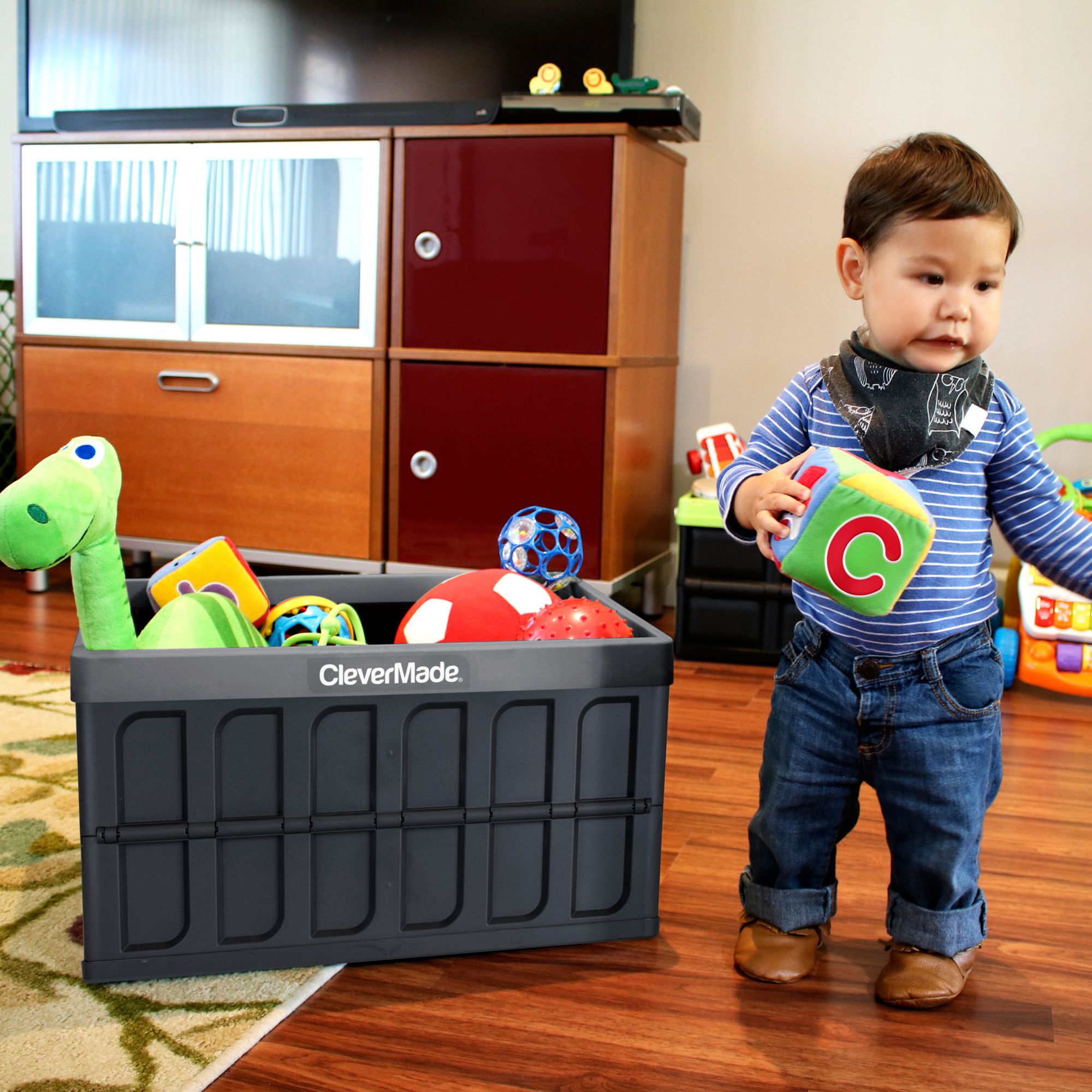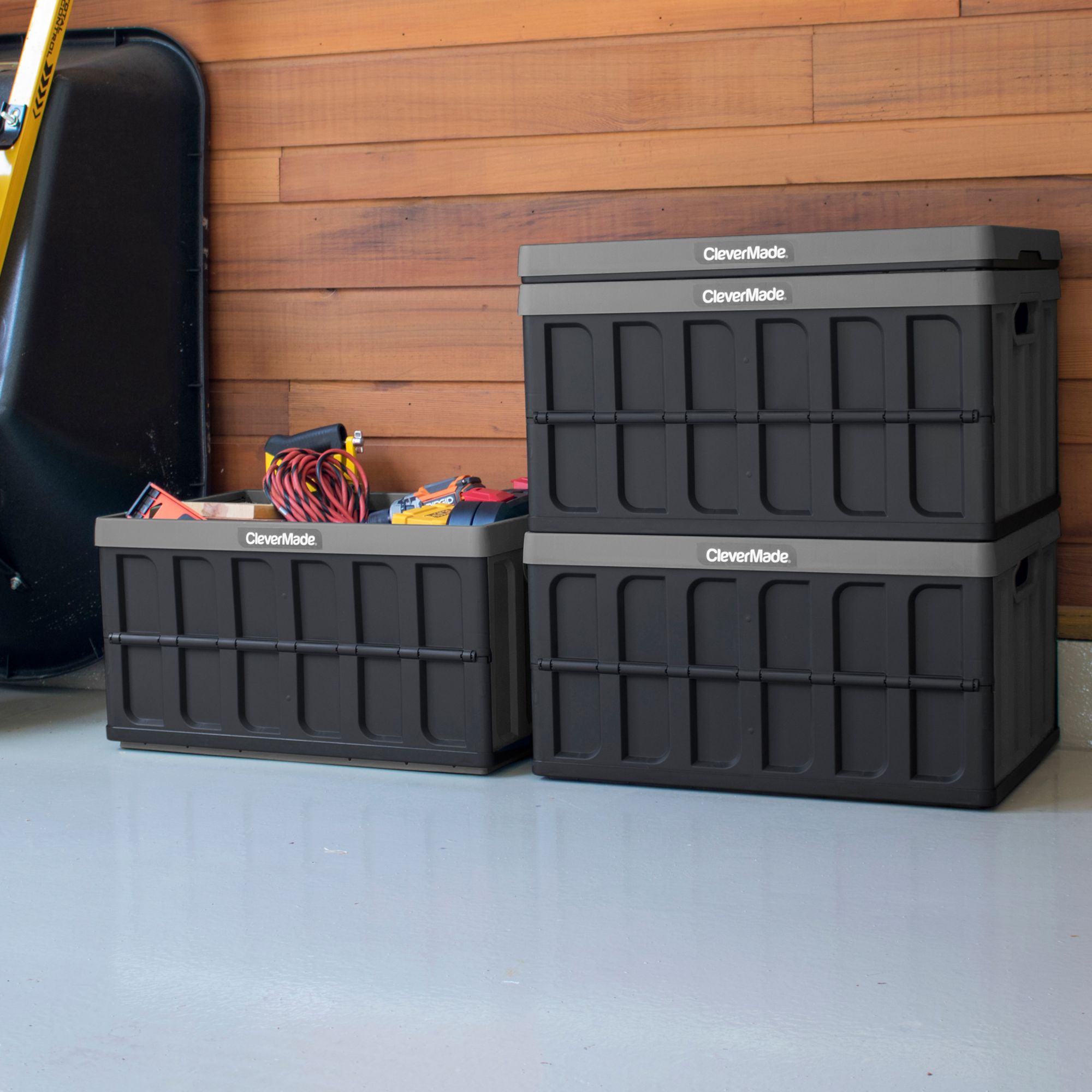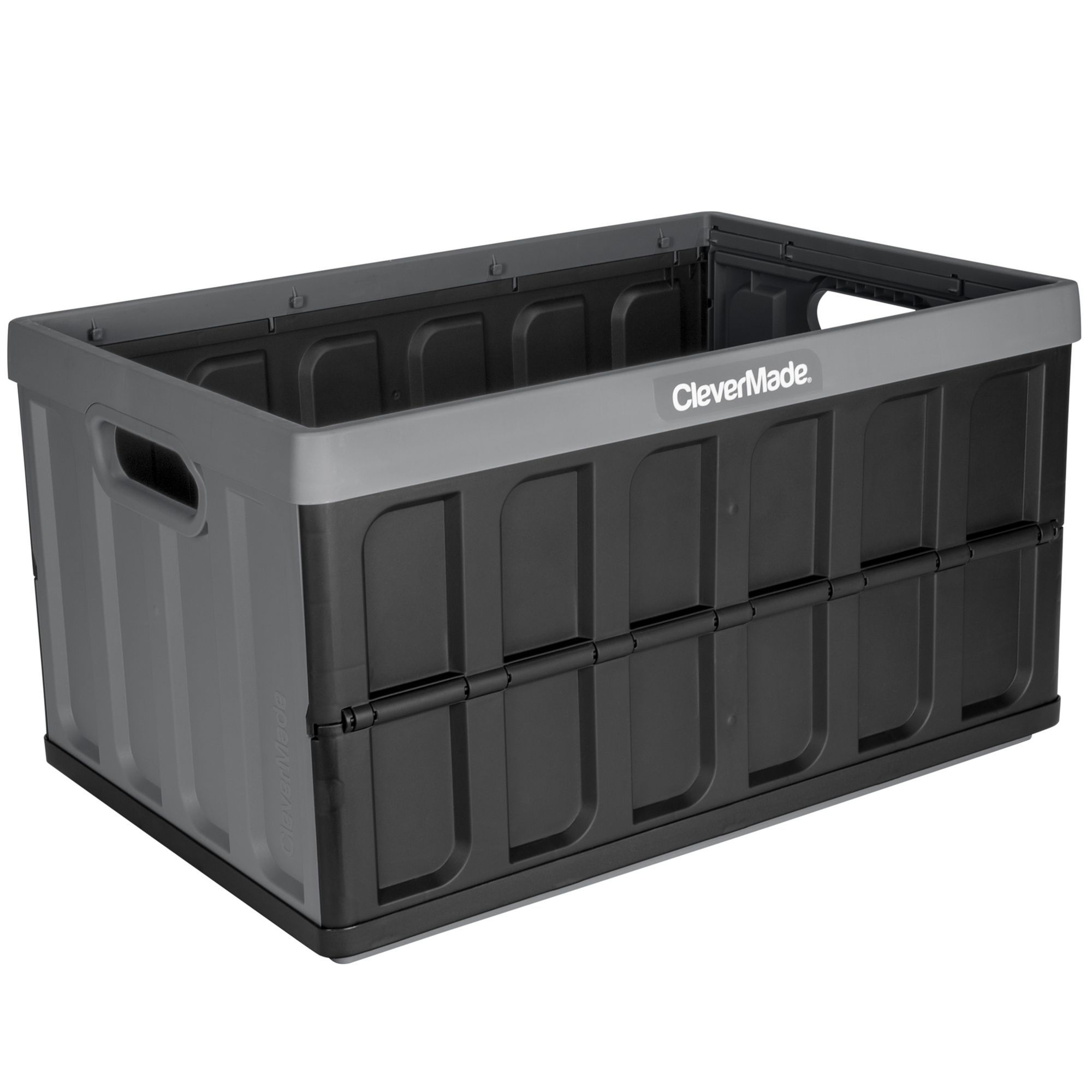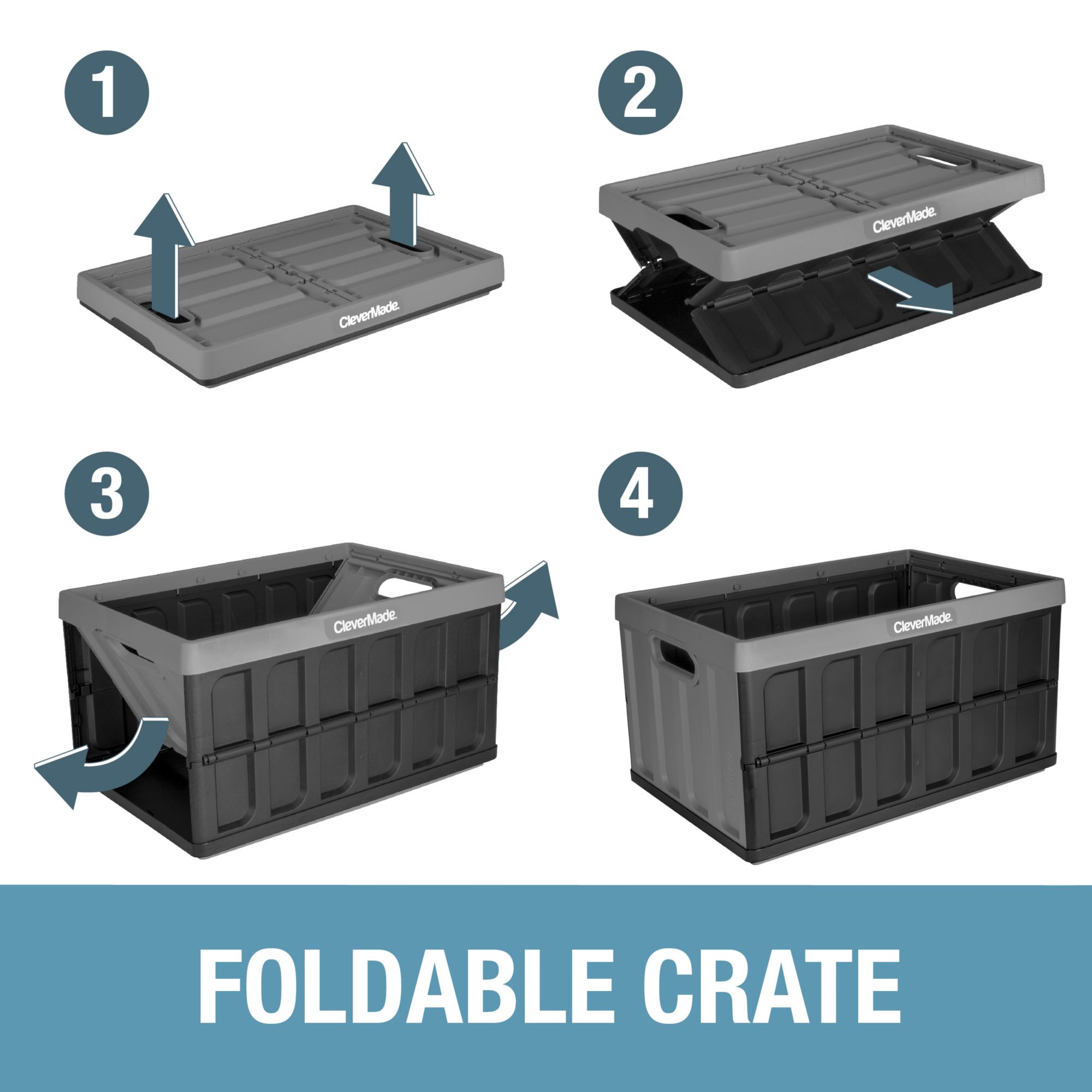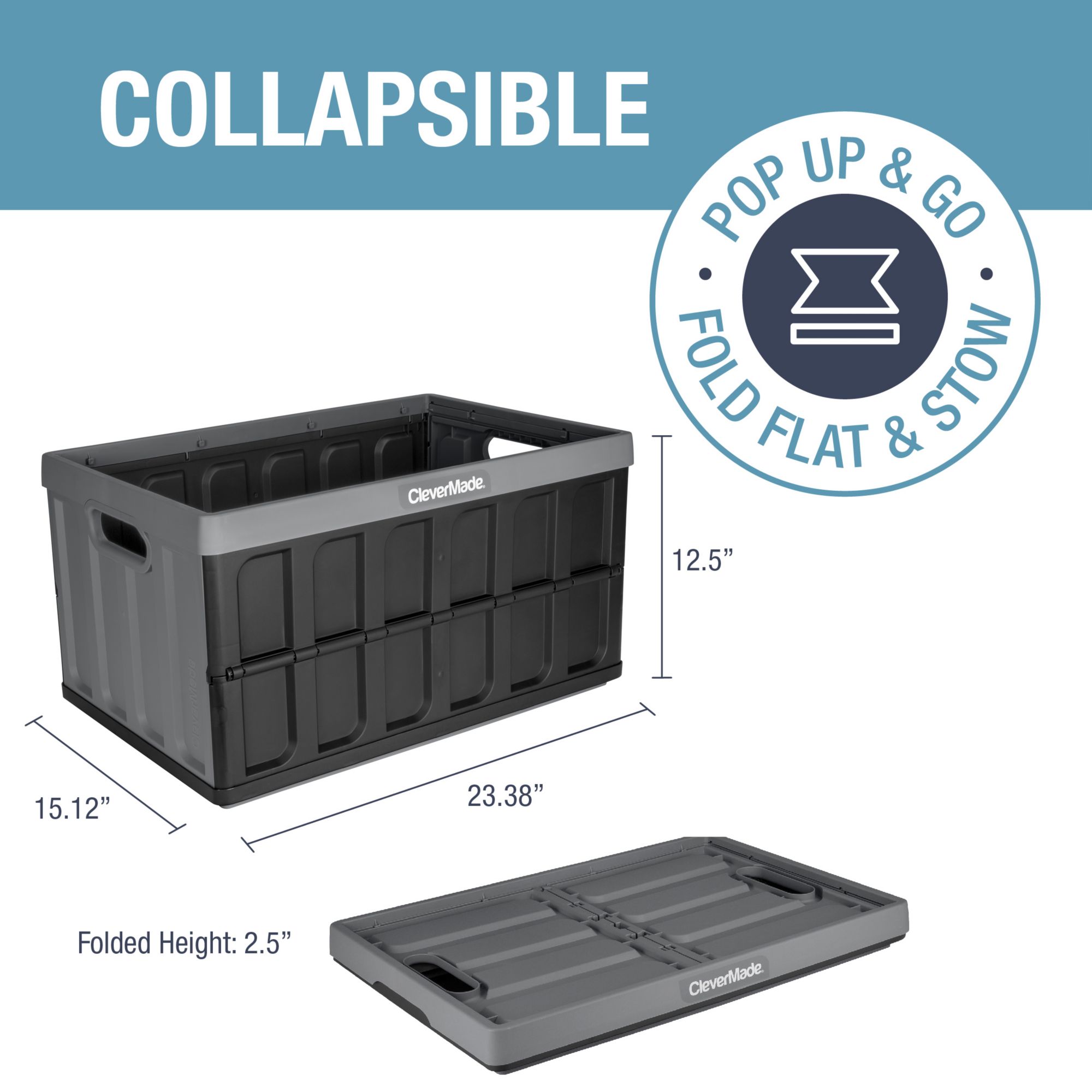 The CleverMade collapsible and stackable plastic storage crate with a lid is a smart, space-saving solution to simplify all of your activities, trips, and day-to-day tasks. Pop 'em open when you need them, fold 'em flat when you don't. Clevercrates combines packing, transport, and storage into one reusable, collapsible container. This brand new model includes a slimmer profile, revamped aesthetics, ergonomic handles, and a lid that can be locked on the base or secured to the top of the crate when not in use. These all-purpose utility crates can also increase the ease and efficiency of daily tasks and storage, both indoors and out. Try them out for wholesale club shopping, grocery runs, storing sporting equipment, arts and crafts, gardening, and home improvement projects. Measuring 23.5"L x 15.3"W x 12.5"H when open, it holds 62L (65 qt.) by volume, with a maximum load capacity of 100 lbs. It features a sturdy bottom base with solid walls, making them ideal for heavy-duty projects. Comfortable, ergonomic side grip handles make heavy lifting a breeze. The interlocking Nesting system provides stability for vertical stacking. When not in use, it collapses down to 2.25" H for compact storage and weighs 4.7 lbs. Clevercrates are made of recyclable materials, offering a sustainable alternative to plastic and paper bags, totes, and boxes. Clevercrates are easy to clean, simply hose off or wipe down with a wet cloth.