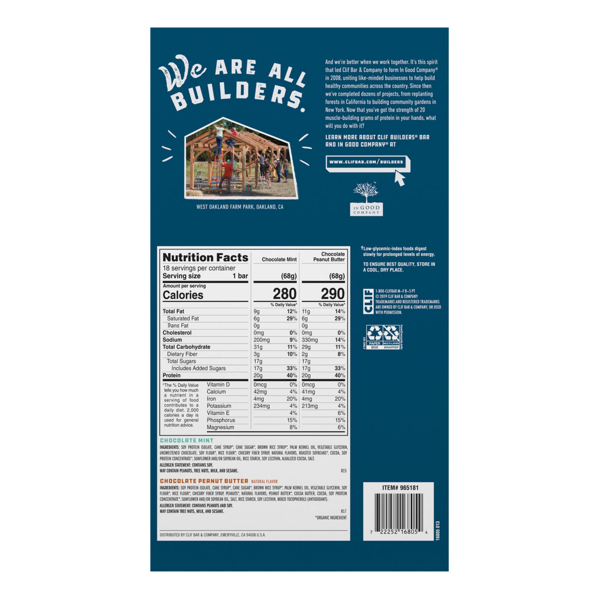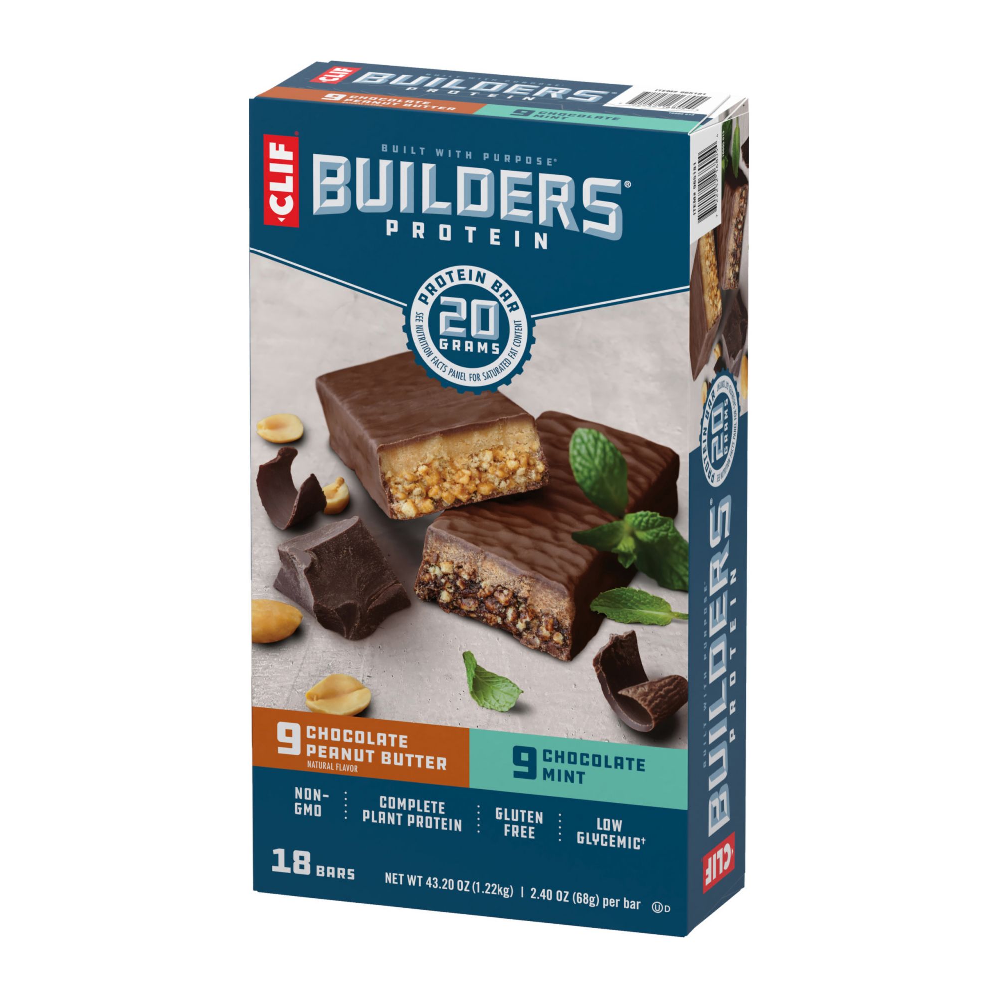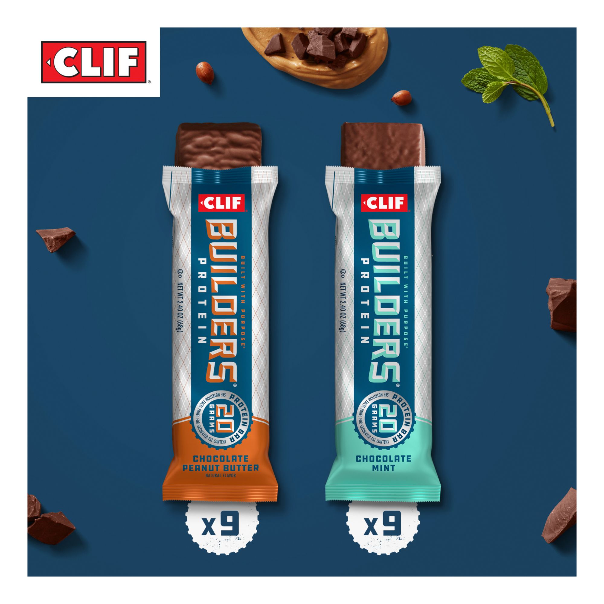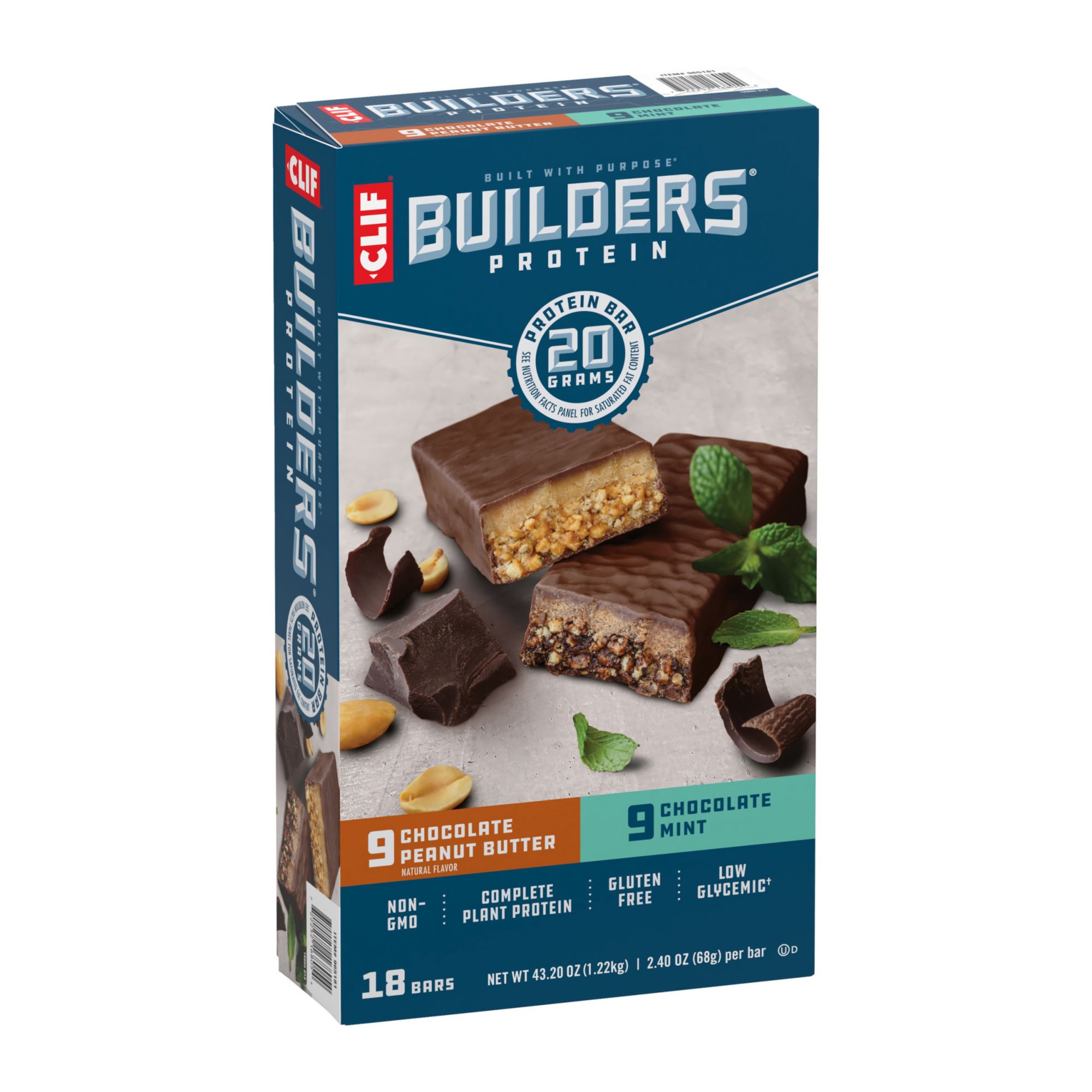 Includes 18 Clif Builders bars in Chocolate Peanut Butter and Chocolate Mint flavor (packaging may vary)