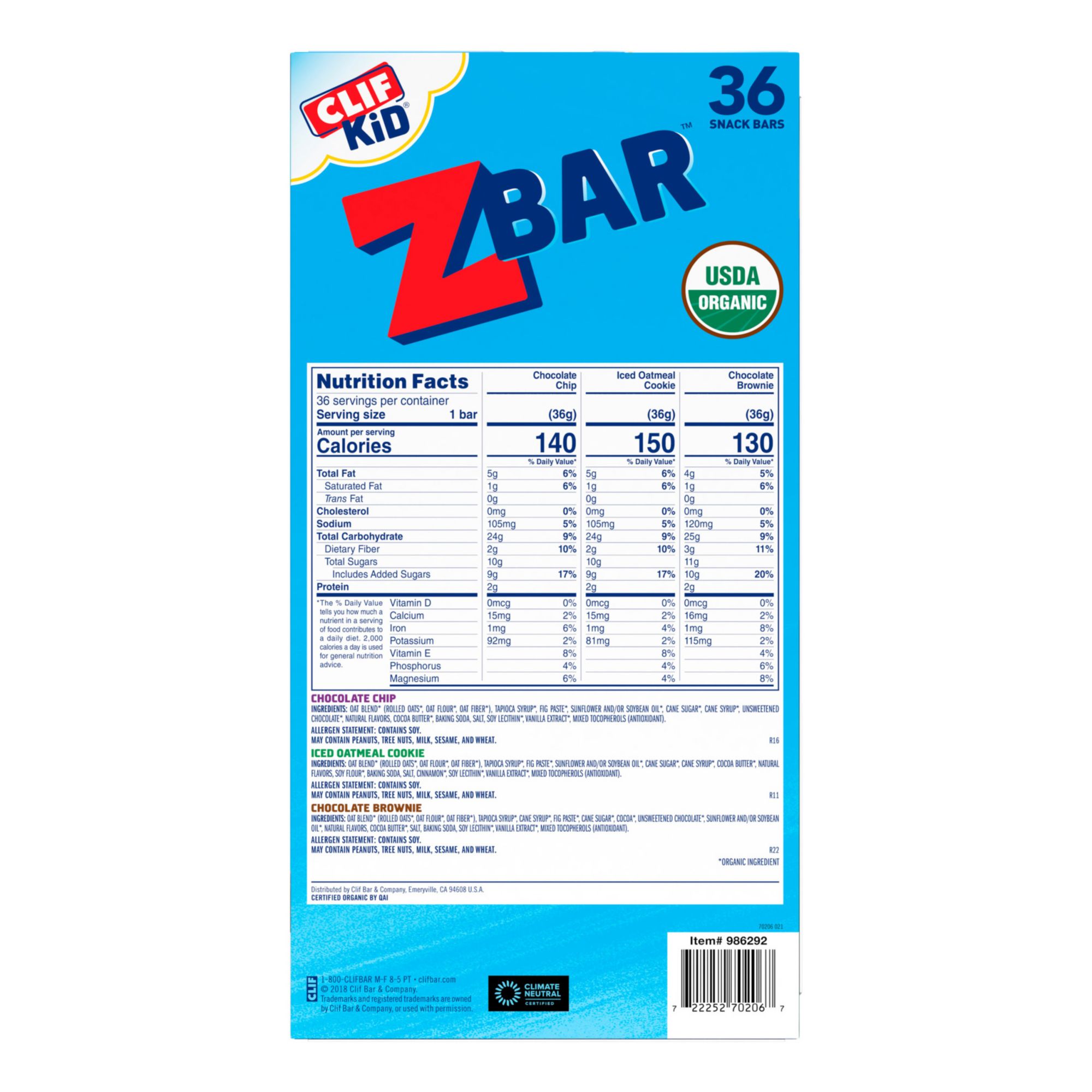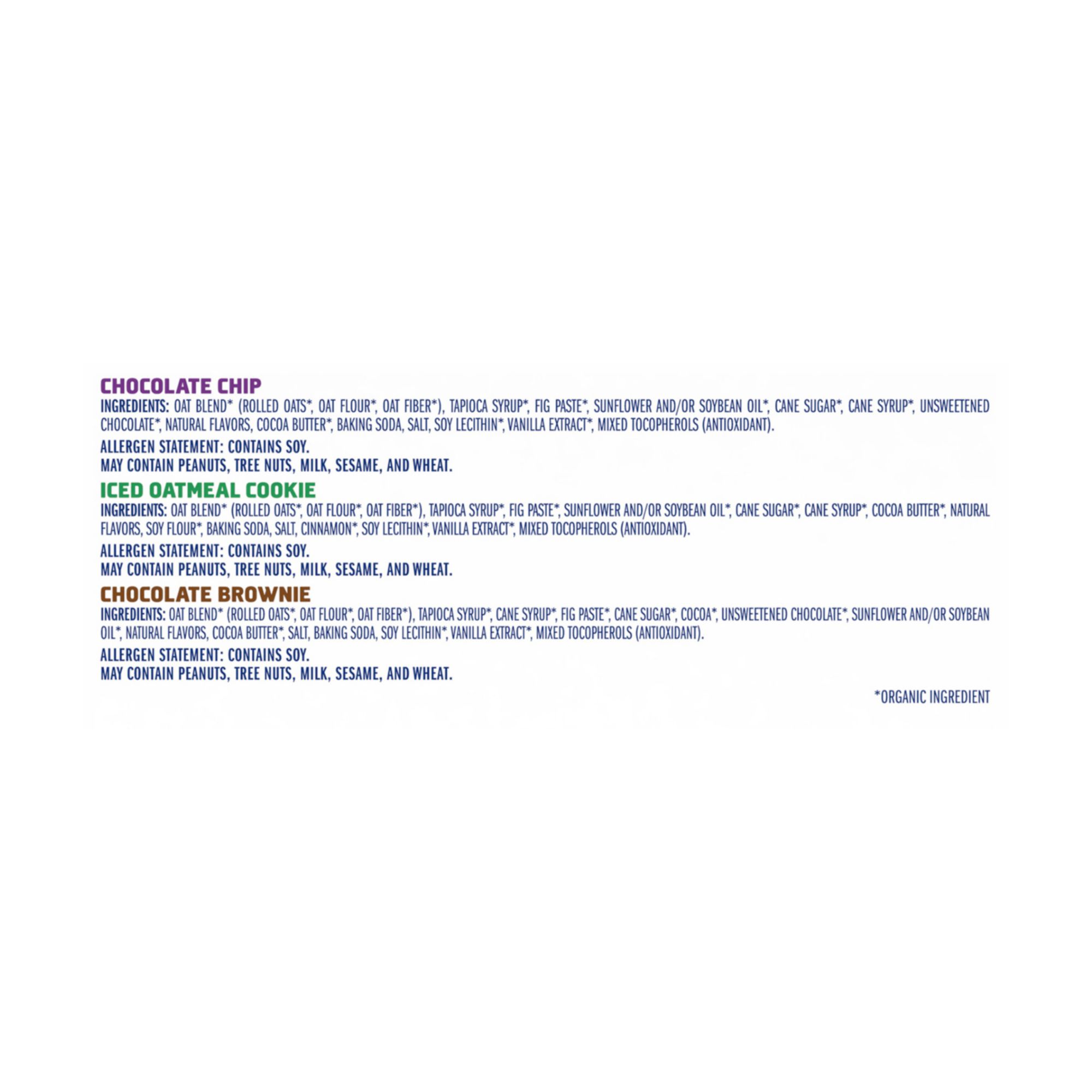 Ingredients: Zbar Chocolate Chip Ingredients: Organic Oat Blend (Organic Rolled Oats, Organic Oat Flour, Organic Oat Fiber), Organic Tapioca Syrup, Organic Fig Paste, Organic High Oleic Sunflower Oil, Organic Cane Sugar, Organic Invert Cane Syrup, Organic Unsweetened Chocolate, Organic Cocoa Butter, Salt, Baking Soda, Molasses, Cane Sugar, Natural Flavor, Organic Soy Lecithin, Honey, Organic Vanilla Extract. Contains: Soy. May Contain: Milk, Peanut, Sesame, Tree Nuts, Wheat. Zbar Iced Oatmeal Ingredients: Organic Oat Blend (Organic Rolled Oats, Organic Oat Flour, Organic Oat Fiber), Organic Tapioca Syrup, Organic Fig Paste, Organic High Oleic Sunflower Oil, Organic Cane Sugar, Organic Invert Cane Syrup, Organic Cocoa Butter, Organic Soy Flour, Salt, Baking Soda, Organic Cinnamon, Natural Flavor, Organic Vanilla Extract, Organic Soy Lecithin, Molasses. Contains: Soy. May Contain: Milk, Peanut, Sesame, Tree Nuts, Wheat. Zbar Chocolate Brownie Ingredients: Organic Oat Blend (Organic Rolled Oats, Organic Oat Flour, Organic Oat Fiber), Organic Tapioca Syrup, Organic Invert Cane Syrup, Organic Fig Paste, Organic Cane Sugar, Organic Cocoa, Organic Unsweetened Chocolate, Organic High Oleic Sunflower Oil, Organic Cocoa Butter, Salt, Natural Flavor, Baking Soda, Organic Soy Lecithin, Organic Vanilla Extract. Contains: Soy. May Contain: Milk, Peanut, Sesame, Tree Nuts, Wheat.