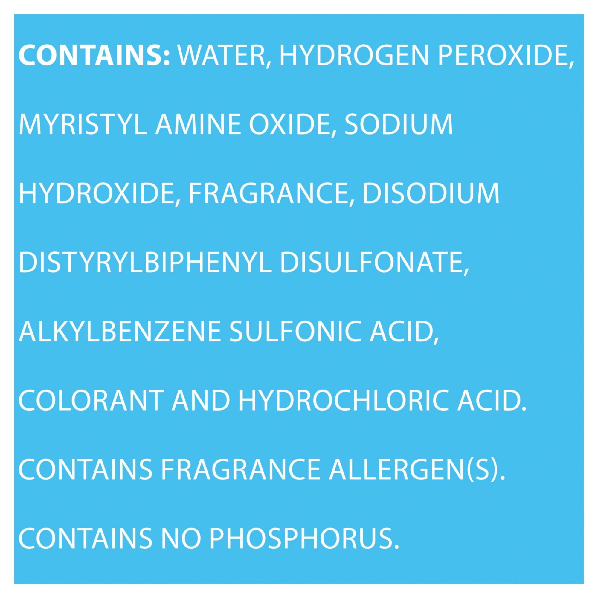 Ingredients: Water, hydrogen peroxide, myristamine oxide, fragrance, sodium C10-16 Alkylbenzensulfonate, disodium distyrylbiphenyl disulfonate, colorant and sodium hydroxide.