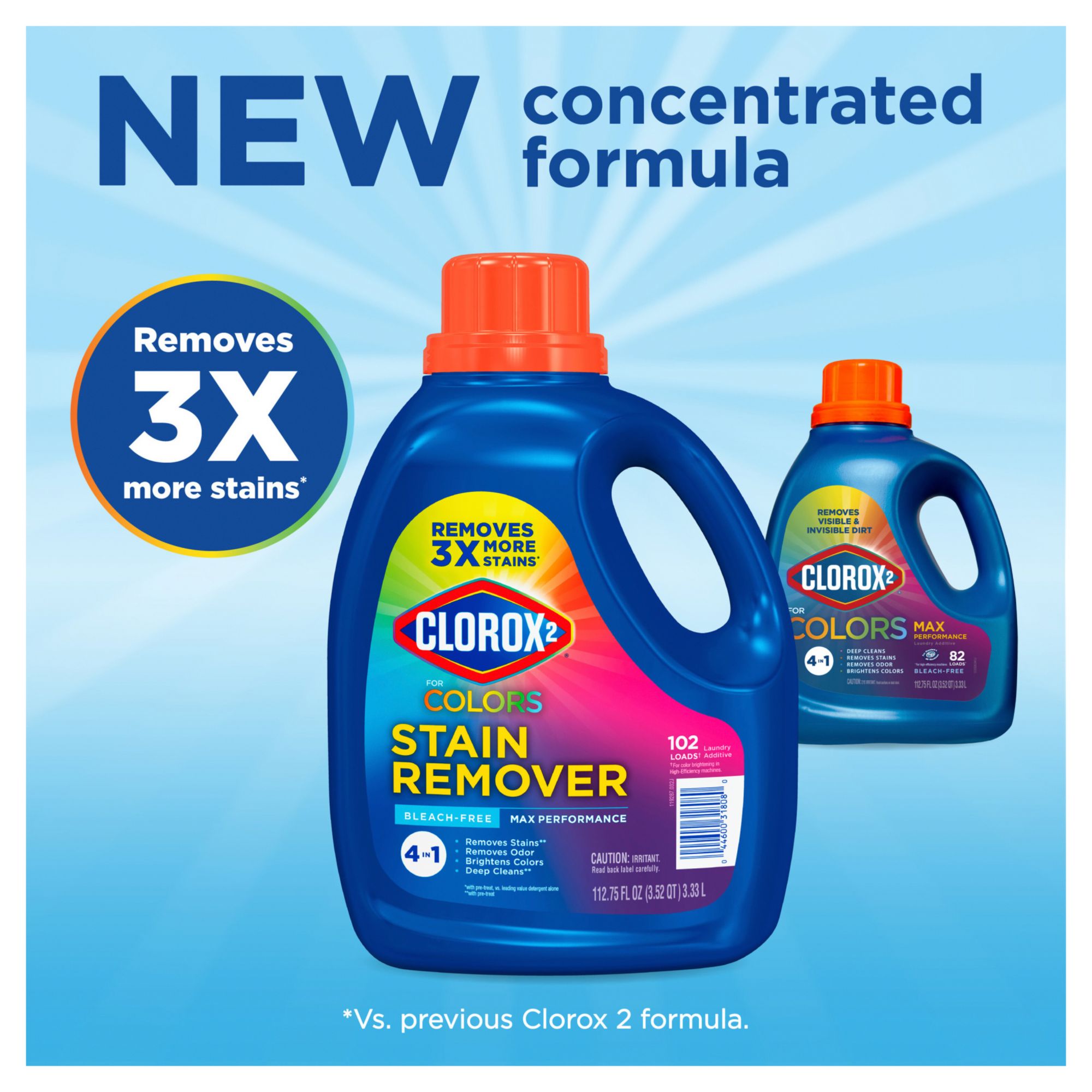 POWERFUL STAIN REMOVER: Clorox 2 for Colors Max Performance attacks your toughest stains including food, grass, blood, set in stains and more* FAST ACTION: Clorox 2 for Colors Max Performance activates on stains instantly* REMOVES 3X MORE STAINS: Clorox 2 for Colors Max Performance removes 3X more 4 IN 1 LAUNDRY ADDITIVE: Clorox 2 for Colors removes stains*, removes odor, brightens colors and deep cleans* BLEACH FREE: Clorox 2 for Colors Max Performance Stain Remover Laundry Additive is bleach free and safe for use on both colors and whites** Includes 112.75 fl oz bottle