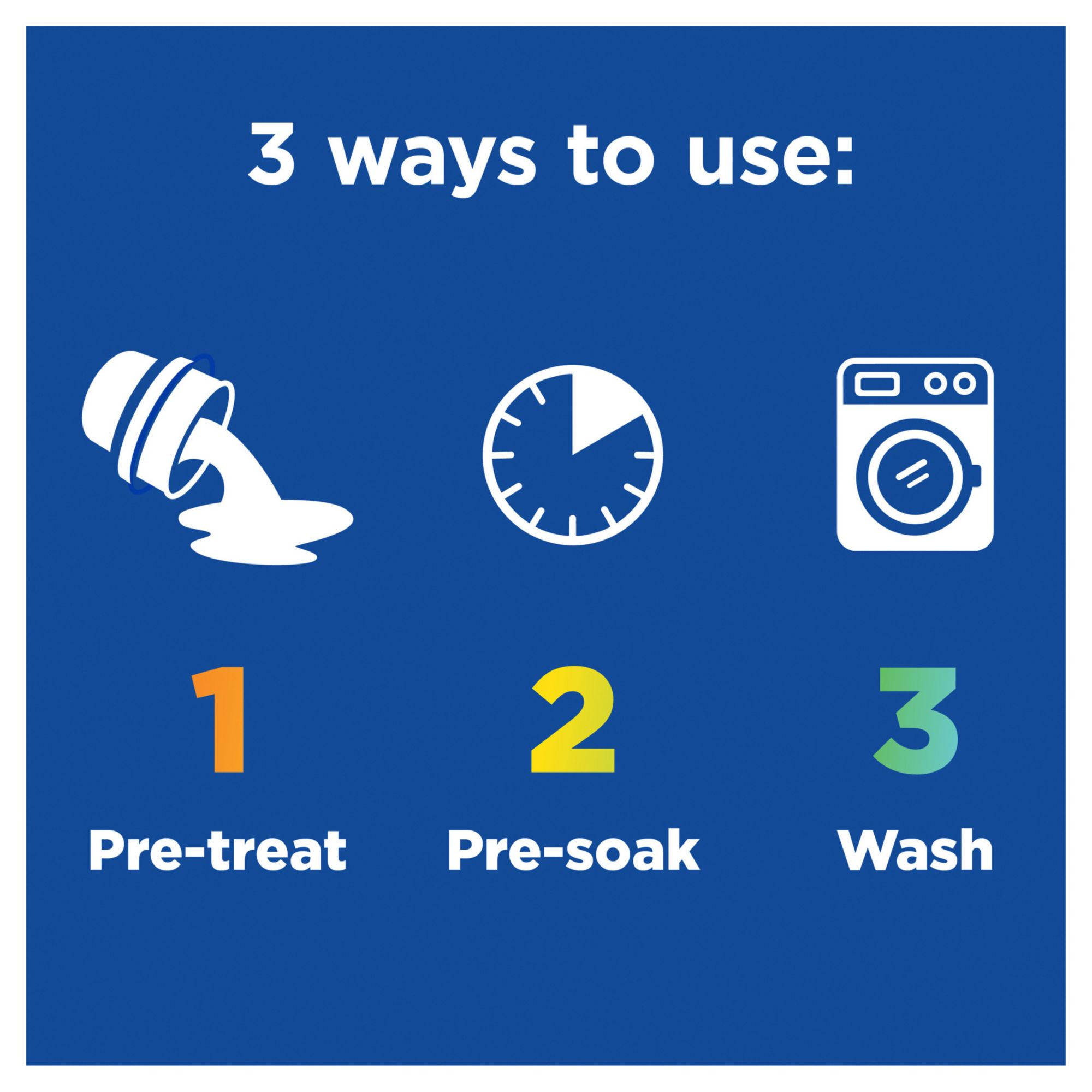 Upgrade your wash with Clorox 2 for Colors Max Performance Stain Remover and Laundry Additive. It attacks your toughest stains, including food, blood, grass, set-in stains and more*. This fast and powerful stain remover activates instantly* and even removes 3X more stains vs. the leading value detergent alone*. The 4 in 1 formula not only removes stains* but also removes odors, brightens colors and whites and deep cleans*. Clorox 2 for Colors is a bleach-free formula that is safe for use on fabrics and colors**. Tough on stains and gentle on clothes, this versatile formula offers 3 ways to use: pretreat to remove small stains and odor, presoak to remove large stains and odor or add directly to the wash to brighten whites and colors and remove odor. Safe for use in standard and HE washers. Win the battle against stains and odor with Clorox 2 for Colors Max Performance Stain Remover and Laundry Additive.