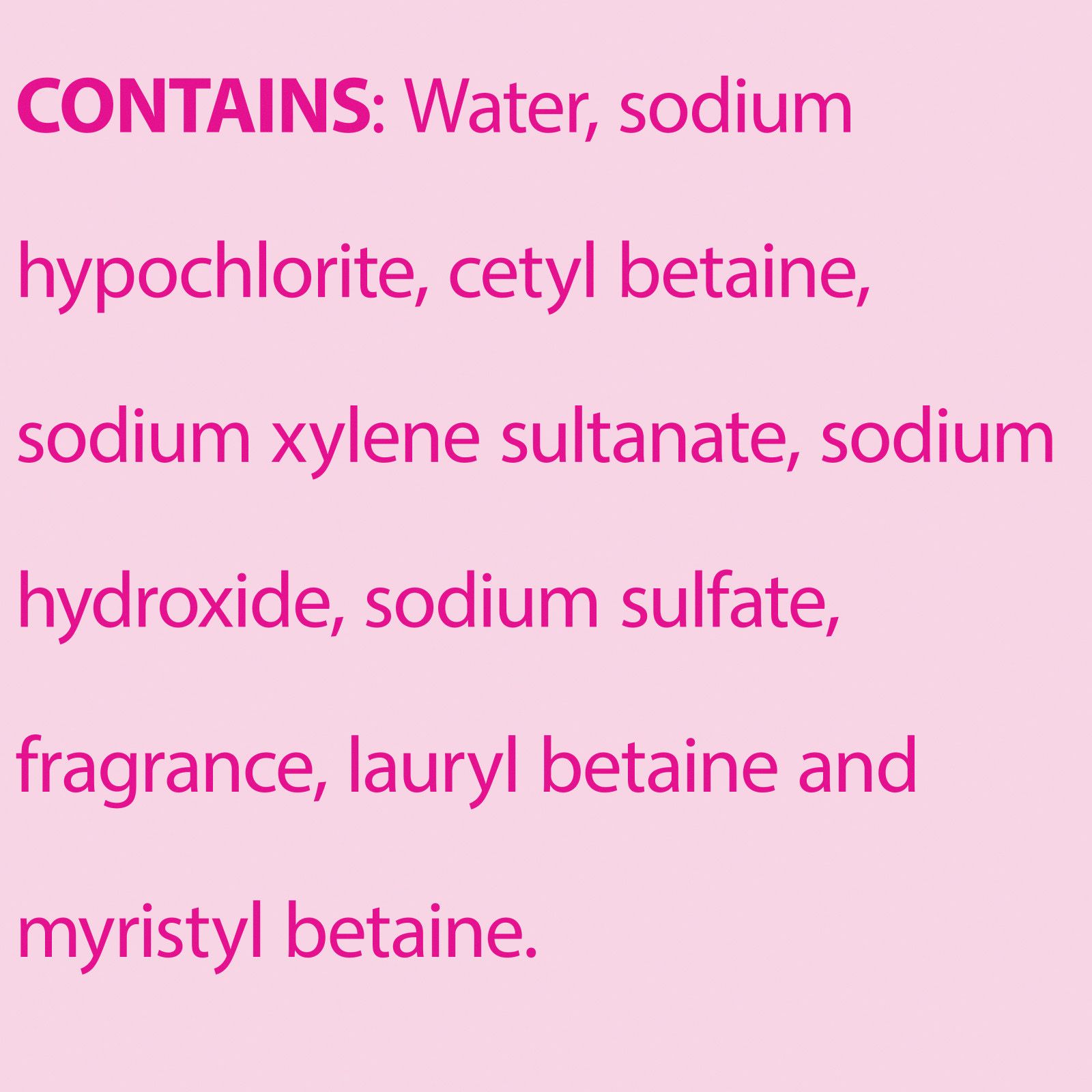 Ingredients: Water, sodium hypochlorite, sodium hydroxide, sodium carbonate, poly (diallyldimethylammonium chloride), fragrance, sodium xylene sulfonate and sodium polyacrylate. Contains no phosphorus.