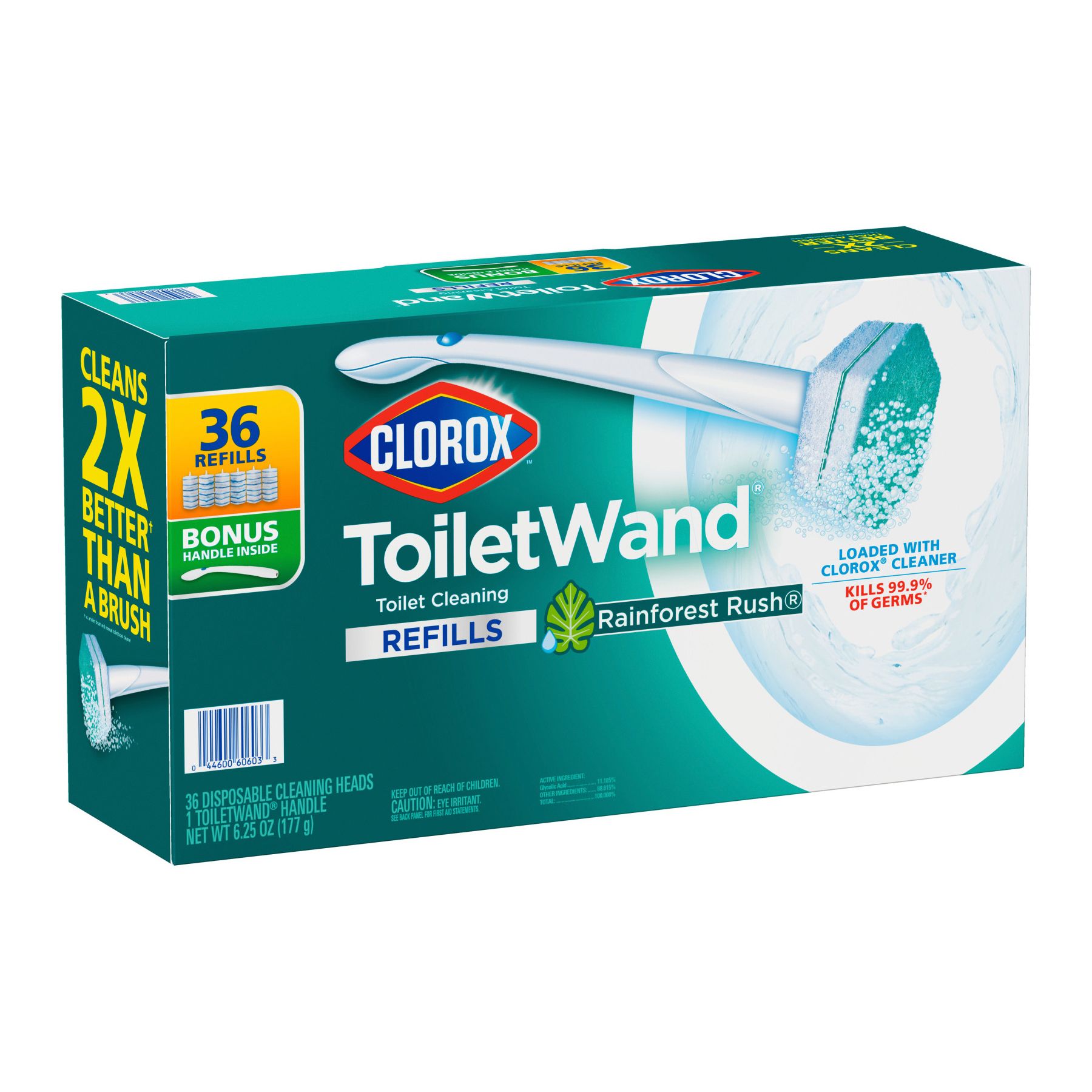 Clorox ToiletWand is an easy-to-use, all-in-one system that makes the dreaded toilet cleaning experience a breeze. The all in one system contains 1 wand with a long handle to help you clean from a distance and 36 disposable scrubbing pads preloaded with cleaner. Each disposable scrubbing pad is preloaded with Clorox Cleaner that kills 99.9% of germs*. Scrubbing pads power through hard water and lime stains 2X faster than when using a toilet brush with manual toilet bowl cleaner. Designed for optimal reach, hexagonal-shaped scrubbing pads conform to hard-to- reach areas like under the rim – no more bending and stretching. The Rainforest Rush scent neutralizes odors without the bleach smell. Use this non-abrasive formula to sanitize a variety of surfaces, including porcelain, chrome, enamel and synthetic marble. Never touch an icky toilet brush again - disposable scrubbing pads conveniently pop off into the trash so you can toss the mess every time. .