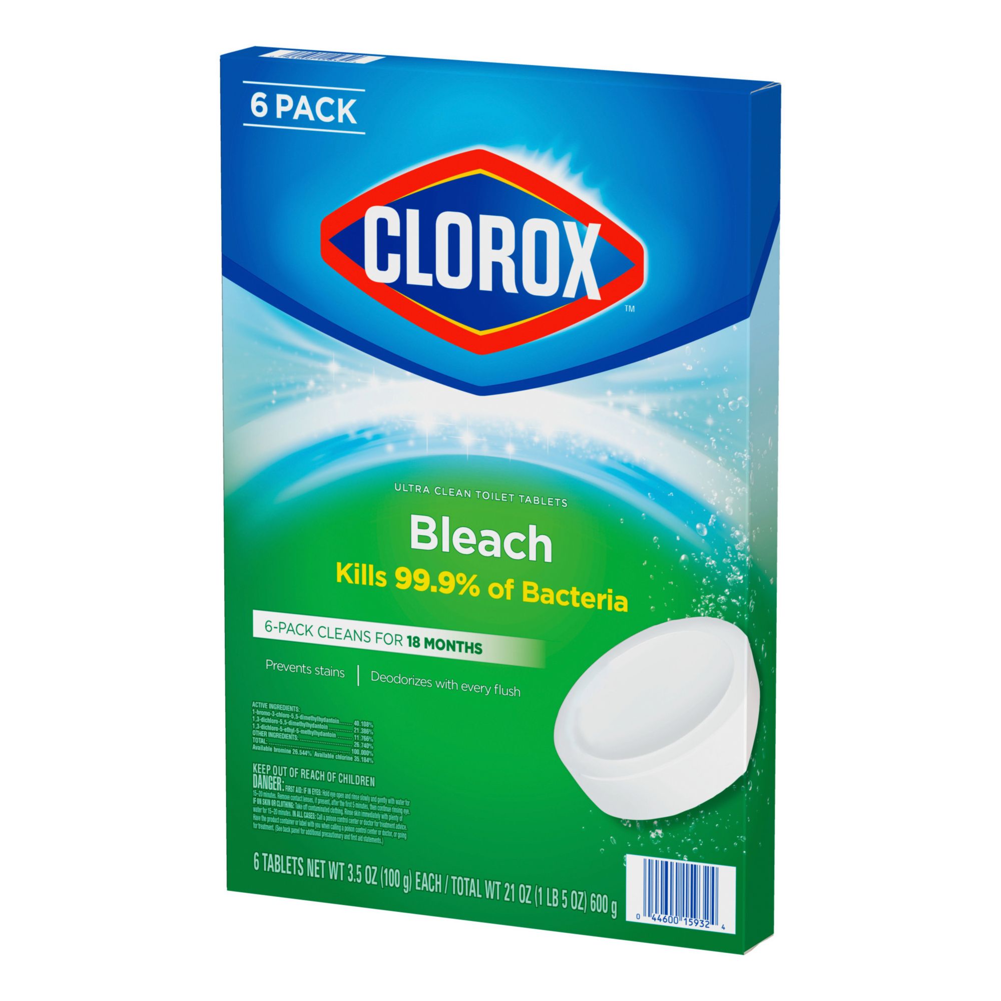 Ultra Clean Toilet Bowl Tablets: Kills 99.9% of bacteria, and continuously sanitizes, cleans and deodorizes your toilet bowl with each flush Bleach Toilet Bowl Cleaner: Toilet bowl cleaning tablet cleans your toilet and leaves your bowl sparkling fresh and clean for up to 3 months Prevent Stains: Dissolvable cleaning tablets help prevent tough stains and removes hard water, mineral deposits and limescale stains, with the power of Clorox bleach Deodorizes: Each tablet sanitizes the toilet bowl water in 5 minutes for 6 weeks to keep your toilet smelling fresh and sparkling clean with every flush Easy to use Cleaning Tablets: Simply drop tablet into tank for an ultra bleach clean that keeps the dreaded toilet ring away and helps extend the time between deep cleans Includes Clorox Ultra Clean Bleach Toilet Tablets, 6 ct./3.5 oz. each