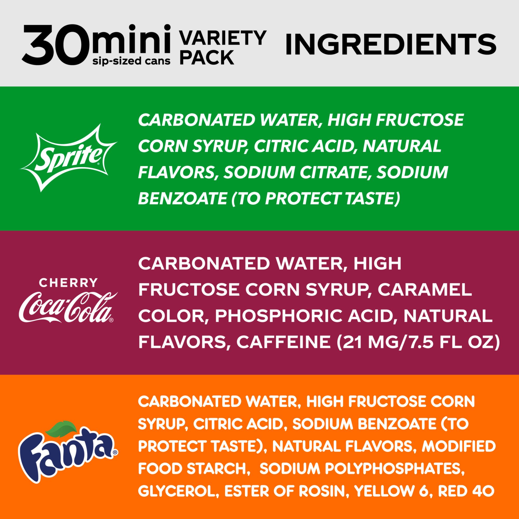 Ingredients: Cherry Coke-Carbonated Water, High Fructose Corn Syrup, Caramel Color, Phosphoric Acid, Natural Flavors, Caffeine, Sprite-Carbonated Water, High Fructose Corn Syrup, Citric Acid, Natural Flavors, Sodium Citrate, Sodium Benzoate (To Protect Taste). Fanta Orange-Carbonated Water, High Fructose Corn Syrup, Citric Acid, Sodium Benzoate (To Protect Taste), Natural Flavors, Modified Food Starch, Sodium Polyphosphates, Glycerol Ester Of Rosin, Yellow 6, Red 40
