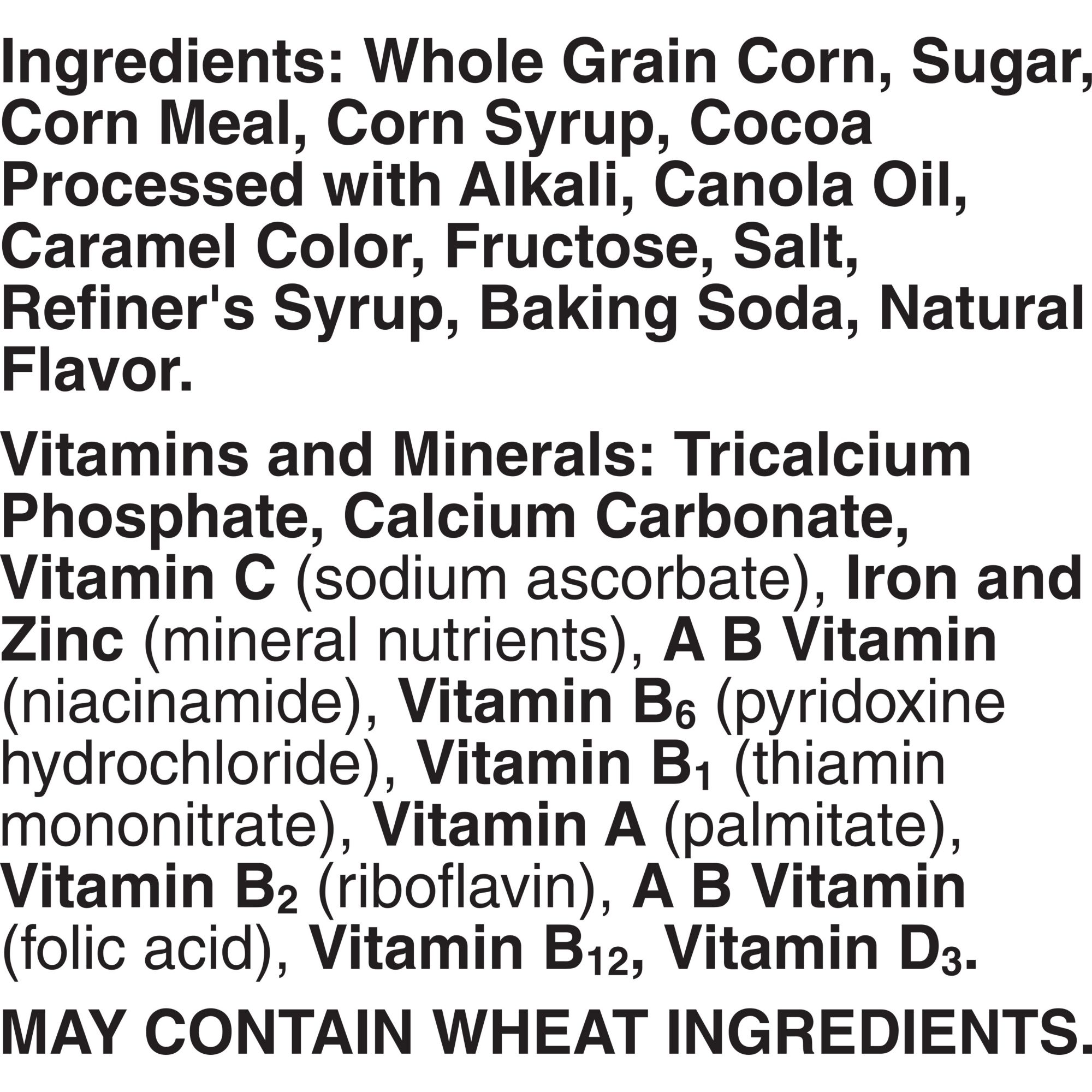 Whole Grain Corn, Sugar, Corn Meal, Corn Syrup, Cocoa Processed with Alkali, Canola Oil, Fructose, Salt, Caramel Color, Refiner's Syrup, Baking Soda, Natural Flavor.