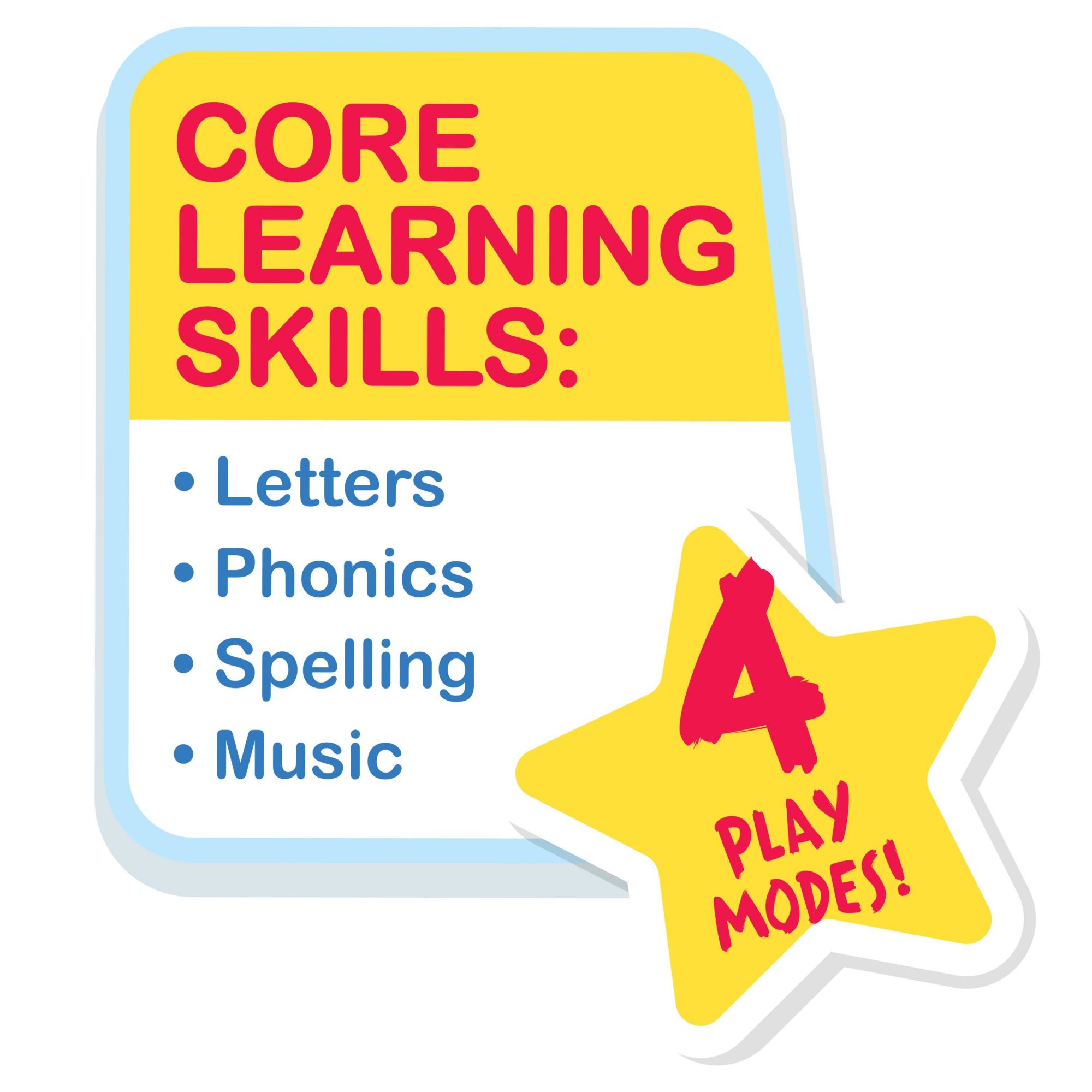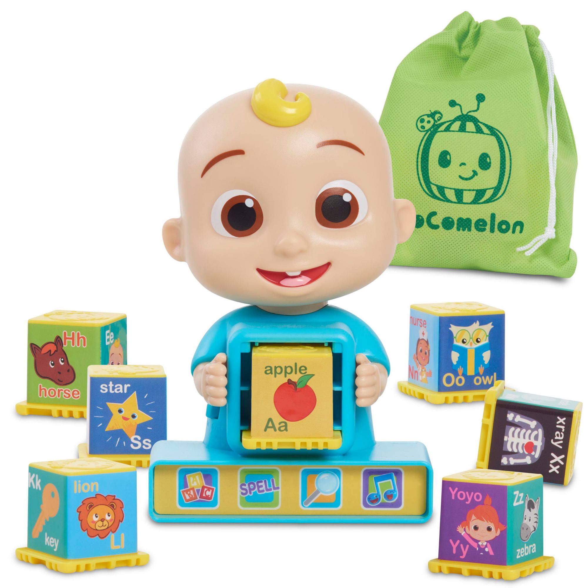 Join JJ on a learning adventure with the CoComelon JJ Phonics Fun interactive toy. Featuring phrases, music, and colorful letter blocks, it's an exciting way for toddlers to practice phonics, spelling, and letter recognition with CoComelon's JJ. Choose one of 4 play modes, insert a letter block, and let the learning fun begin. Press the ABC button to learn about a letter and practice pronunciation. Choose "Spell" to learn how to spell a word that begins with that letter. Select the magnifying glass button to play a game that encourages kids to find a letter and insert the correct block. Take a break from learning by pressing the music button to listen and dance to the CoComelon "Animal Dance Song." At just over 6" tall, the JJ Phonics Fun toy is the perfect size for on-the-go play, and comes with a storage bag to make travel easy.