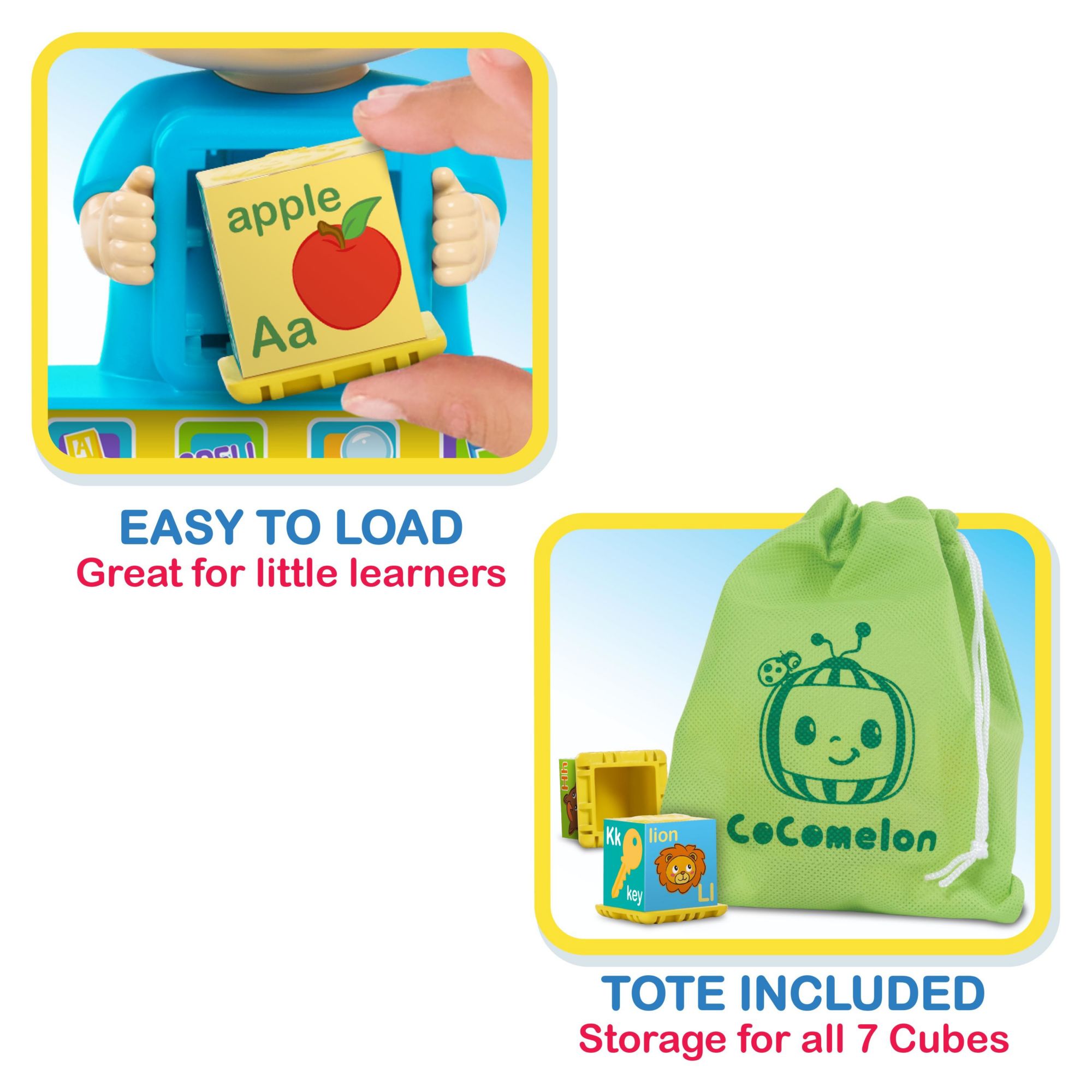 The CoComelon JJ Phonics Fun interactive toy features phrases, music, and colorful letter blocks to engage preschoolers while helping build skills Kids will love learning with JJ from the popular preschool video series Four modes of play encourage children to learn letters and phonics Insert a block to learn how to spell a word that begins with that letter Hear the "Animal Dance Song" from CoComelon Kids will love dancing and singing along It's the perfect size for taking on car rides, play dates, and family vacations Comes with a handy storage bag. The CoComelon JJ Phonics Fun learning toy makes a great gift for toddlers ages 18 months and up. Requires 2 x AAA batteries, included Includes JJ console, 7 blocks, and storage bag