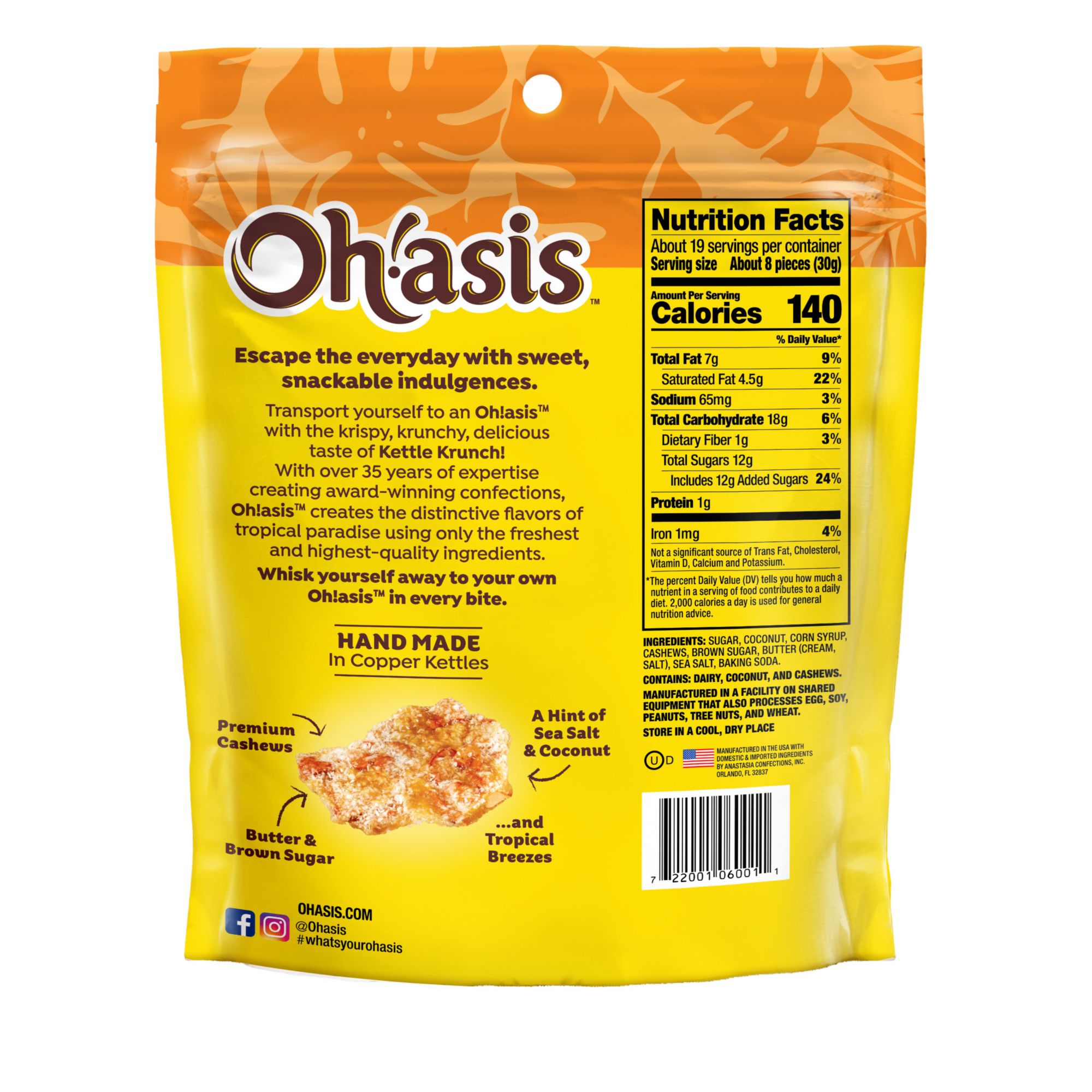 Krunchy butter and brown sugar bites with fresh cashews and a hint of sea salt and coconut. Escape the everyday with sweet, snackable indulgences. Transport yourself to an Oh!asis with the krispy, krunchy, delicious taste of Kettle Krunch! With over 35 years of expertise creating award-winning confections, Oh!asis creates the distinctive flavors of tropical paradise using only the freshest and highest-quality ingredients. Whisk yourself away to your own Oh!asis in every bite.