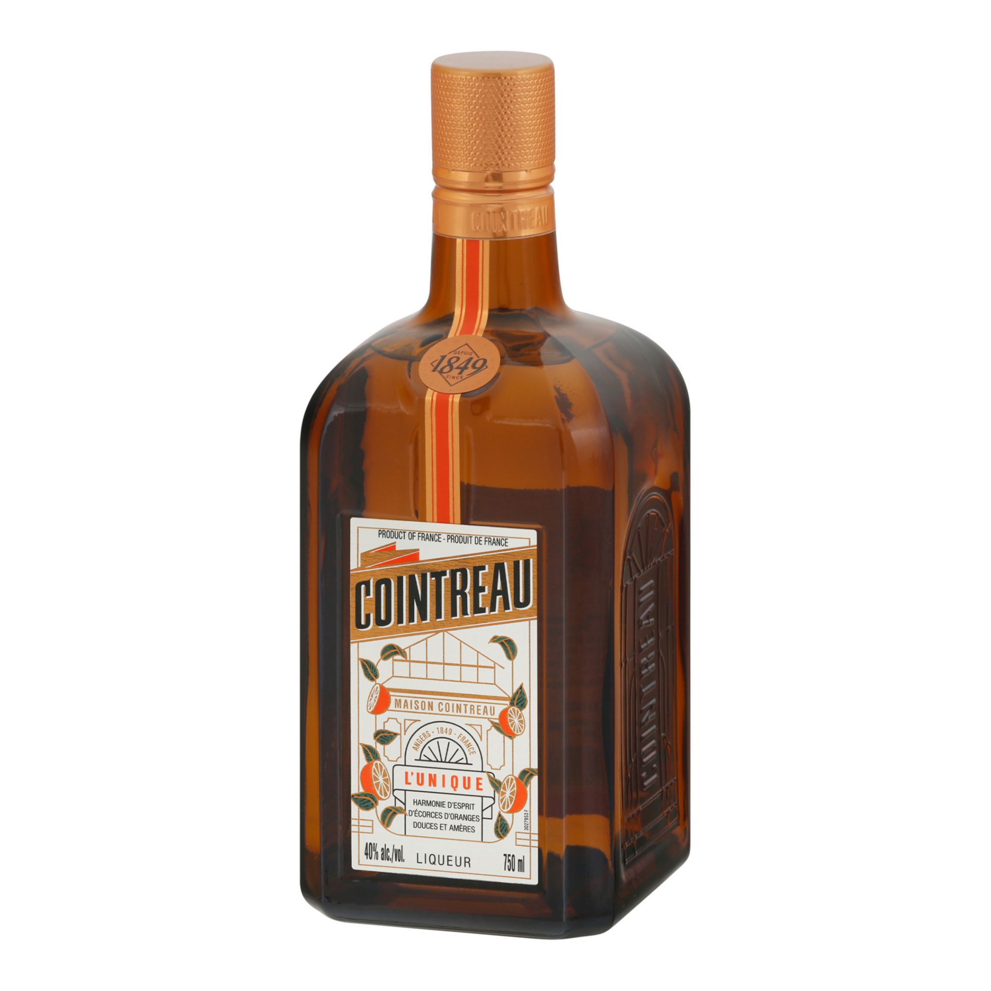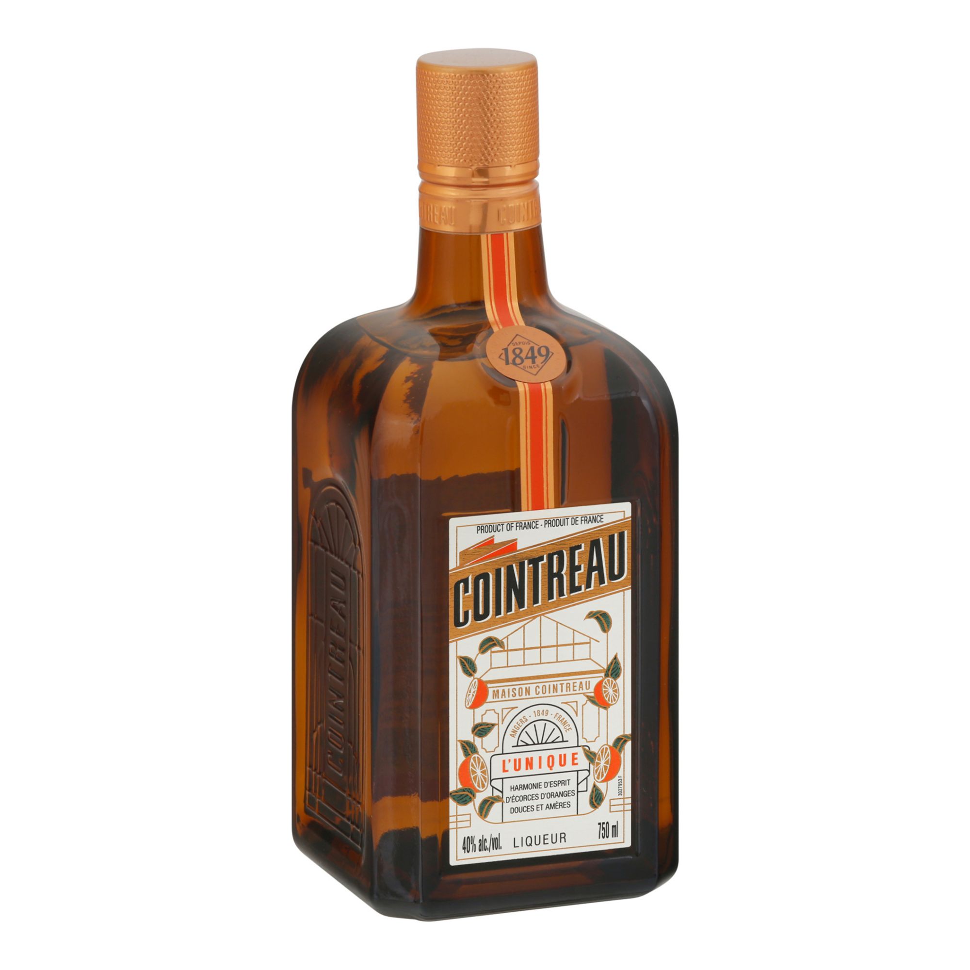 Since 1849. Angers France. Cointreau's master distiller carefully selects the finest sweet and bitter orange peels and uses traditional distillation techniques to create Cointreau, a premium crystal clear spirit. Cointreau is the most versatile bottle on your bar for cocktail creations. The Cointreau Cosmo: 0.75 oz Cointreau; 2 oz vodka; 0.25 oz cranberry juice; 0.75 oz fresh lime juice. The Original Margarita: 1 oz Cointreau; 1 oz fresh lime juice; 2 oz Blanco tequila. www.cointreau.us. Discover more cocktails on www.cointreau.us. 40% alc./vol. 80 Product of France.