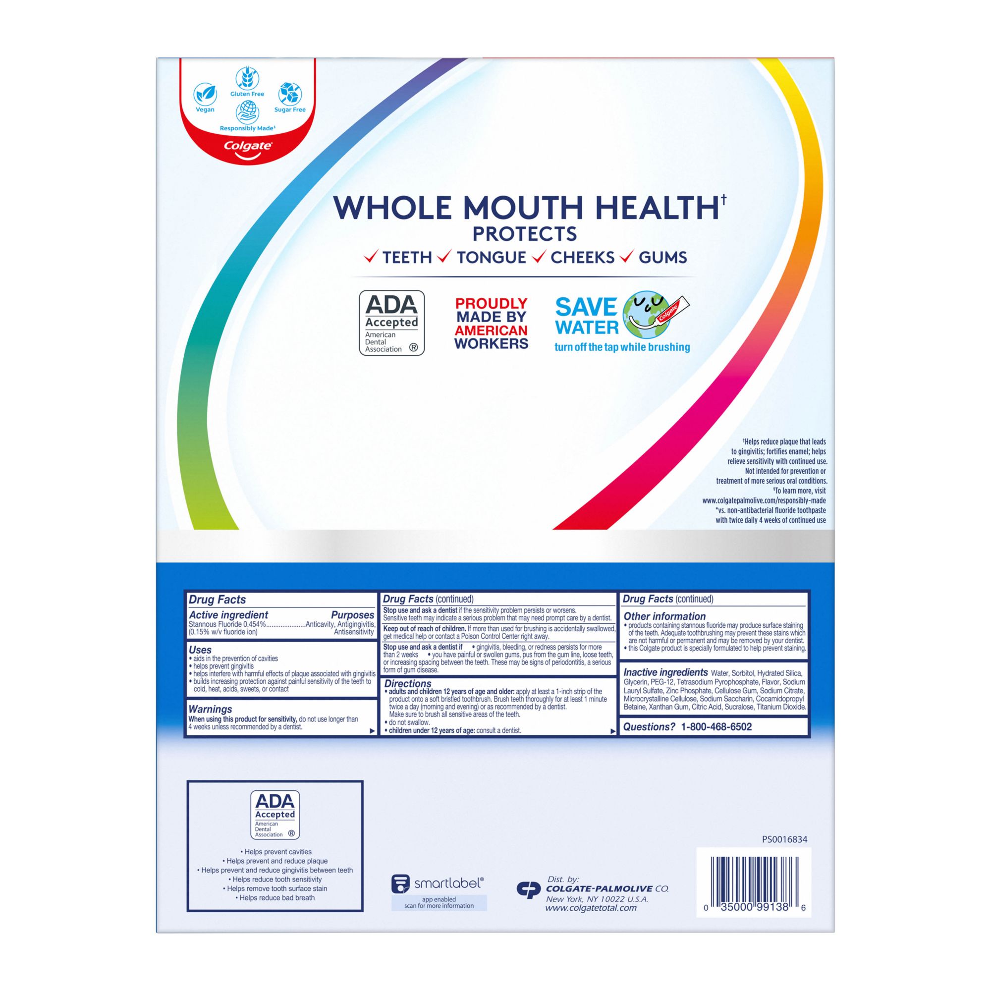 Help stop oral health problems* before they start with Colgate Total Active Prevention Whitening Toothpaste. This anticavity toothpaste pack fights bacteria, the root cause of many oral health issues such as gingivitis, tartar, sensitivity, weak enamel, stains, bad breath, and cavities. In addition, this whitening toothpaste features cutting-edge cooling technology and blends peppermint and spearmint together for an invigorating minty flavor profile. This science-backed fluoride toothpaste uses a unique, clinically-proven stannous fluoride formula to help fight plaque bacteria. Plus, this whitening mint toothpaste helps minimize bad breath and helps remove stains. Colgate Total Active Prevention Whitening Fluoride Toothpaste can help improve your oral health by tackling many oral health issues* before they begin. This Colgate Total anticavity toothpaste offers 24 hours of long-lasting antibacterial protection when brushing twice daily with 4 weeks of continued use. Feel secure knowing that Colgate Total Active Prevention Whitening Toothpaste has your whitening, cavities, gingivitis, and sensitivity prevention needs covered for a healthy and brighter smile. *such as cavities and gingivitis **vs. non-antibacterial fluoride toothpaste with 3 months continued use