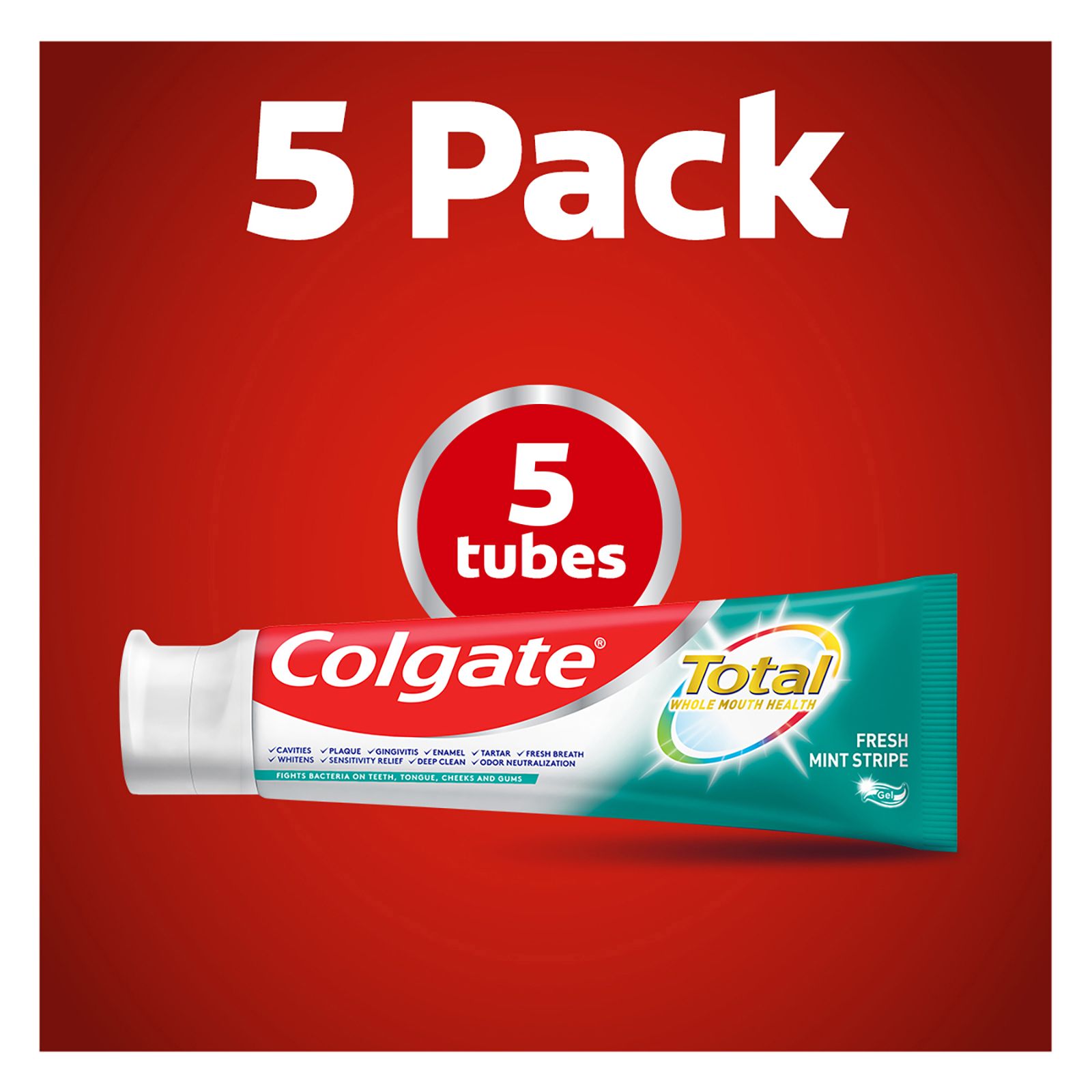 Includes five 6 oz. tubes of Colgate Total Stripe toothpaste, Fresh Mint
