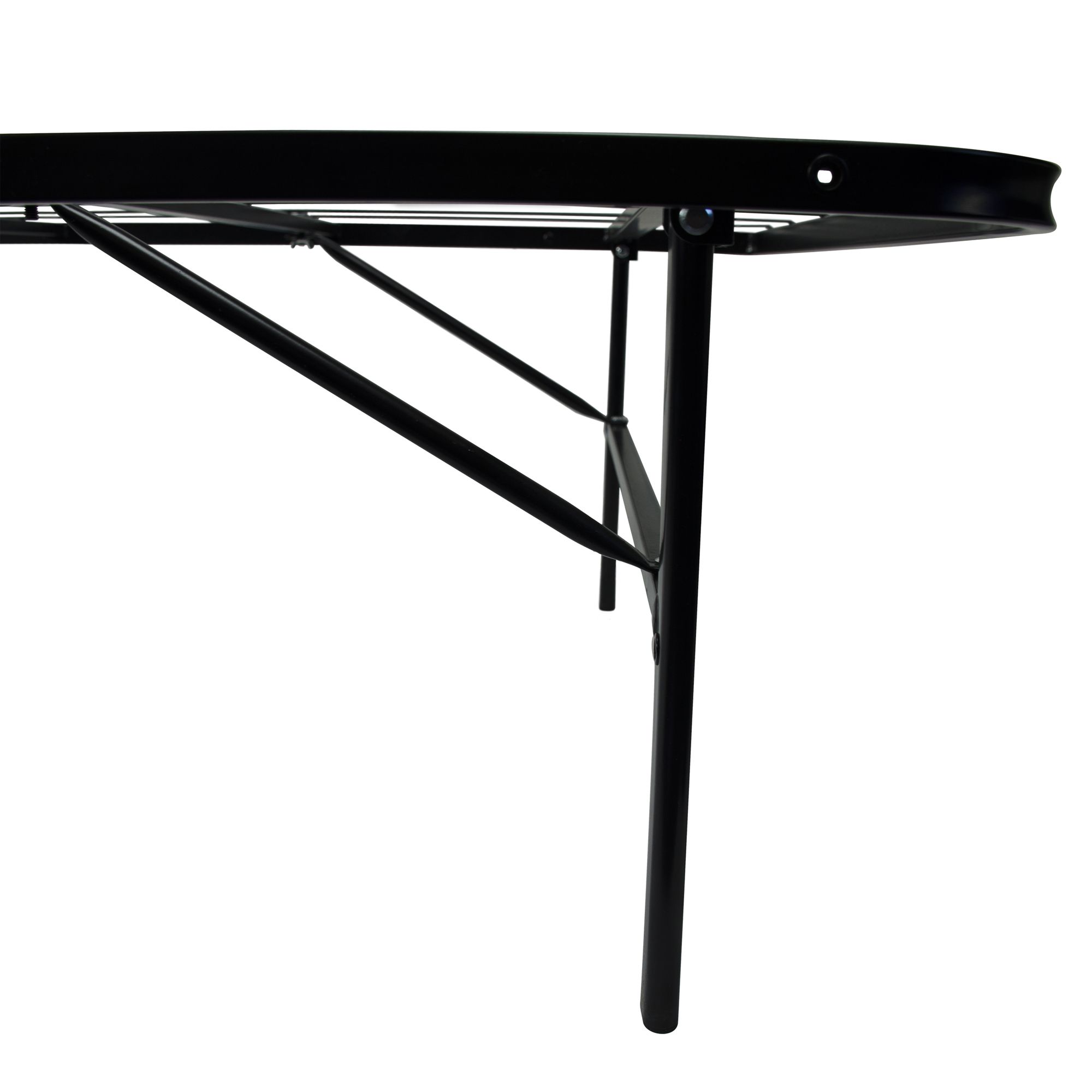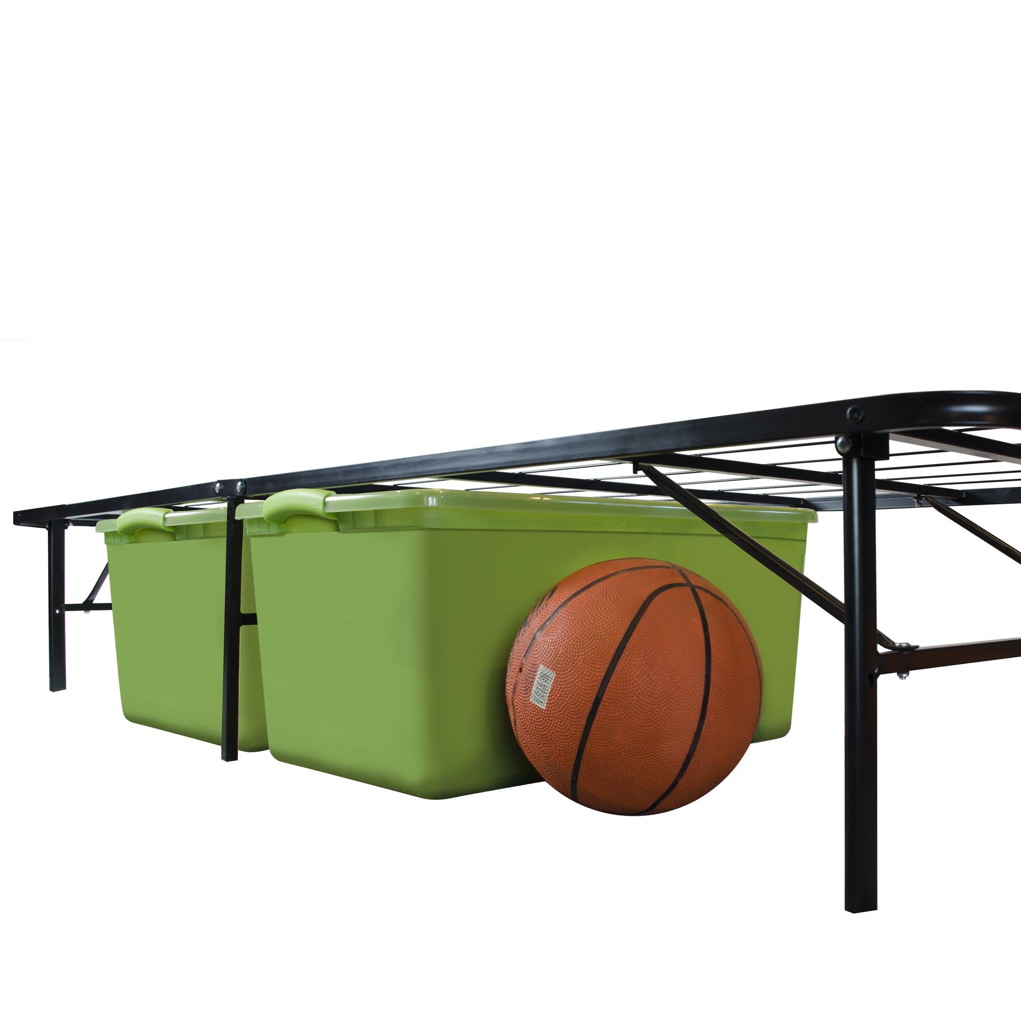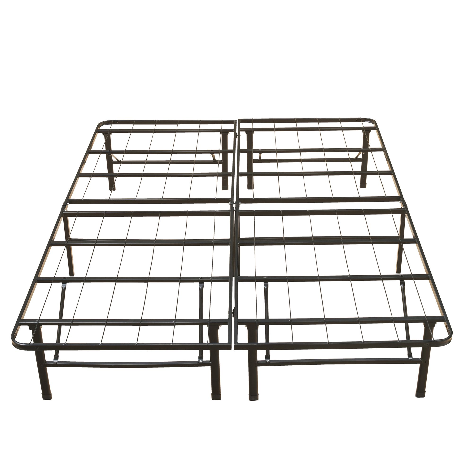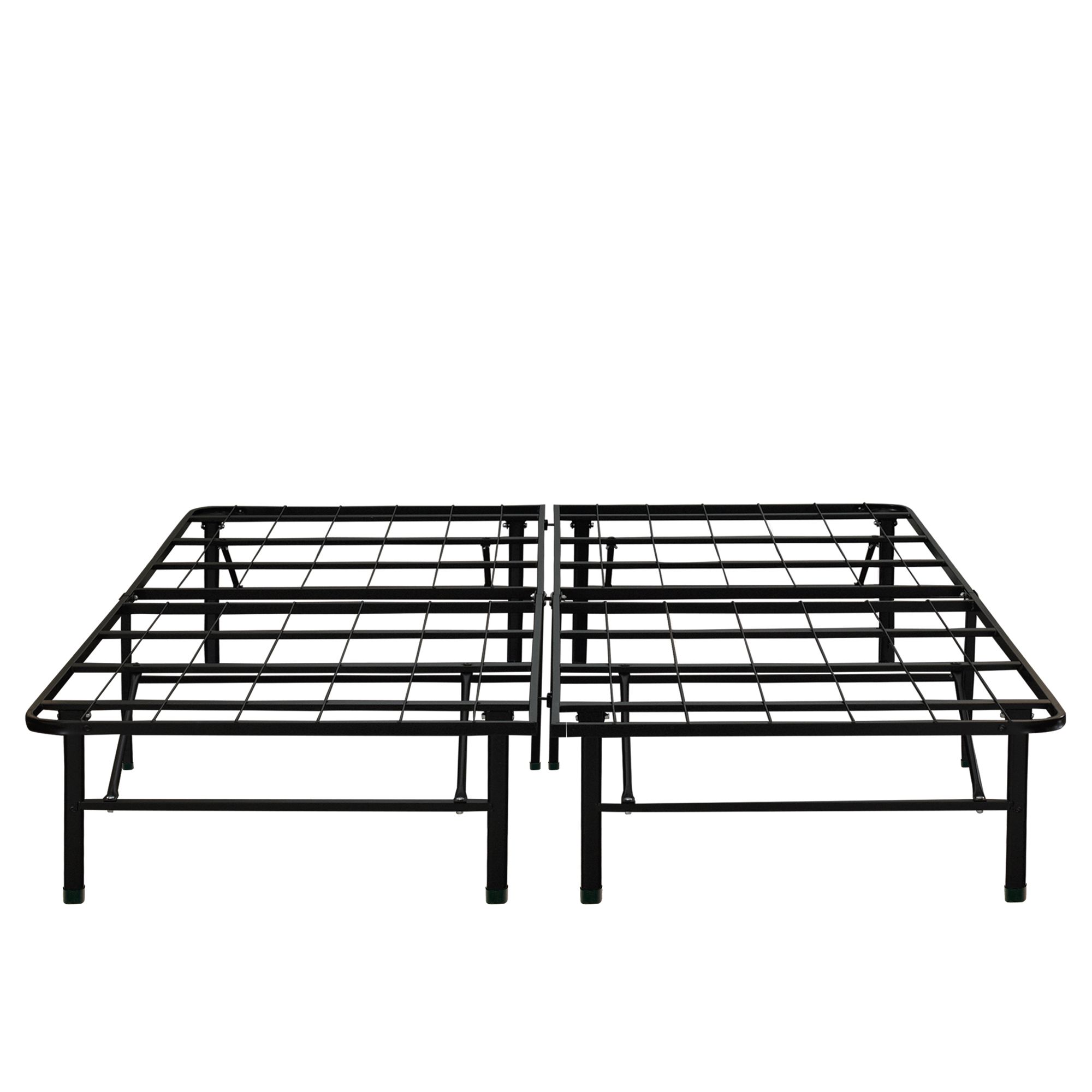 Designed to support a California king-size mattress (not included) Durable, anodized steel construction Crafted with supportive center legs Frame stands 14" off the ground, allowing storage underneath Eliminates the need for a box spring Assembly required; no tools necessary Includes 1 metal bed frame Warranty: 2 years