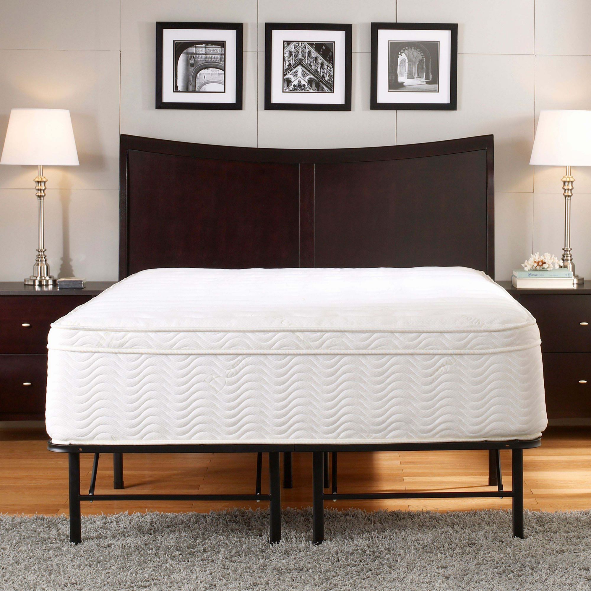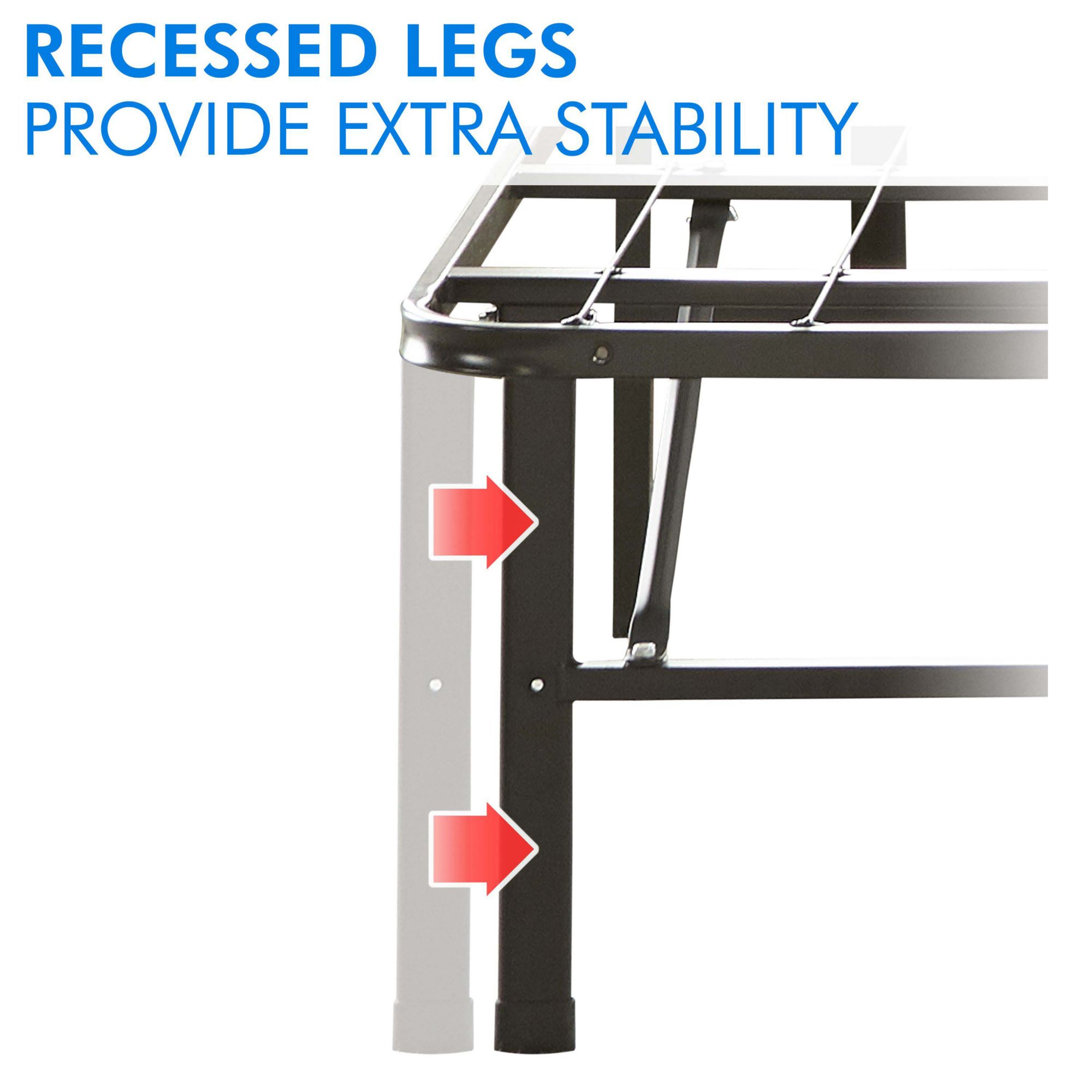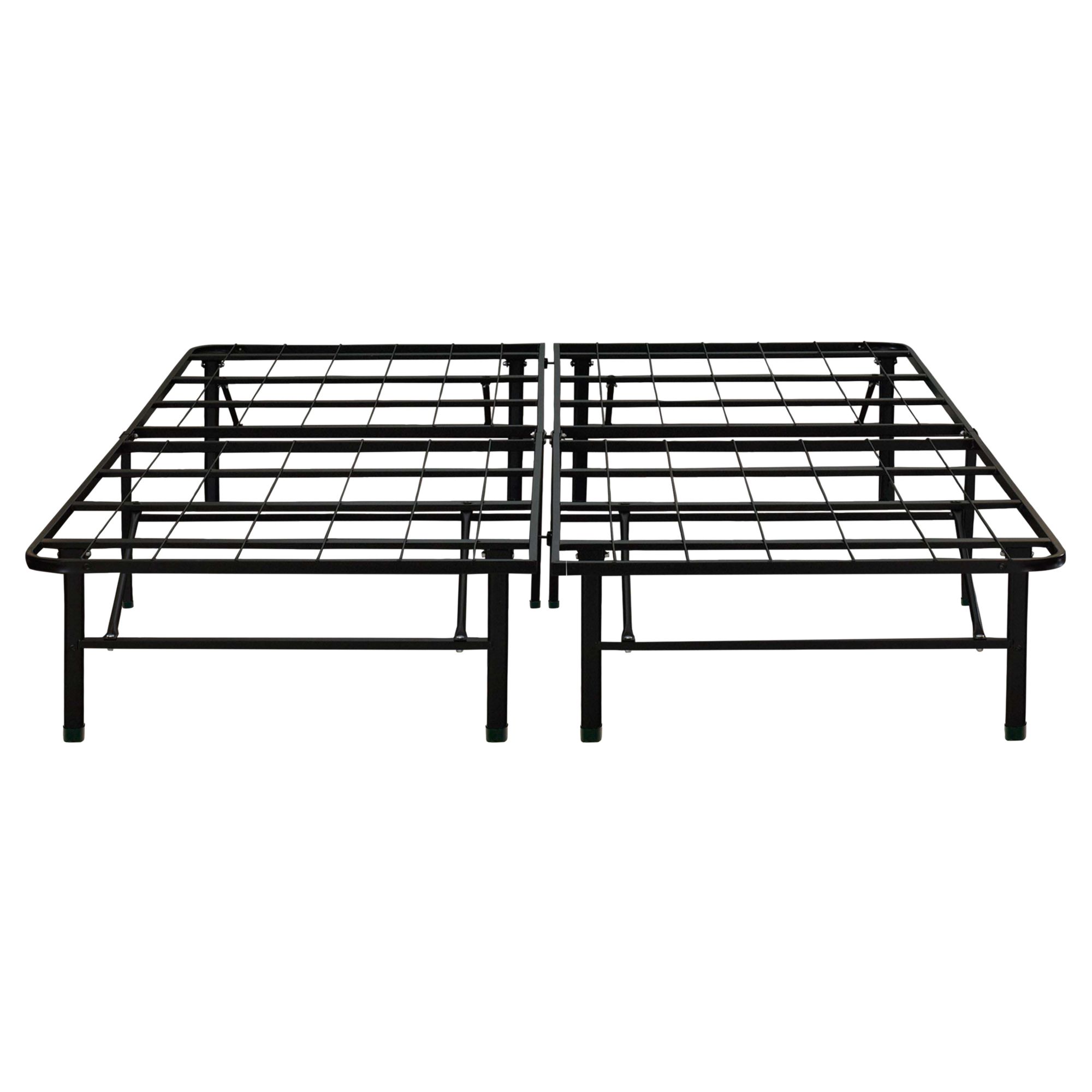 Designed to support a king-size mattress (not included) Durable, anodized steel construction Crafted with supportive center legs Frame stands 14" off the ground, allowing storage underneath Eliminates the need for a box spring Assembly required; no tools necessary Includes 1 metal bed frame Warranty: 2 years