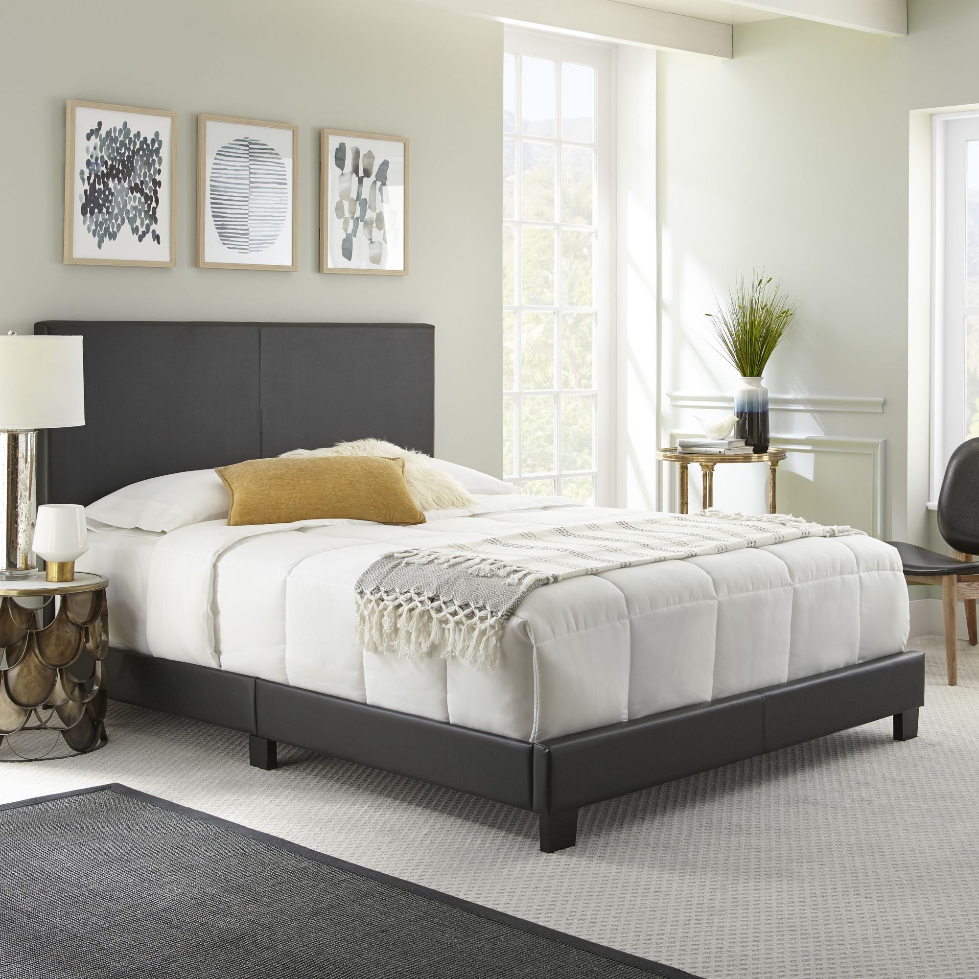 Chic and modern, this bed frame is completely upholstered and padded for a premium look and feel. The headboard features vertical stitch detail in the center. This bed will effortlessly complete the look of any bedroom. Built to last, this bed features heavy-duty construction with a four cross-slat system, and center support legs that easily support up to 700 lbs. You will need a box spring or foundation with this bed frame. It has a 1-year limited warranty.