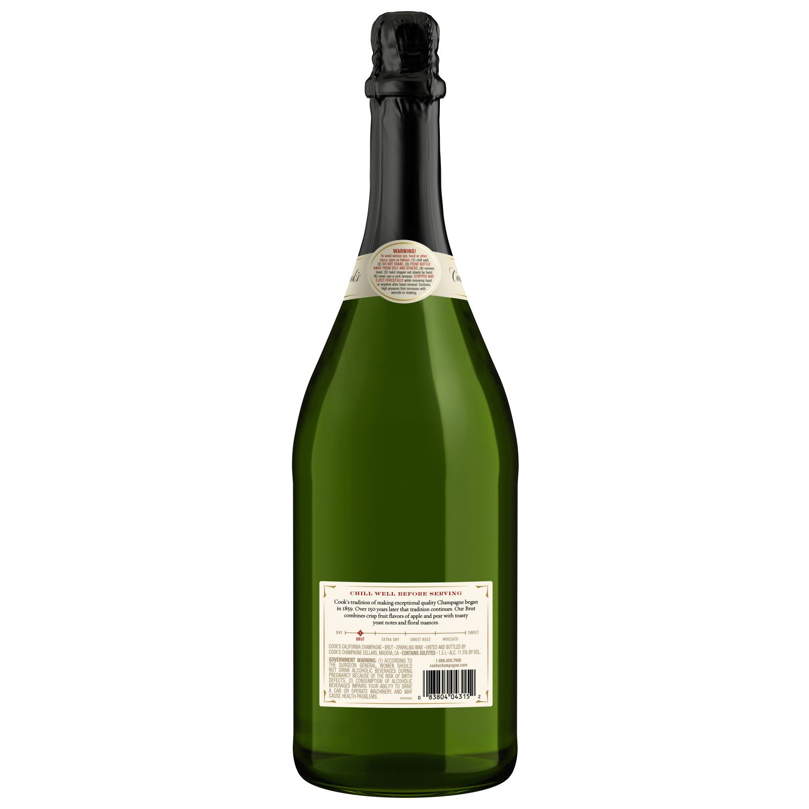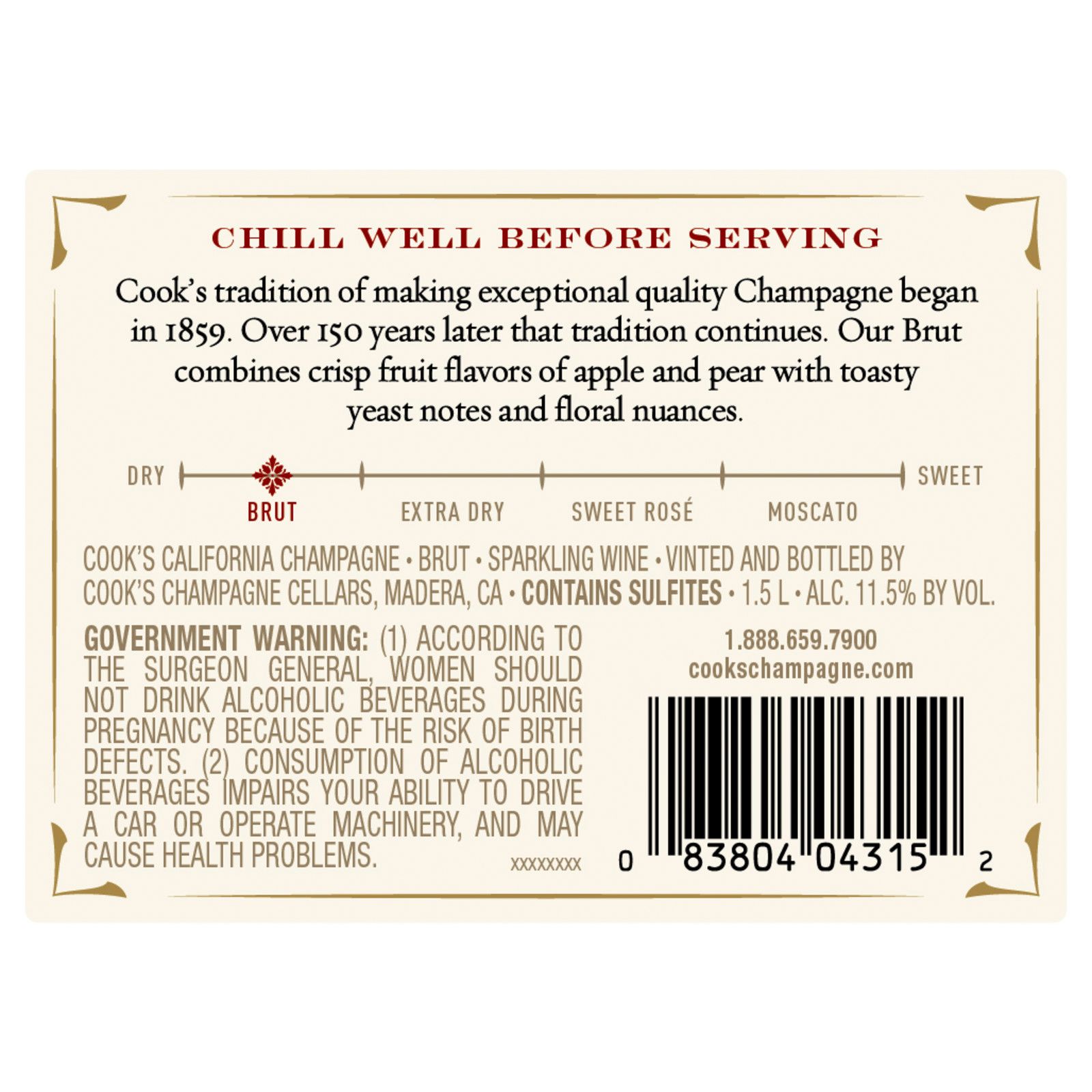 Crafted at the Mission Bell Winery in Madera, California, Cook's California Champagne Brut White Sparkling Wine features ripe aromas and flavors of apple and pear. A prosecco-style sparkling wine, this 1.5 liter magnum bottle of wine is fruity and fresh. This medium-dry wine's aromas and flavors are balanced with toasty yeast notes and floral nuances. To fully appreciate this fine wine's complexity, chill the bottle for three to three and a half hours before serving this sparkling white wine at approximately 40 degrees. Since 1859, when Isaac Cook created the first American champagne, Cook's wines have been continuing the tradition of crafting quality champagnes that are perfect for every celebration, from brunch cocktails to champagne toasts at dinner. Please enjoy our wines responsibly. 2025 Cook's Champagne Cellars, Madera, CA.