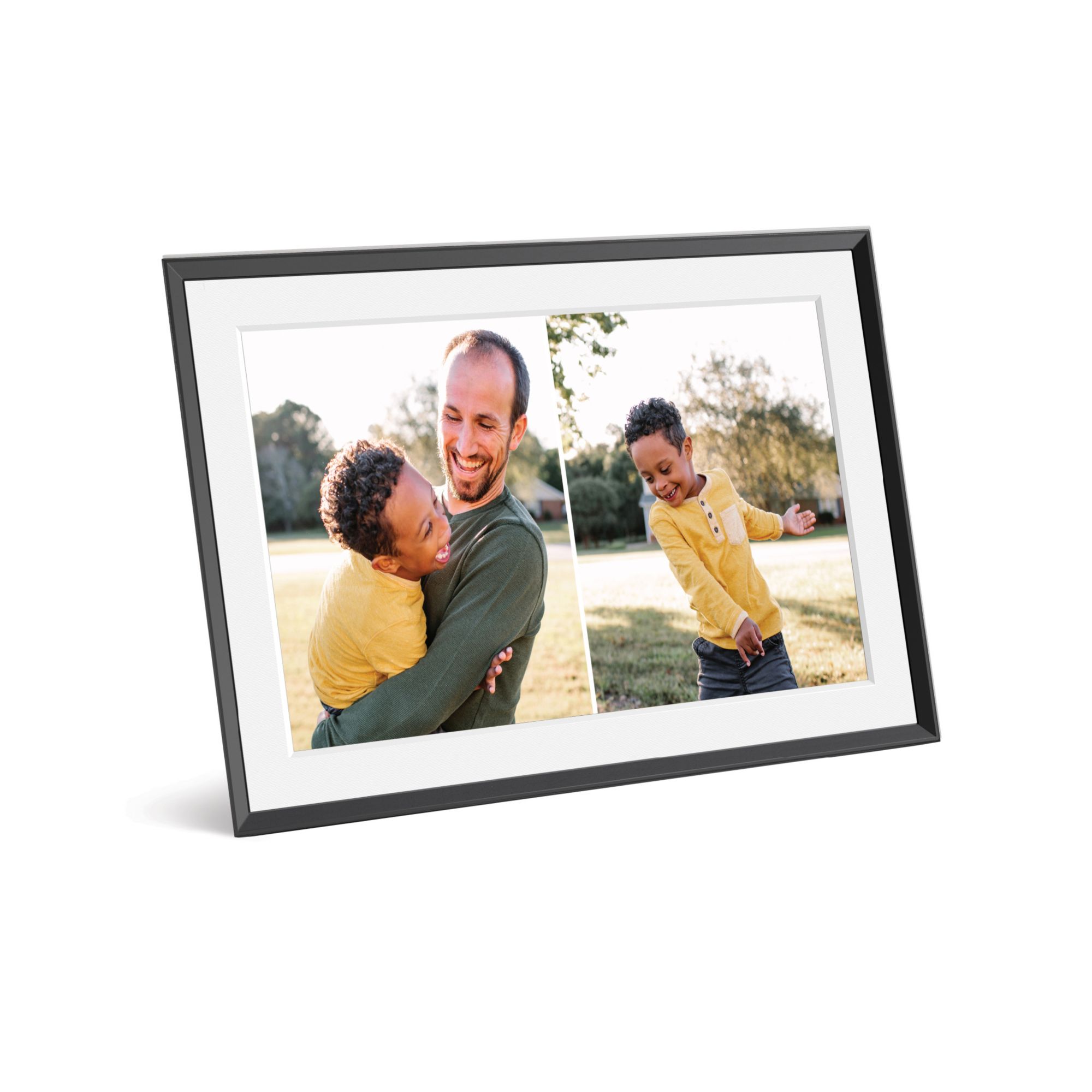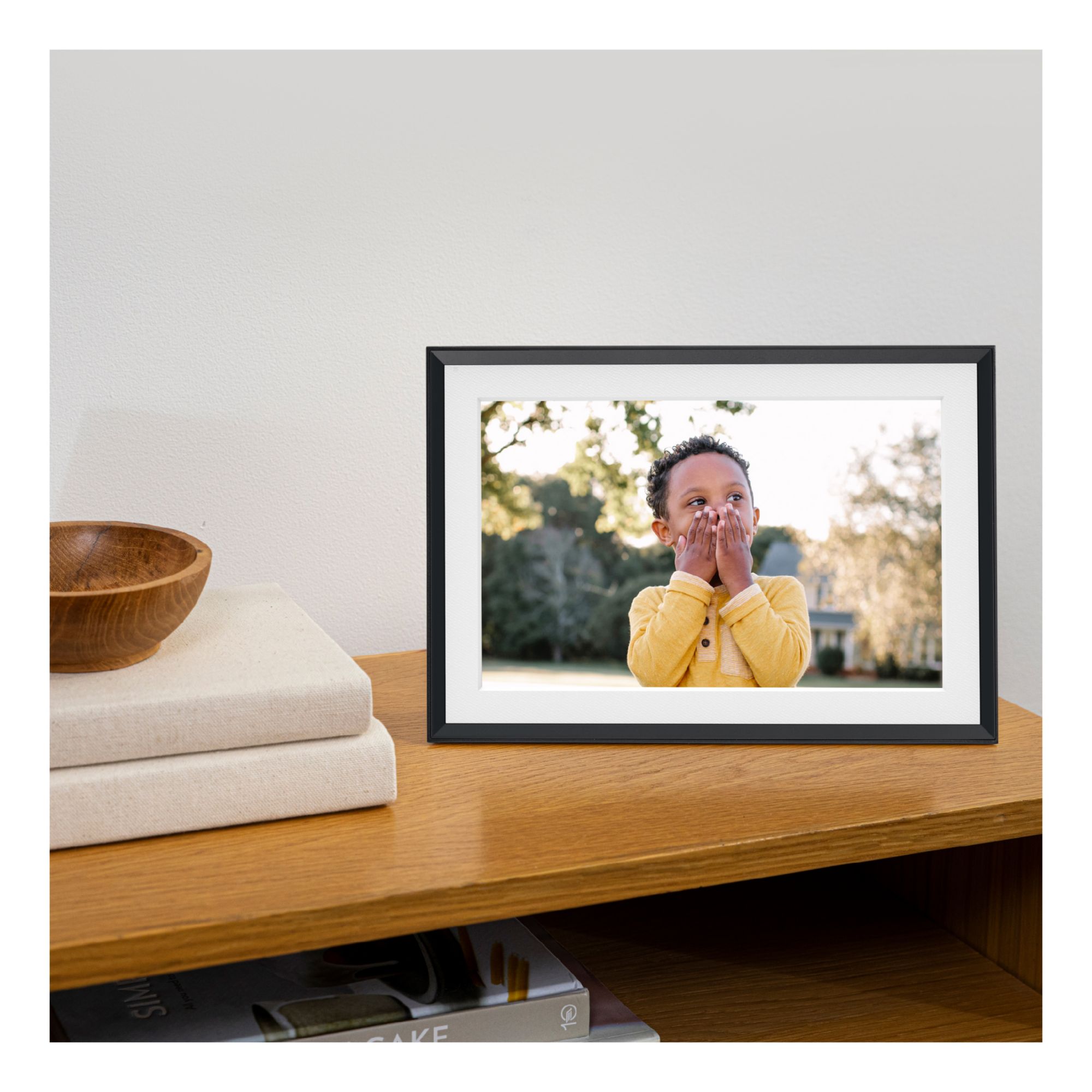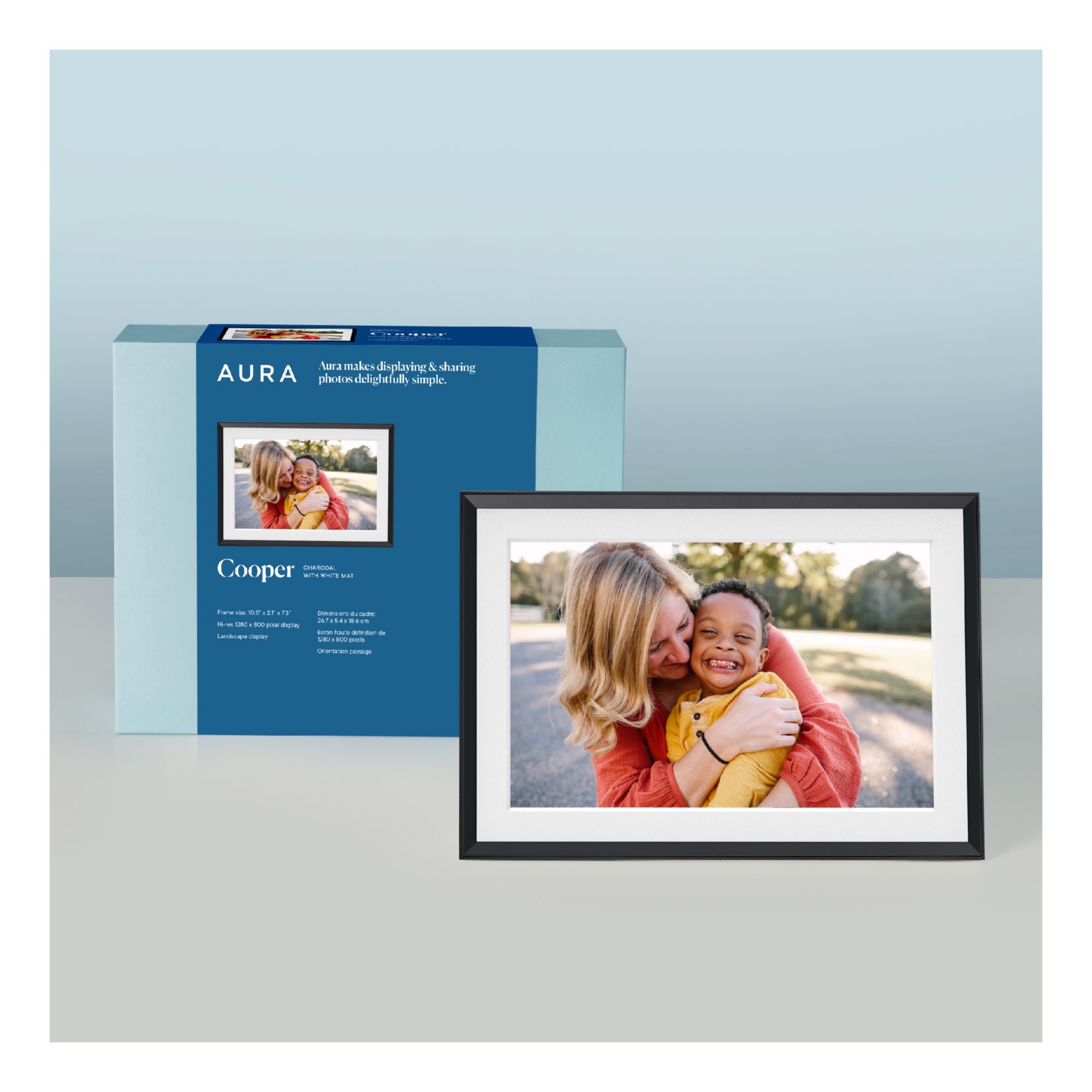 Frame all your favorite faces and places with the minimalist, super-clean Cooper. Inspired by modernist architecture, this freestanding landscape frame features a color-calibrated 10.1” HD display. Set it up in minutes on Wi-Fi and instantly add photos and videos from anywhere using the free Aura app. Send photos from anywhere, invite others to share photos and videos and enjoy free, unlimited cloud storage. The addition of the white mat mimics the looks of a traditional photo frame. Download the Aura app on iOS and Android