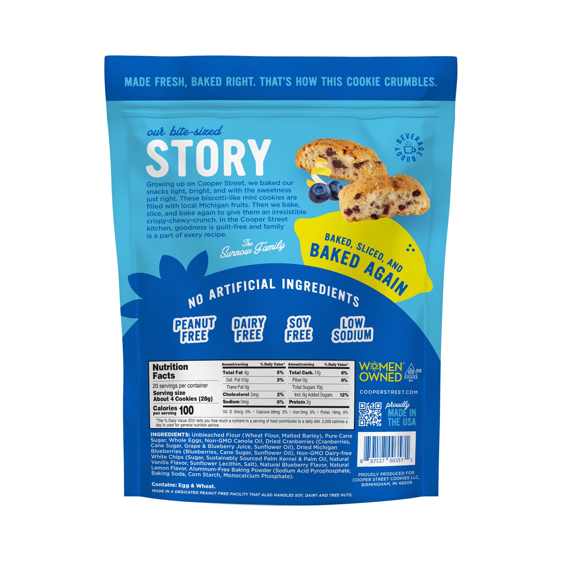 Growing up on Cooper Street, Cooper Street Cookies baked their snacks light, bright, and with the sweetness just right. These biscotti-like mini cookies are filled with local Michigan Blueberries. Then they are baked, sliced, and baked again to give them an irresistible crispy-chewy-crunch. In the Cooper Street Kitchen, goodness is guilt-free and family is a part of every recipe. These twice baked cookies are only 25 calories per cookie and have no artificial ingredients. They are allergen friendly as they are peanut-free, dairy-free, soy-free, and low sodium. These delicious cookies are the perfect any-time snack. Their crispy on the outside, chewy on the inside texture make these perfect to enjoy them by themselves or with coffee, tea, or milk!
