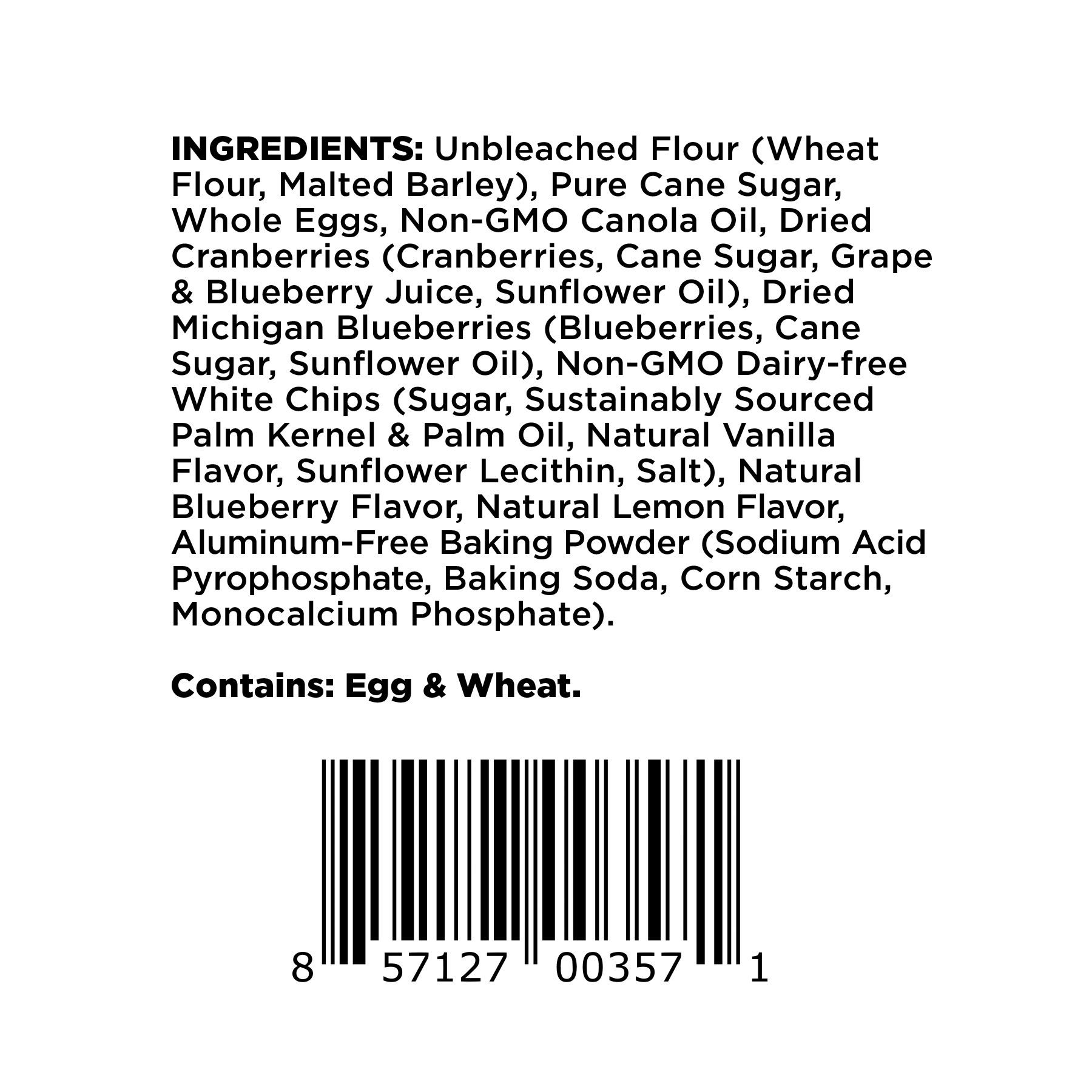 Ingredients: Unbleached Flour (Wheat Flour, Malted Barley), Pure Cane Sugar, Whole Eggs, Non-GMO Canola Oil, Dried Michigan Blueberries (Blueberries, Cane Sugar, sunflower Oil), Dried Cranberries (Cranberries, Cane Sugar, Grape and Blueberry Juice, Sunflower Oil), Non-GMO Dairy-free White Chips (Sugar, Sustainably sourced Palm Kernel & Palm Oil, Natural Vanilla Flavor, Sunflower Lecithin, Salt) Natural Blueberry Flavor, Natural Lemon Flavor, Aluminum-Free Baking Powder (Sodium Acid Pyrophosphate, Baking Soda, Corn Starch, Monocalcium Phosphate).