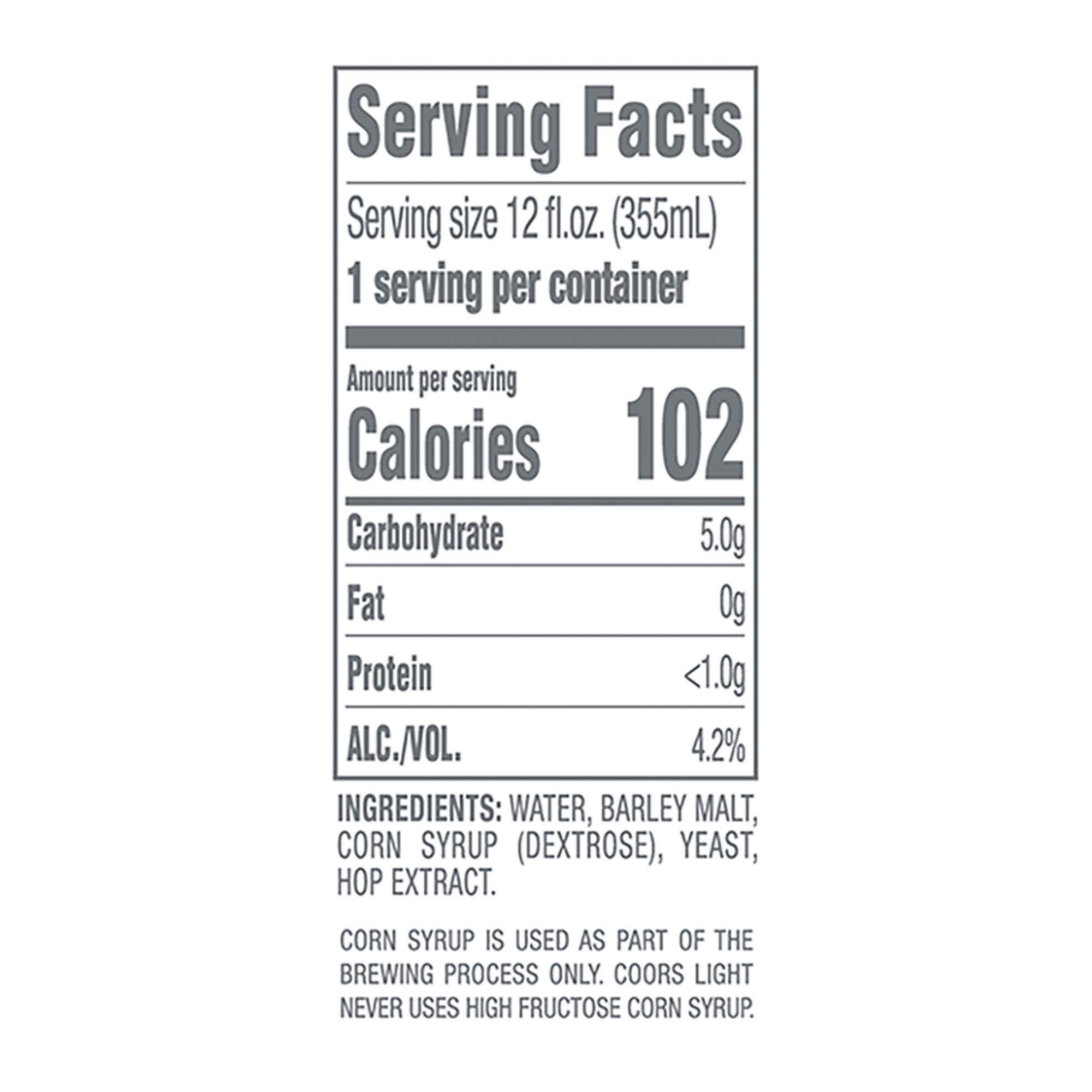 Crisp, clean and refreshing, Coors Light is an American-style light lager beer. This light beer has 4.2% ABV, 102 calories and 5 grams of carbs per 12-ounce serving. Full of Rocky Mountain refreshment, this light-calorie beer provides a light body with clean malt notes and low bitterness. Share this 30-pack of beer with friends and family all year long when you’re in need of refreshing drinks. Not only is Coors Light golden beer crafted with pure water, lager yeast, two-row barley malt, and four hop varieties, but it's cold lagered, cold filtered, and cold packaged to deliver an unforgettable beer-drinking experience. A carry case of Coors Light beer cans makes for great party drinks or for tailgating, barbecues, and any holiday that calls for beer. Coors Light American Lager takes pride in its process and ingredients that make it The World’s Most Refreshing Beer.
