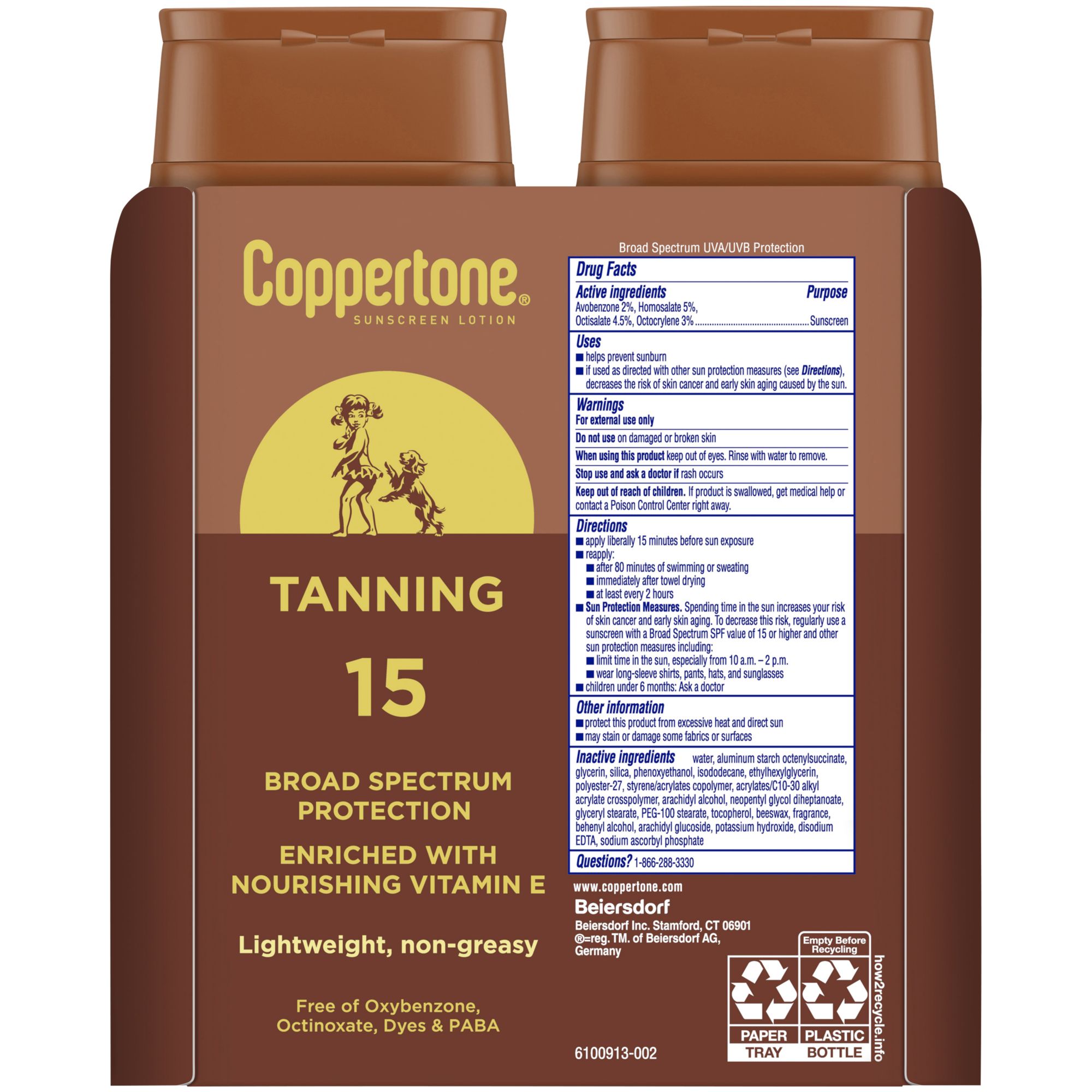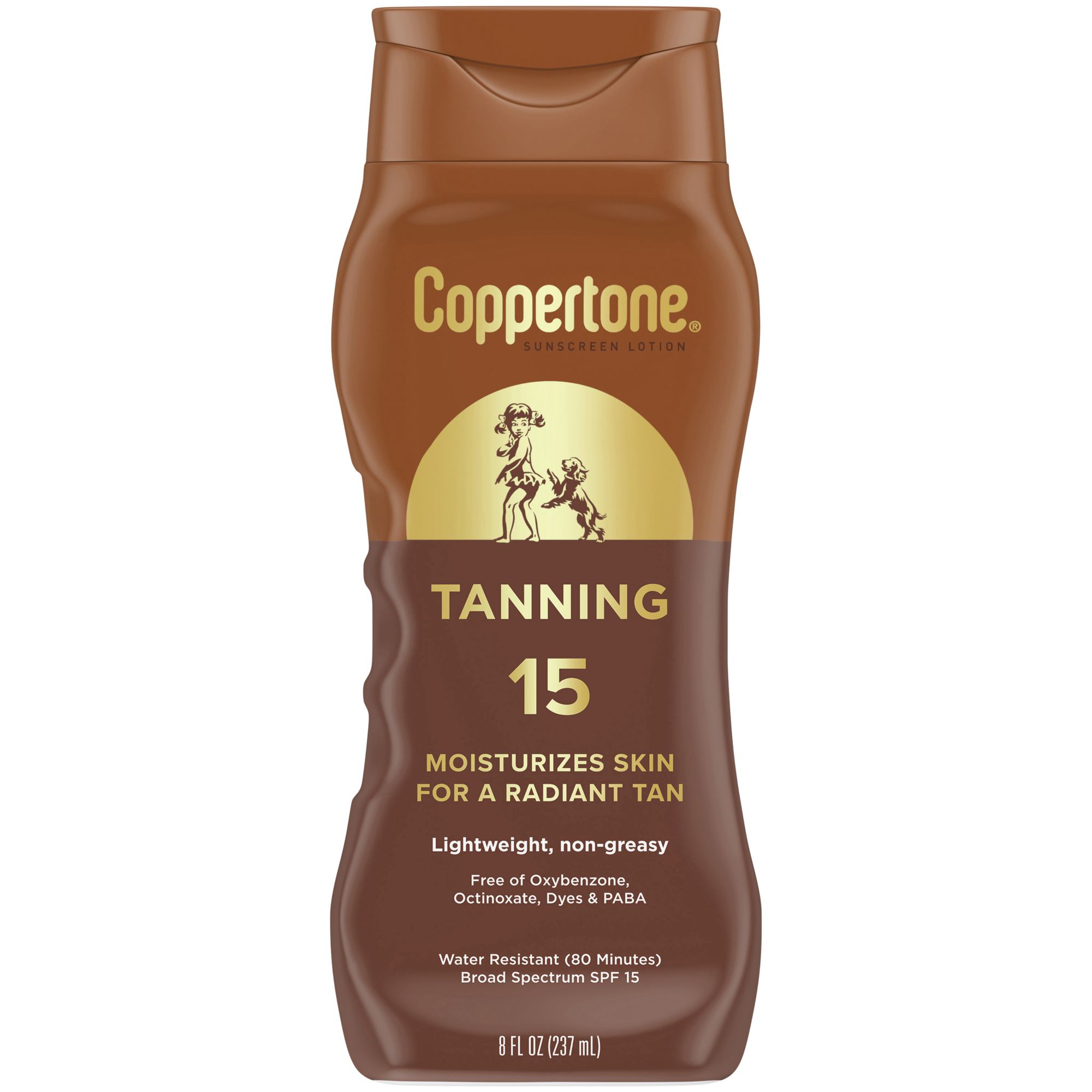 Make the most out of your time in the sun with Coppertone Tanning Sunscreen Lotion. Love the sun and love your skin even more with a lightweight SPF 15 sunscreen lotion formula that won't make your skin feel greasy. This Broad Spectrum sunscreen is water-resistant (80 minutes), and is free from dyes, PABA, and Oxybenzone. This Coppertone sunscreen SPF 15 formula is enriched with Vitamin E to keep the skin feeling moisturized. Coppertone Tanning Sunscreen Lotion is perfect for everyday use, whether you're relaxing on a tropical beach, by the pool, or in your backyard. Each sunscreen Coppertone creates follows a tradition of trusted, quality sun protection products. Coppertone has been providing continuous innovation for more than 75 years and is voted the most trusted sunscreen brand.* Use and reapply Coppertone Tanning Sunscreen Lotion as directed.