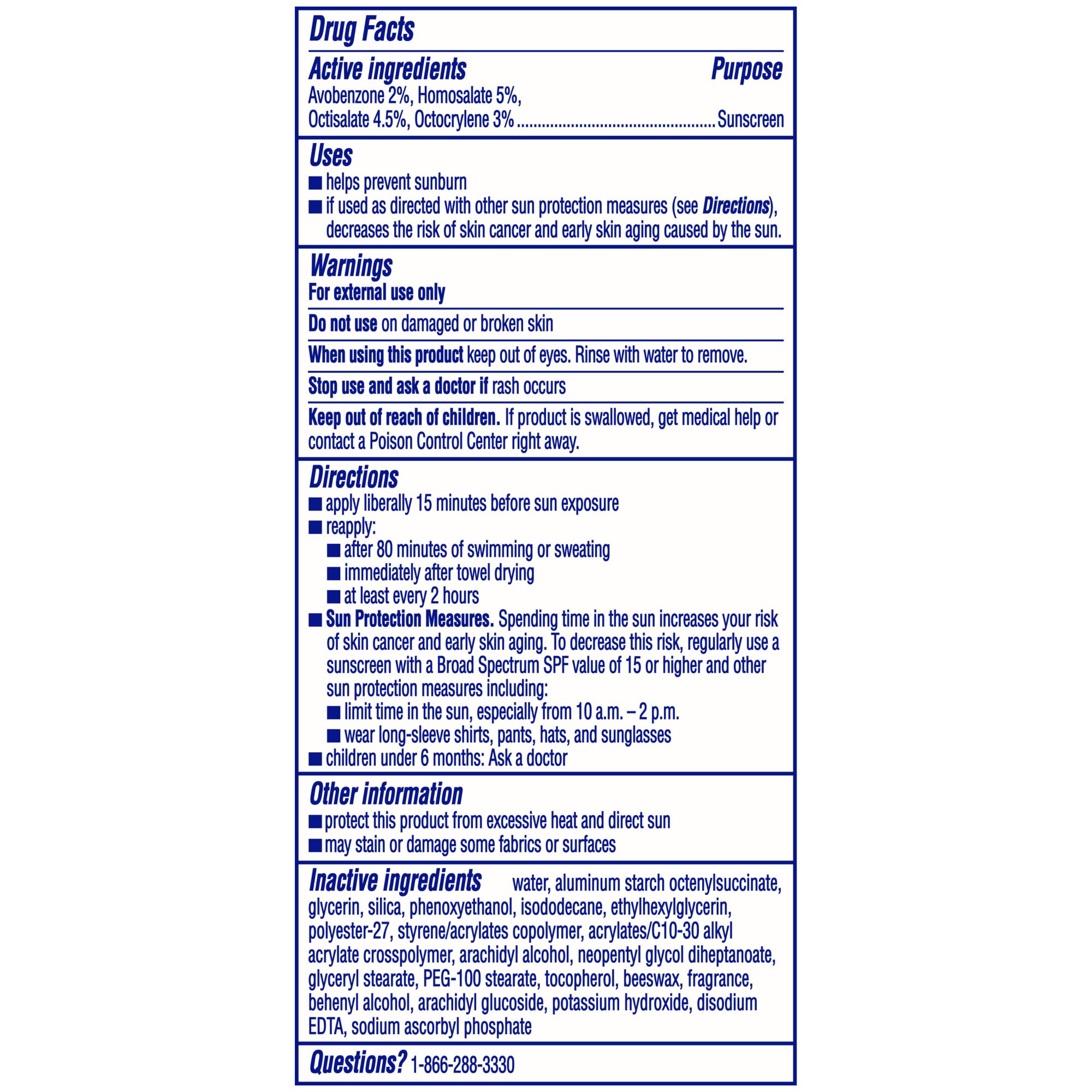 Active Ingredients: Avobenzone 2%, Homosalate 10%, Octisalate 5%, Octocrylene 5% Inactive Ingredients Water, Sorbitol, Ethylhexyl Palmitate, Bis-stearyl Ethylenediamine/neopentyl Glycol/stearyl Hydrogenated Dimer Dilinoleate Copolymer, Benzyl Alcohol, Dimethicone, Tocopherol (Vitamin E) Cetyl Phosphate, Aloe Barbadensis Leaf Juice, Triethanolamine, Fragrance, Acrylates/c10-30 Alkyl Acrylate Crosspolymer, Carbomer, Disodium Edta, Chlorphenesin