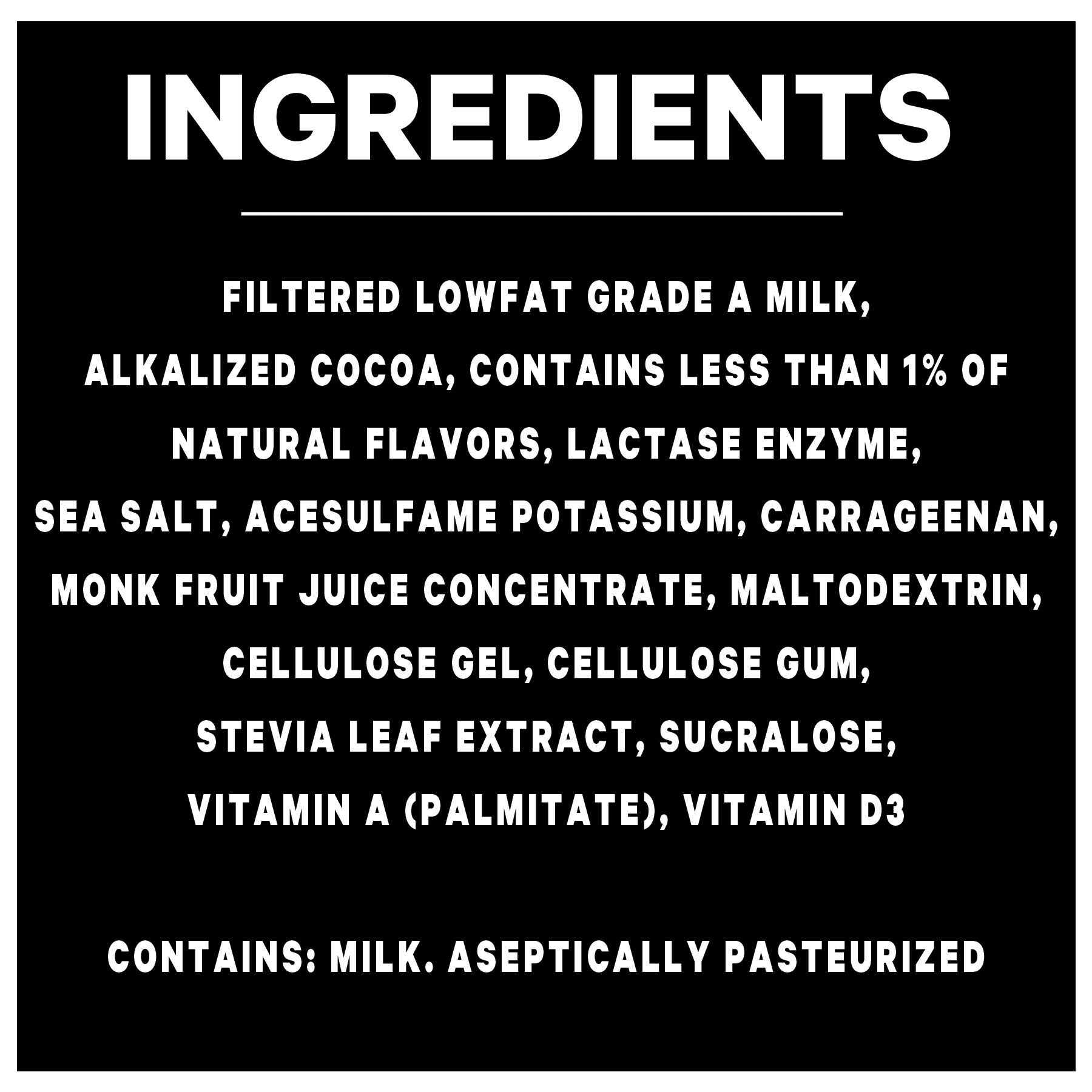 Filtered Lowfat Grade A Milk, Alkalized Cocoa, Contains Less Than 1% of: Natural Flavors, Lactase Enzyme, Sea Salt, Acesulfame Potassium, Carrageenan, Monk Fruit Juice Concentrate, Maltodextrin, Cellulose Gel, Cellulose Gum, Stevia Leaf Extract, Sucralose, Vitamin A Palmitate, Vitamin D3