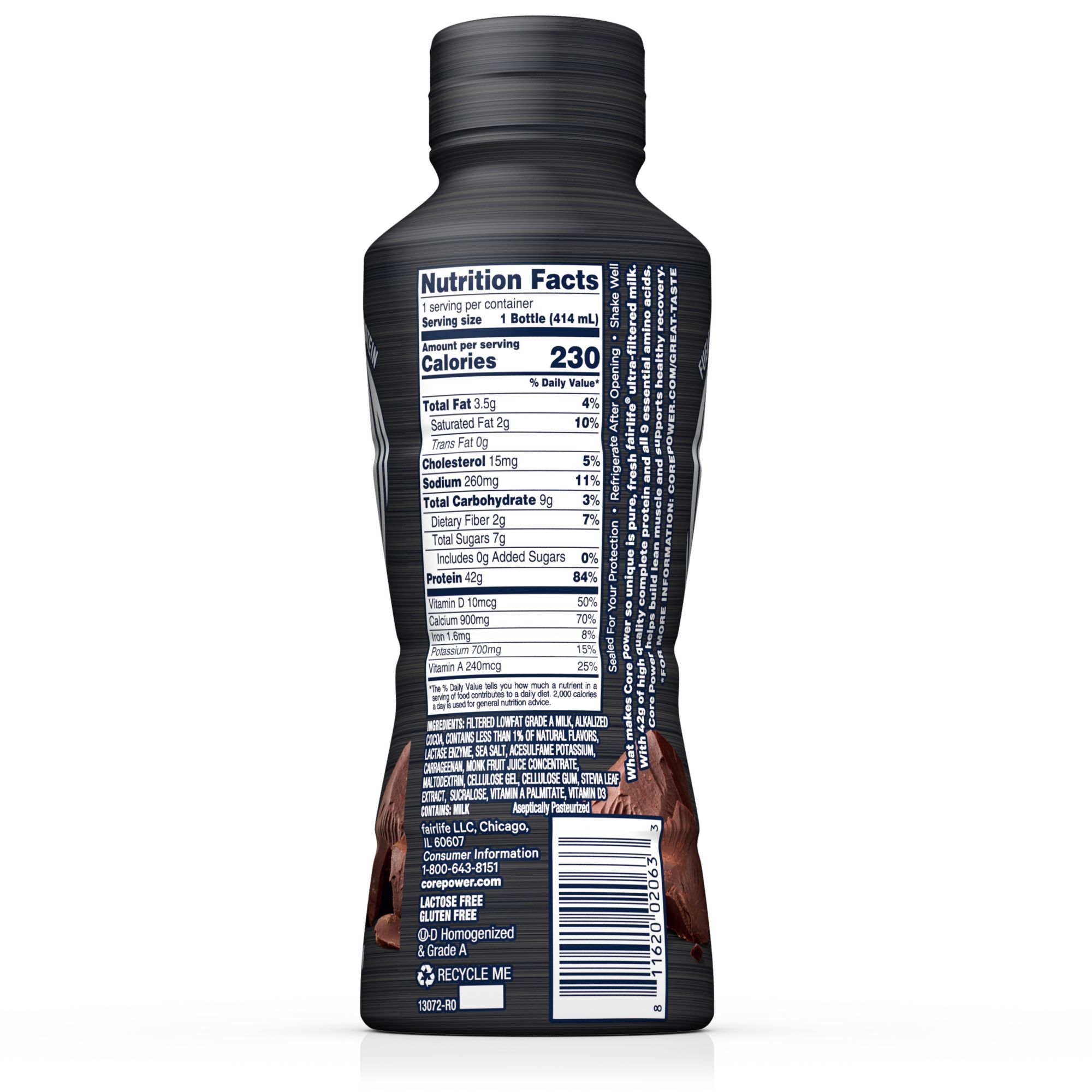 42g of high quality protein fueled by fairlife ultra-filtered milk Helps build lean muscle Contains all nine essential amino acids Electrolytes 230 calories per serving 0g added sugars Lactose free Great taste guaranteed Includes eight 14 oz. bottles of core power elite chocolate