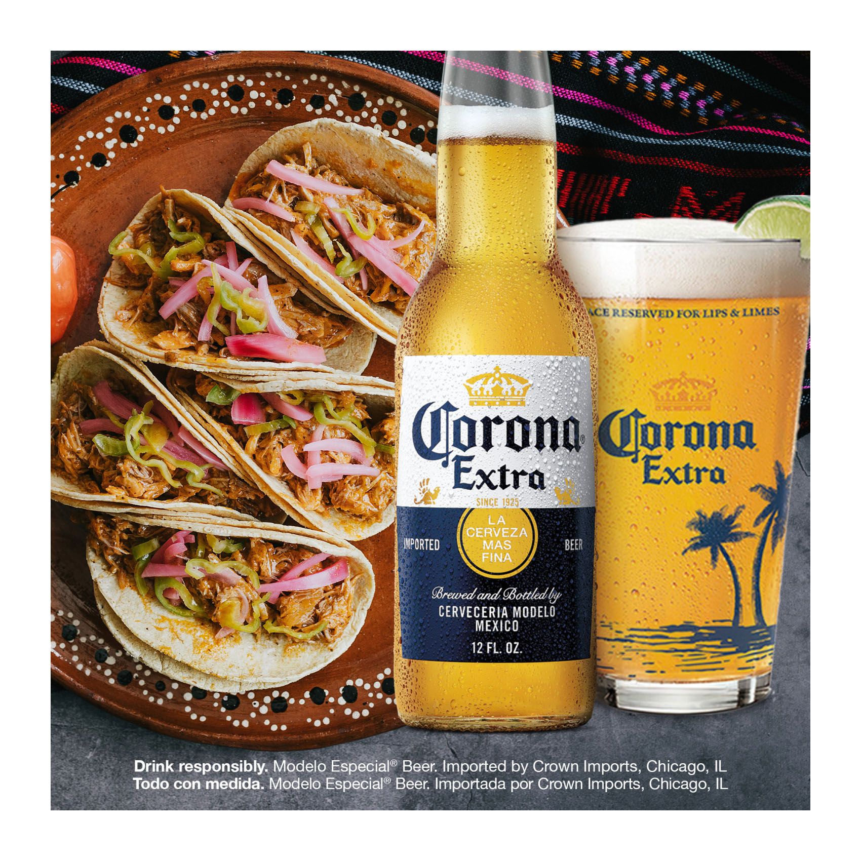 Corona Extra Mexican Beer is an even-keeled, light bodied, imported beer with fruity-honey aromas and a touch of malt. Brewed in Mexico since 1925, this bottled beer's flavor is refreshing, crisp, and well-balanced between hops and malt. Made from the finest-quality blend of filtered water, malted barley, hops, corn, and yeast, Corona Extra Beer has a refreshing, smooth taste that offers the perfect balance between heavier European import beer and lighter domestic beer. A Mexican lager style beer in 12 oz. beer bottles, this Corona bottled beer 18 pack will keep the fridge stocked longer. Corona Extra cerveza is a great summer beer; enjoy it with friends at your next barbecue, beach day, tailgate, or evening get-together. A smooth-drinking beer, Corona Extra contains 148 calories* and 4.6% alcohol by volume. *Per 12 fl. oz. serving of average analysis: Calories 148, Carbs 13.9 grams, Protein 1.2 grams, Fat 0 grams. Relax responsibly. Corona Extra Beer. Imported by Crown Imports, Chicago, IL.