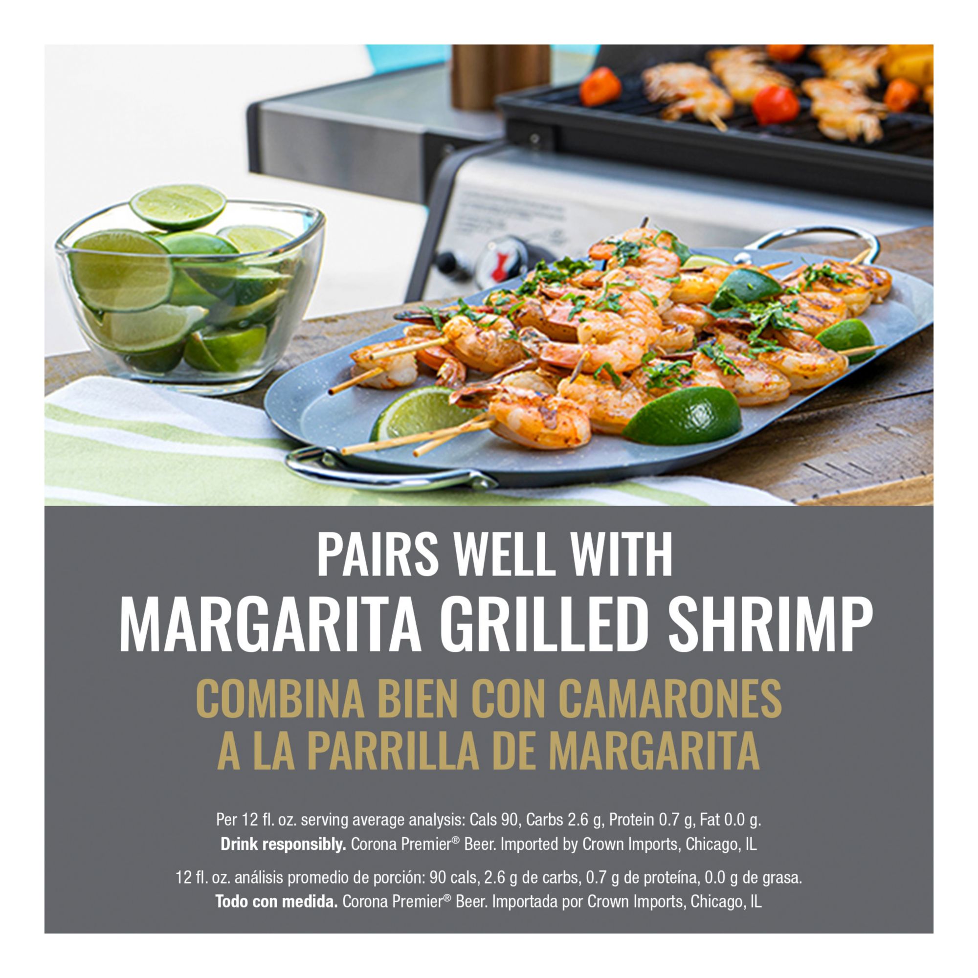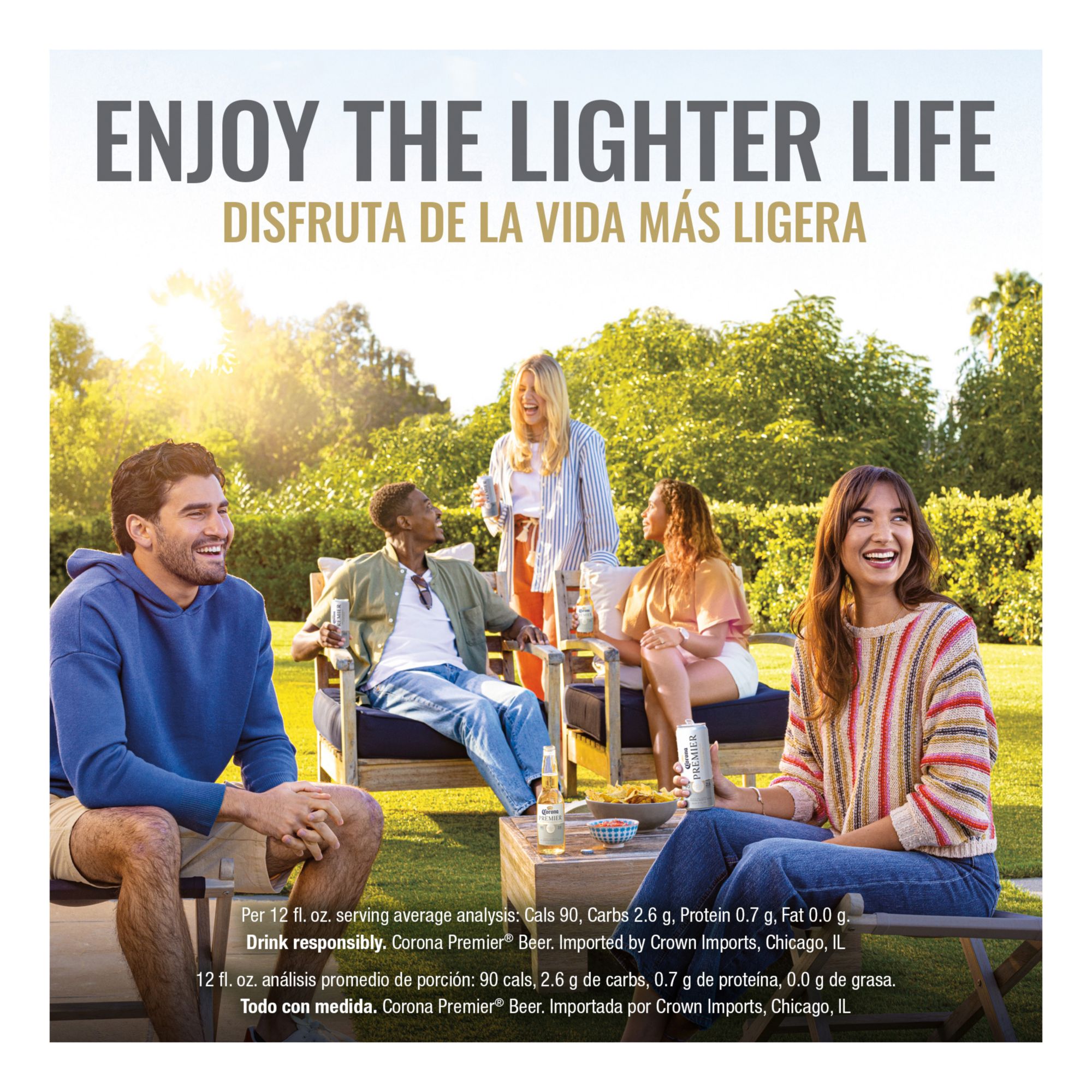 Corona Premier Mexican Lager Beer is the light beer experience you desire, offering an exceptionally smooth taste with fewer calories than both Corona Extra and Corona Light. This lower-calorie*, low-carb*, light lager Corona beer contains 90 calories* per 12 oz serving, but with a flavor that is equally as satisfying. This Mexican lager style beer is made with barley malt, unmalted cereals, hops, and bottom-fermenting yeast. The result is a perfectly balanced and drinkable Corona beer with a touch of sweetness and a clean, pleasantly dry finish. Perfect for pairing with grilled pork and chicken, seafood and shellfish, and other fresh dishes, this imported beer also is the ideal complement to Mexican food. Share this light bodied bottled beer 18 pack with friends after a round of golf or with guests at a backyard barbecue, or enjoy the crisp, refreshing taste of this light lager cerveza on its own. Not a low-calorie food. *Corona Premier per 12 fl. oz. serving of average analysis: Calories 90, Carbs 2.6 grams, Protein 0.7 grams, Fat 0 grams compared to Corona Light per 12 fl. oz. serving average analysis: Calories: 99, Carbohydrates: 4.8 grams, Protein: 0.8 grams, Fat: 0.0 grams and Corona Extra per 12 fl. oz. serving of average analysis: Calories: 149, Carbs: 14 grams, Protein: 1.2 grams, Fat: 0 grams.