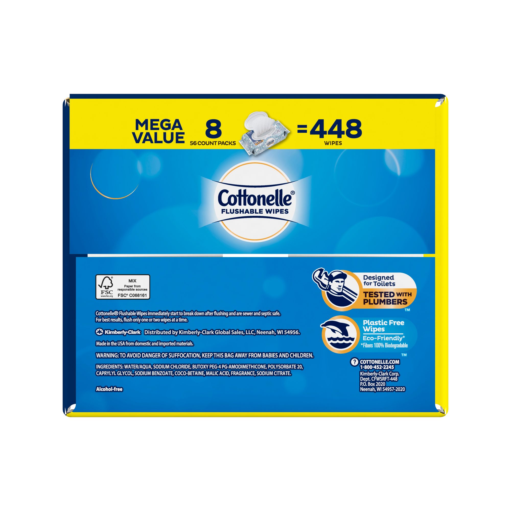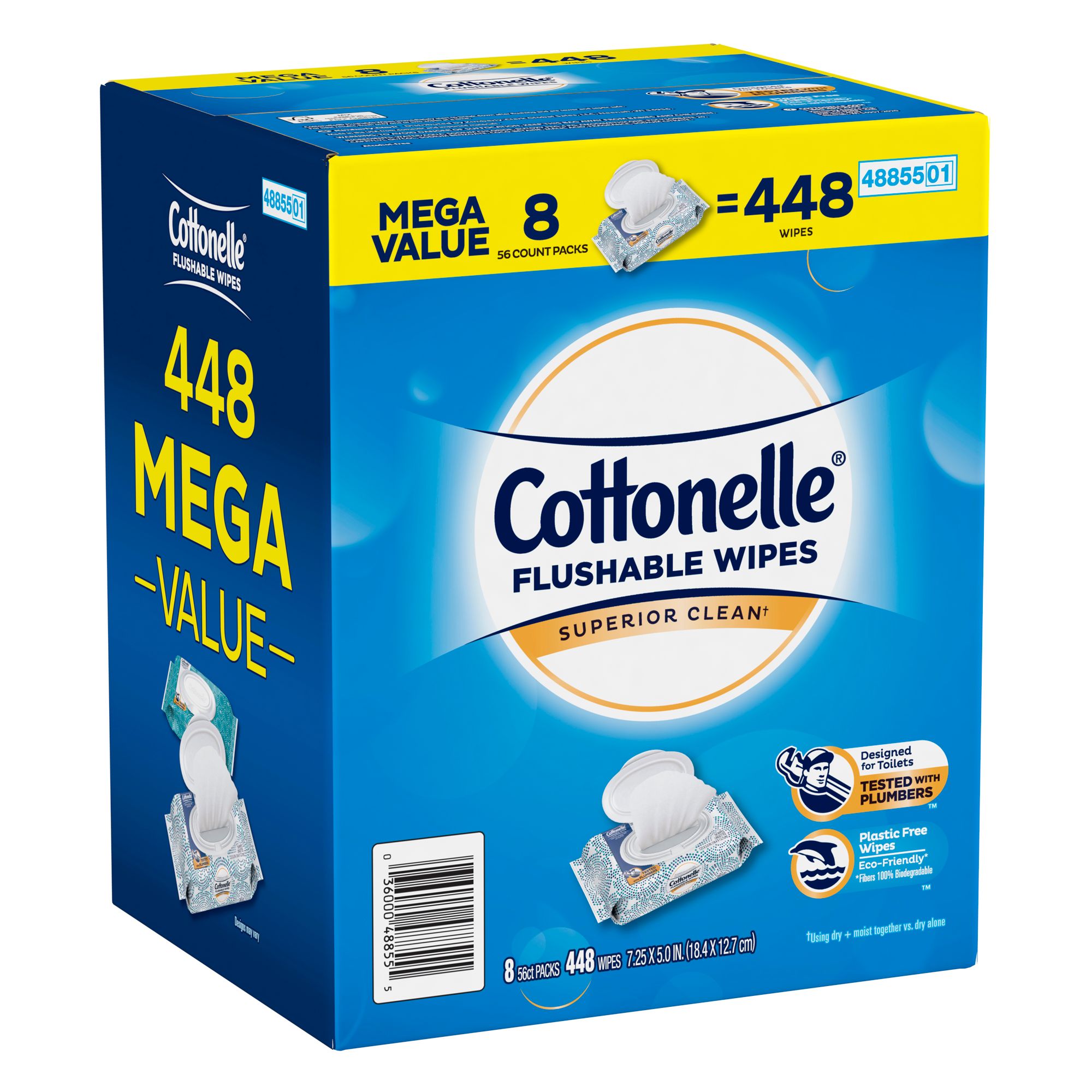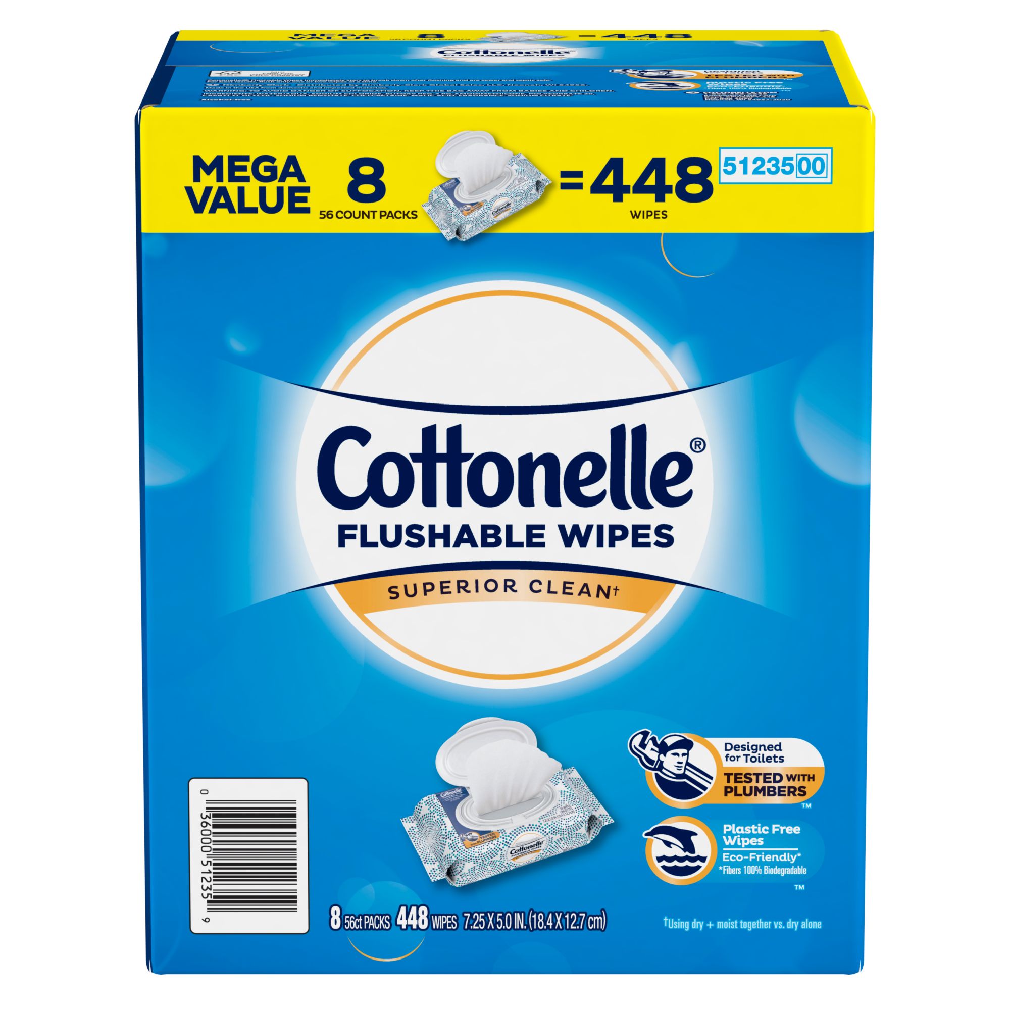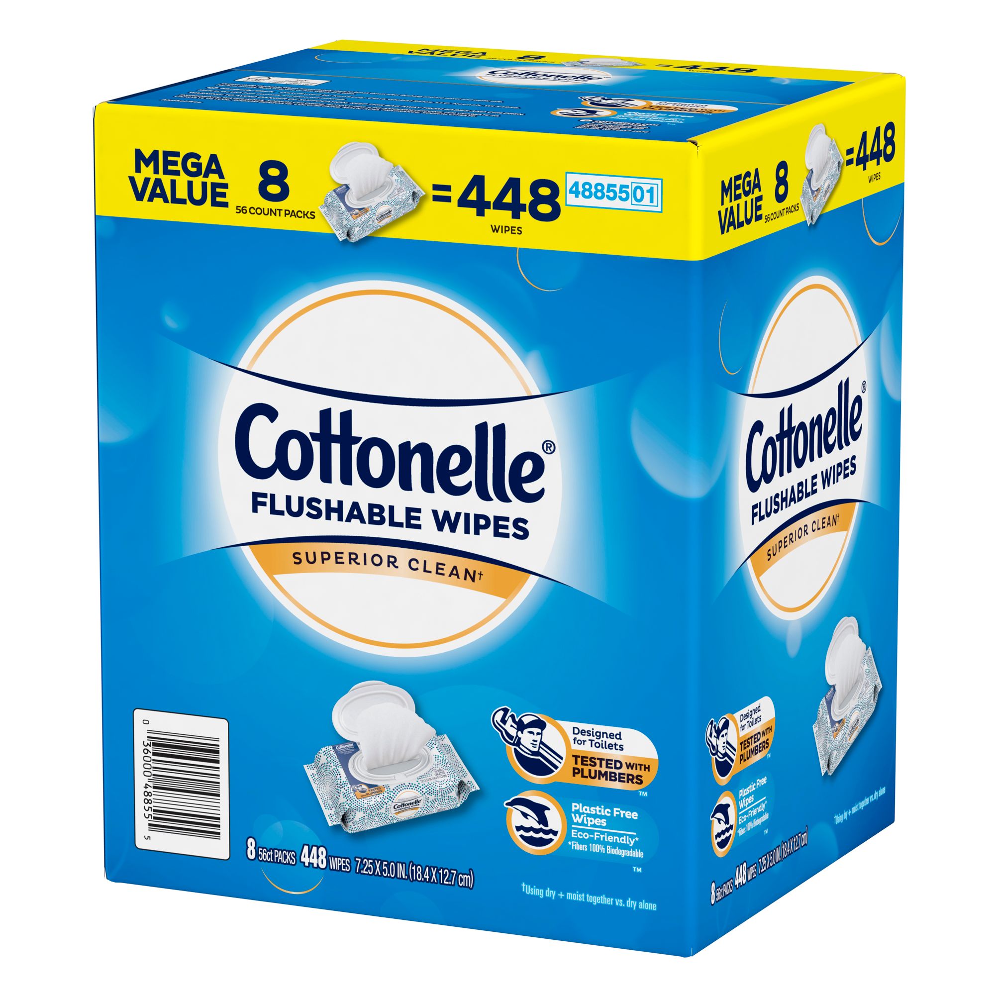 Wavy texture Fresh, gentle, effective and clean better versus using dry bath tissue alone 100% flushable Sewer- and septic-safe Large, dual-layer wipes clean better Includes 8 packs of 56 wipes