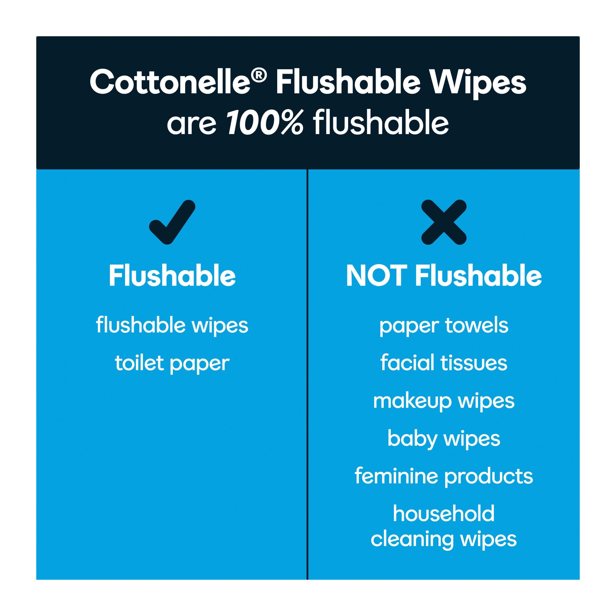 BREAKS DOWN LIKE TOILET PAPER* — Every flushable wipe breaks down like toilet paper, making them sewer- and septic-safe (*begins to break up as fast as Cottonelle Ultra Clean and has same break up after 30 minutes)