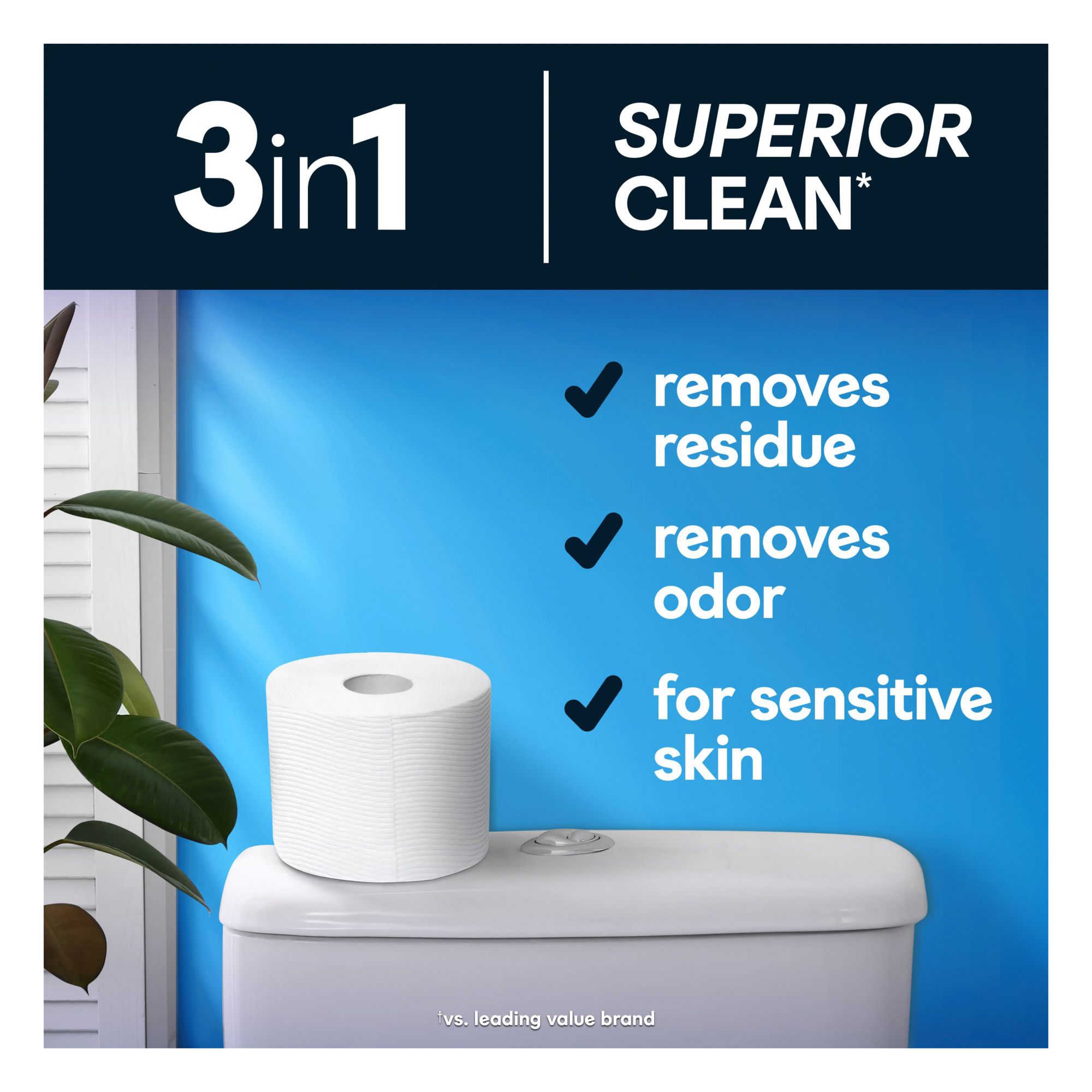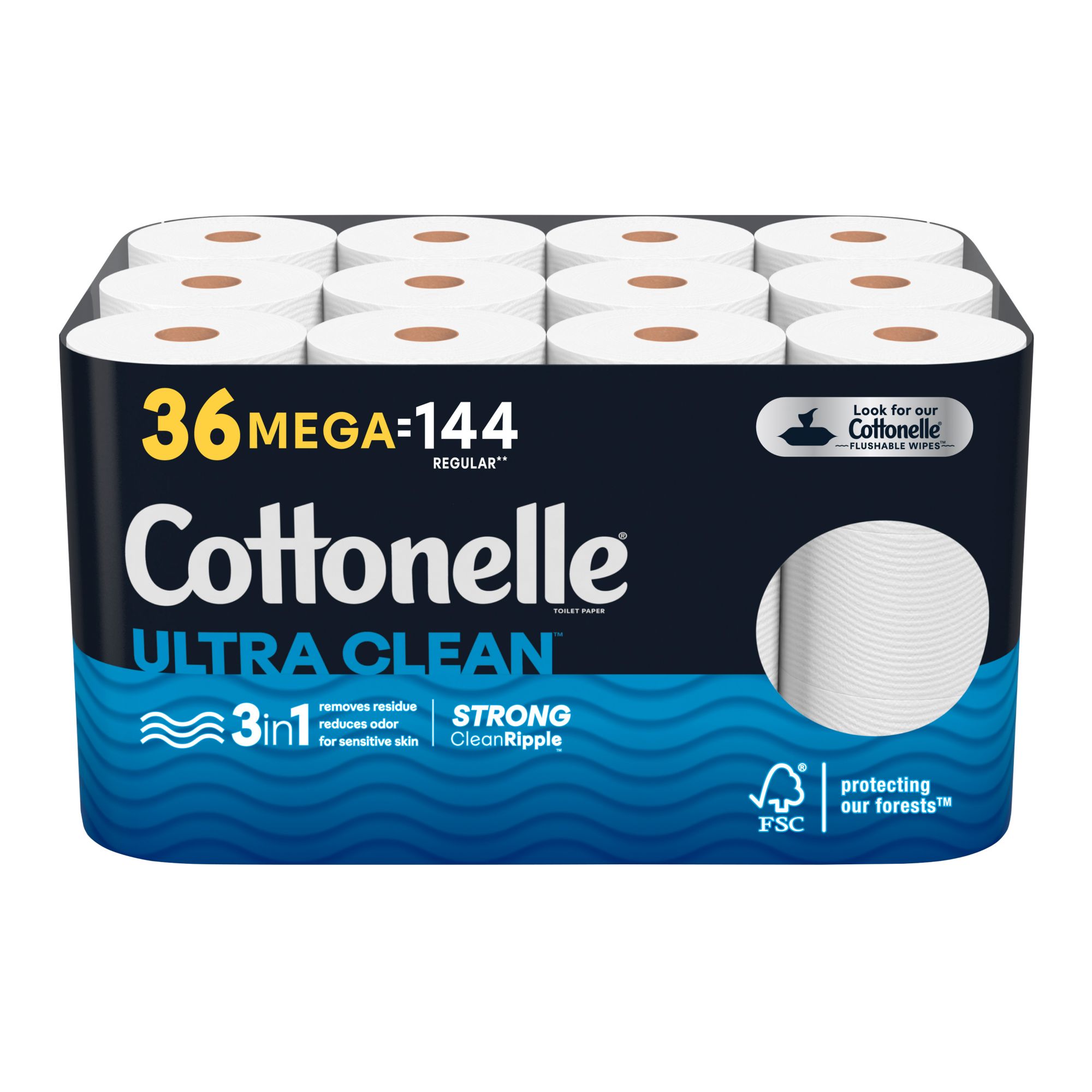 Get the superior clean you’ve been waiting for with Cottonelle Ultra Clean Toilet Paper, designed to clean three ways in one. The soft yet strong cleaning ripples are safe for sensitive skin and remove residue that can cause irritation and odor-causing bacteria. The Cadillac of one-ply toilet paper, Cottonelle Ultra Clean toilet tissue is three times stronger than the leading value brand in order to protect your hands as you clean up, and is still septic-safe and clog-free. Each Cottonelle mega roll has 312 sheets per roll so you can worry less about running out when you or guests at your home need it most. Looking for more ways to feel clean down there after taking care of business? Use Cottonelle flushable wet wipes to feel shower fresh three times longer***. Conveniently remain stocked on toilet paper by ordering Cottonelle for delivery to your door or pickup curbside.