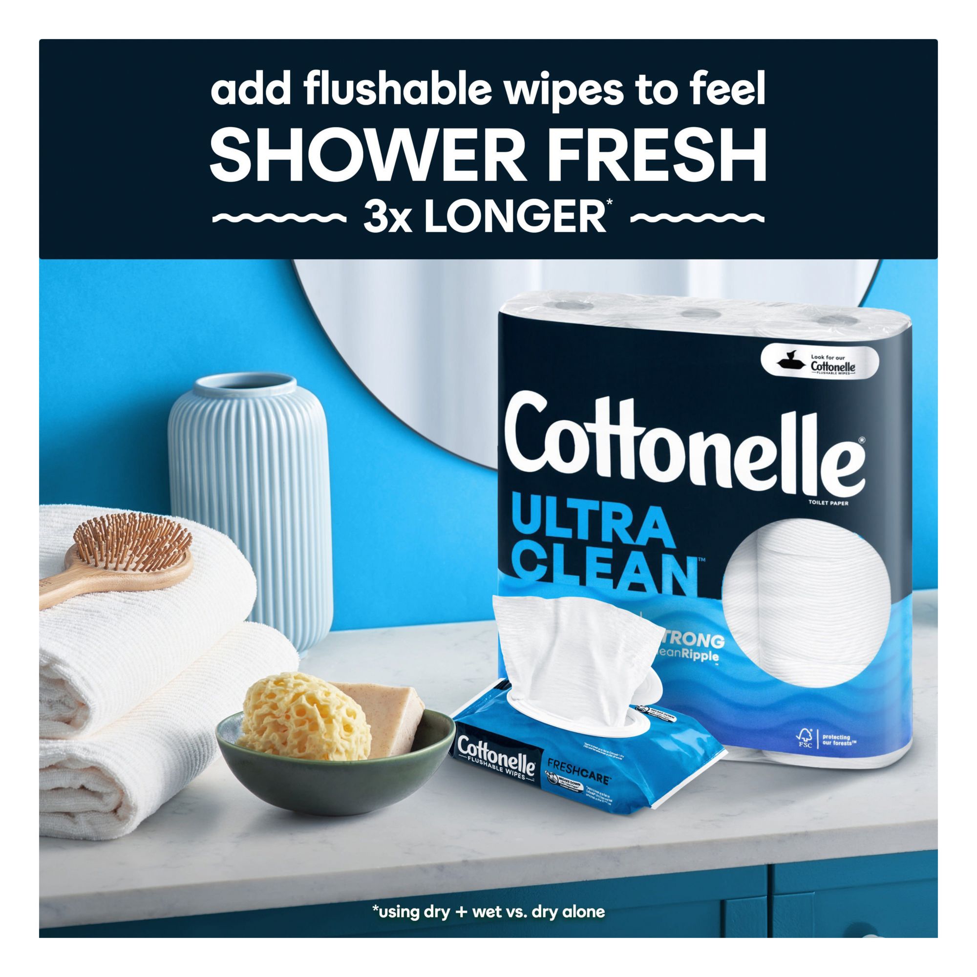 Use Cottonelle toilet paper and Cottonelle flushable wet wipes together for a refreshing, shower fresh clean