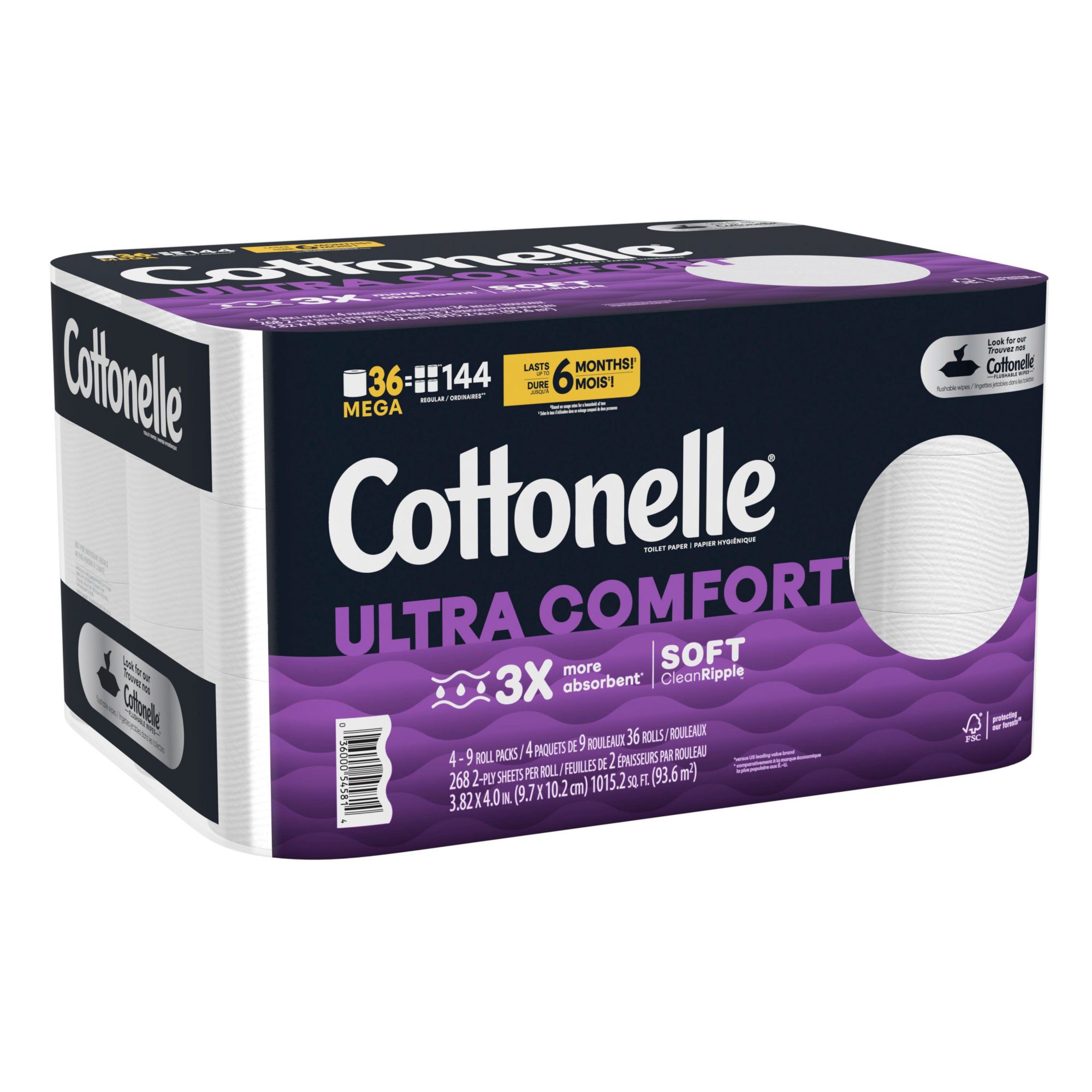 Includes 36 mega rolls of Cottonelle ultra comfort toilet paper, 268 sheets per roll (36 Mega Rolls = 144 Regular Rolls)