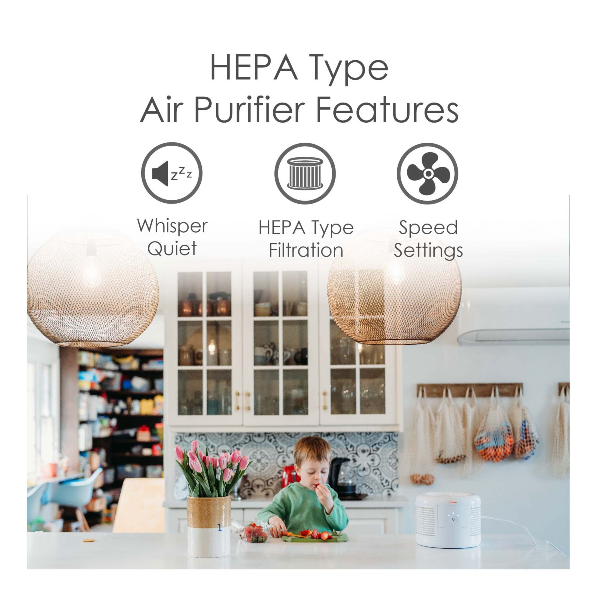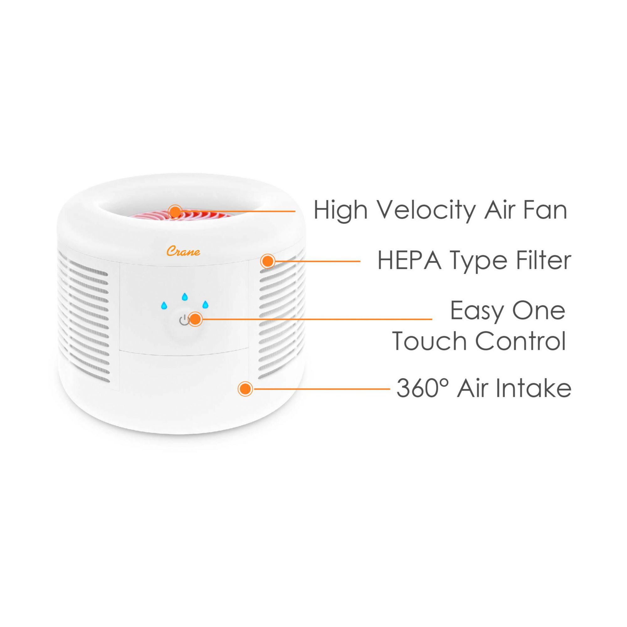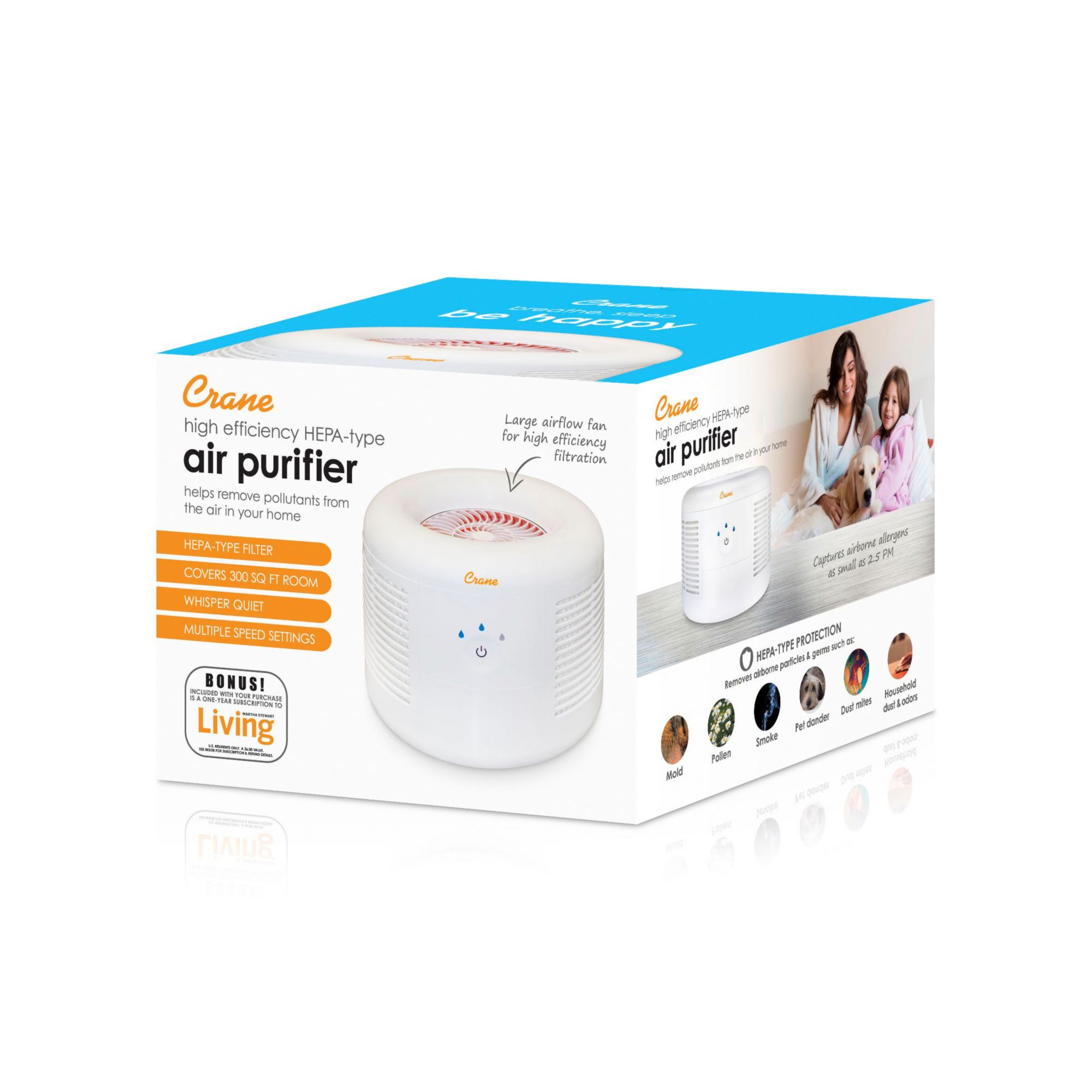 Get comfortable with the air quality in your home with the Crane 3-Speed HEPA Air Purifier. Crane's purification system includes a HEPA type filter and 3-speed settings. Make your home your comfort zone, while controlling the quality of the air outside may be complicated, ensuring clean air in your home has never been easier. The humidifier's air purifier provides up to 300-sq.-ft. of coverage and will efficiently clean your indoor air by removing these pollutants from your home, all the while contributing to your home’s decor.