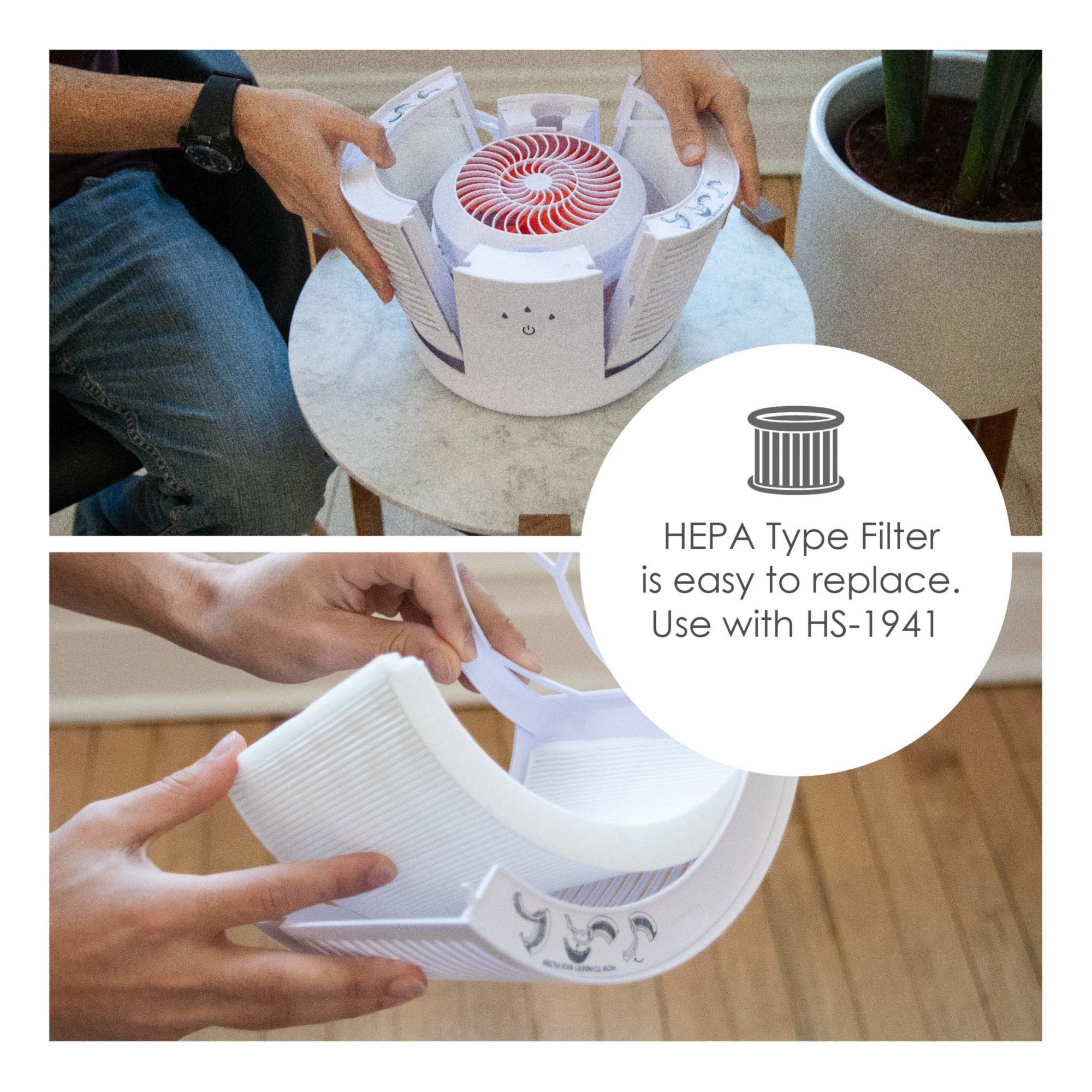 Large capacity air purifier works in rooms up to 300-sq.-ft. Perfect for effective air purification in any living space such as bedrooms, living rooms, or public areas like classrooms and offices Included HEPA type (High Efficiency Particulate Arresting) filter removes 99.97% of airborne particles and germs such as mold, pollen, smoke, pet dander, dust mites, and other possible allergens, and also filters out common household orders that can cause sinus irritation HEPA type filters meet the efficiency and air quality levels set by the United States Department of Energy HEPA type filters are included with the initial purchase of the unit; Crane air purifier replacement filters (HS-1941) can also be purchased when it is time to change the filter Three speed controls, runs continuously, and runs whisper quite no matter what speed it is set at which is perfect for a good night’s sleep Powerful air purifier’s design is sleek and modern, but fits well with any room’s decor 9.25"D x 9.25"W x 7.5"H, making it a perfect compact option for even the smallest of spaces Includes humidifier Warranty: 1 year limited