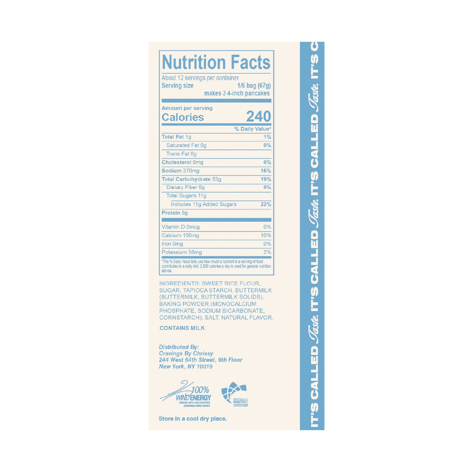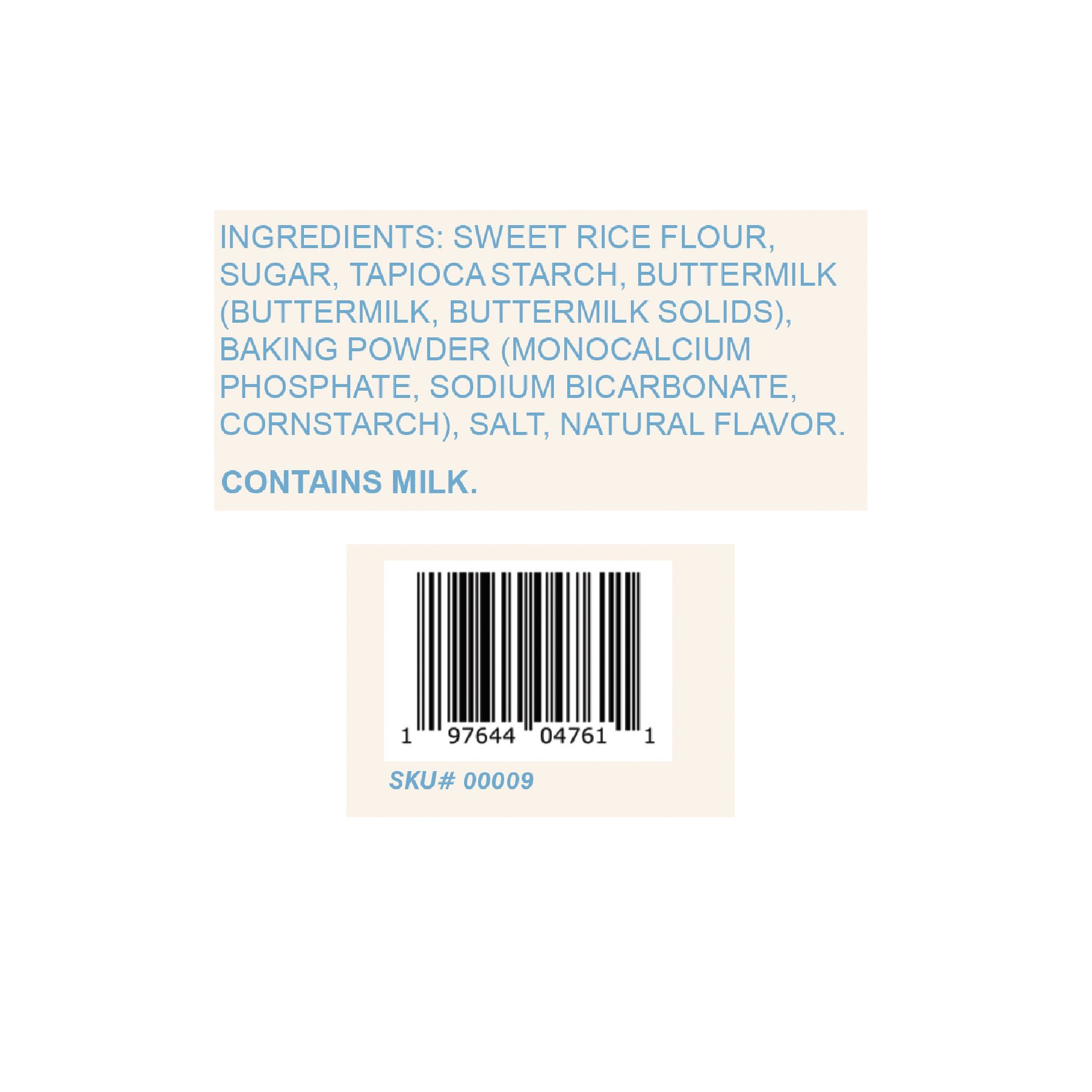 Ingredients: Sweet Rice Flour, Sugar, Tapioca Starch, Buttermilk (Buttermilk, Buttermilk Solids), Baking Powder (Monocalcium Phosphate, Sodium Bicarbonate, Cornstarch), Salt, Natural Flavor.