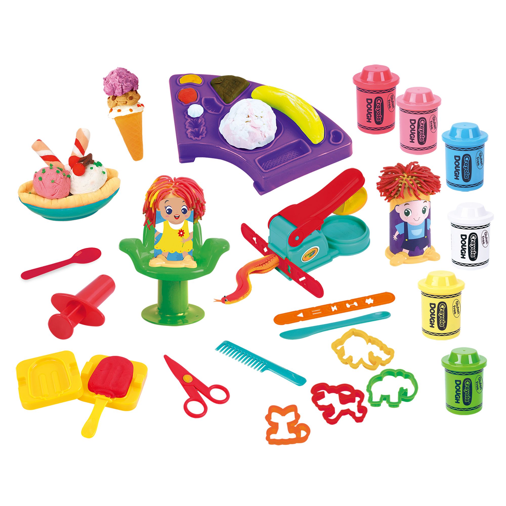 Use your imagination to create endless hairstyles/ice-cream desserts Sturdy plastic tools to last through endless play Gluten-free dough soft and non-toxic Easy to blend, roll and shape into unlimited creative possibilities Resealable lids allow keeping the dough soft and fresh when not in use Recommended for age 3+ Includes six 5-oz. tubs of rice-based dough, four animal cutters, molder/extruder unit, mold, two mold, two extruder stencils, plunger, two character extruders, comb, scissors, chair, chair holder, spoon, cone, dish, spatula, and ice pop stick