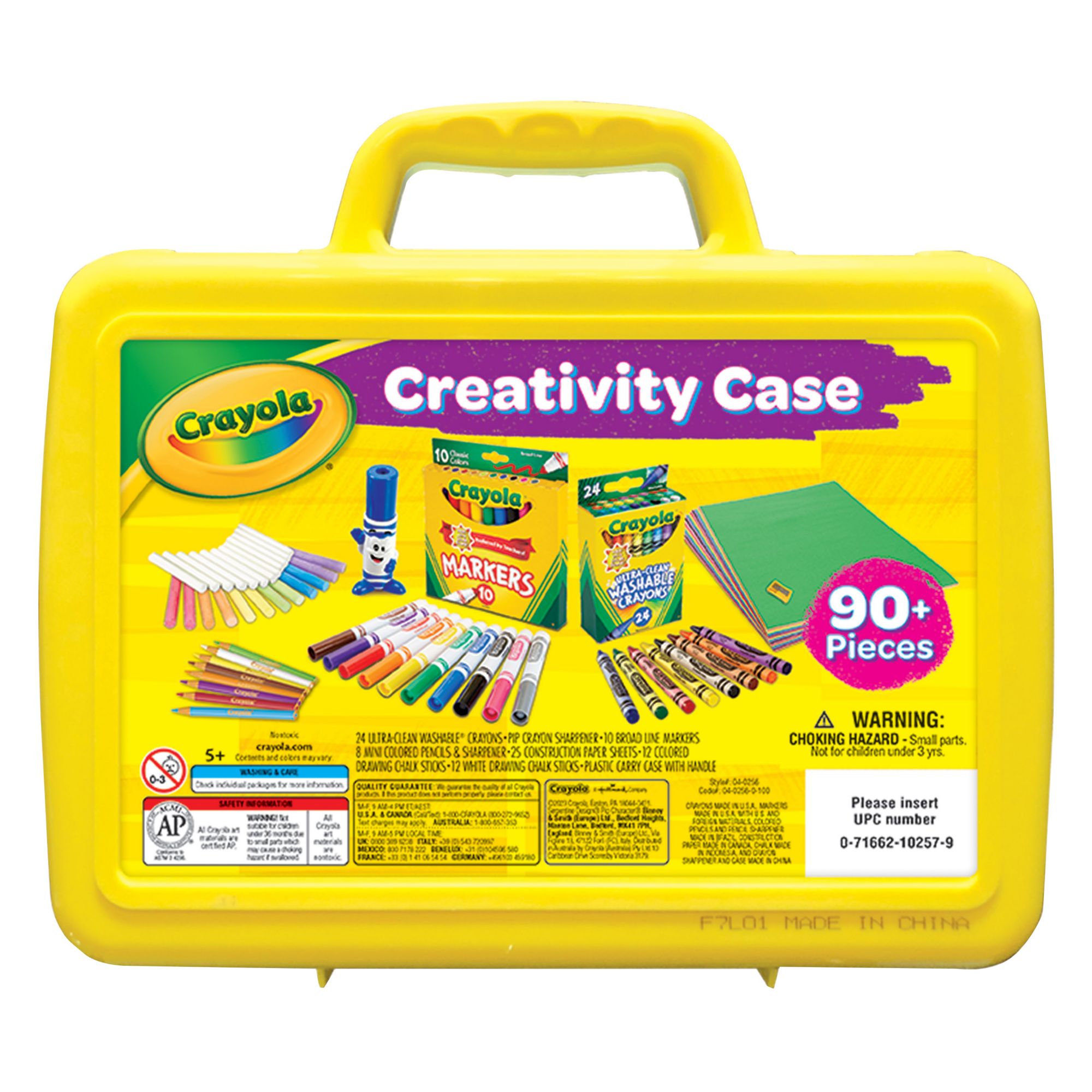 Includes 24 ultra clean washable crayons, crayon sharpener, 10 broad line markers, 8 colored pencils, 25 construction paper sheets, 24 chalk sticks, carrying case