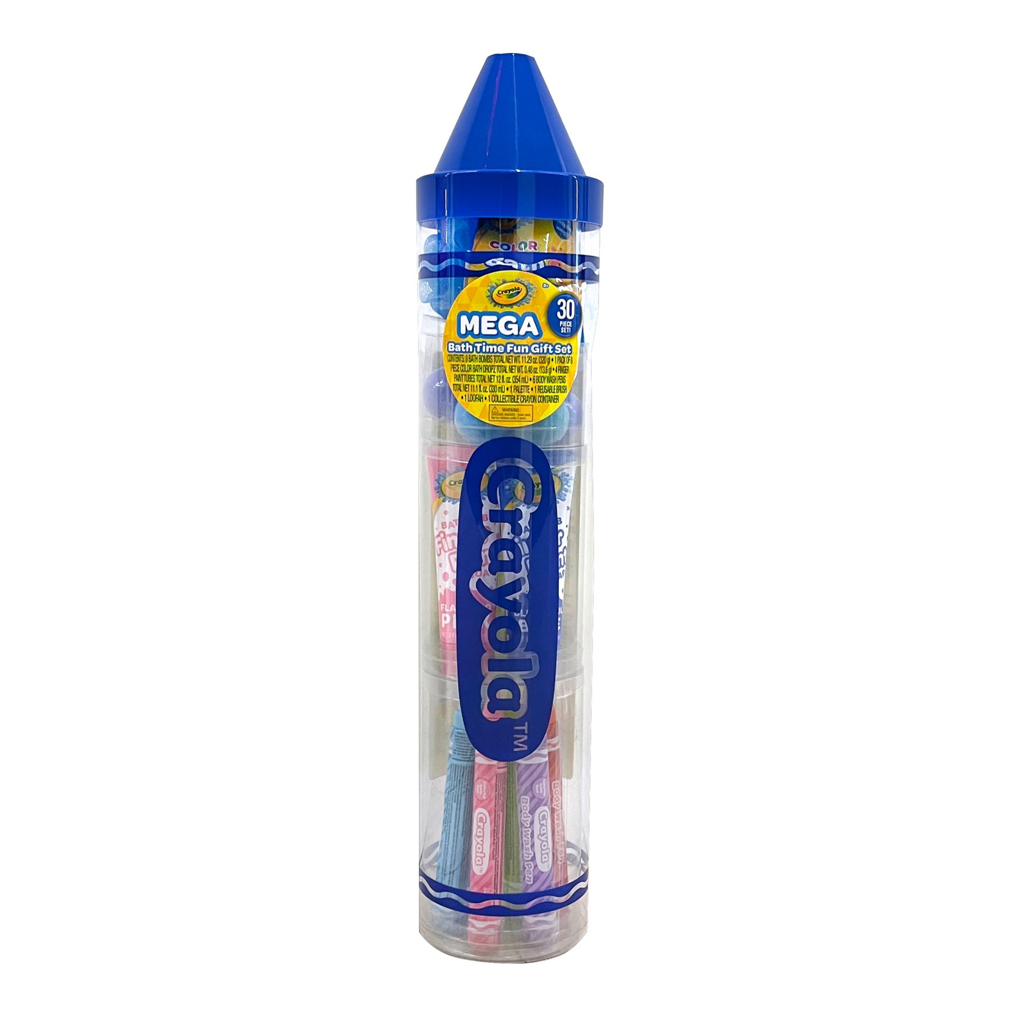 Embrace the color of Crayola in this amazing all-in-one bath set that will provide endless hours of bath time and fun. At almost 3' high this huge crayon-shaped gift set has over 30 Pc. of this top-selling Crayola favorites. The set includes eight bath bombs in assorted colors, eight Bath Dropz, four bathtime finger paints, six body wash pens, one pallet, one reusable brush, and one loofah all in a beautiful collectible container. All products are safe and effective and will bring out nothing but smiles in your little artist. This set comes in three great colors blue, pink and classic Crayola green.