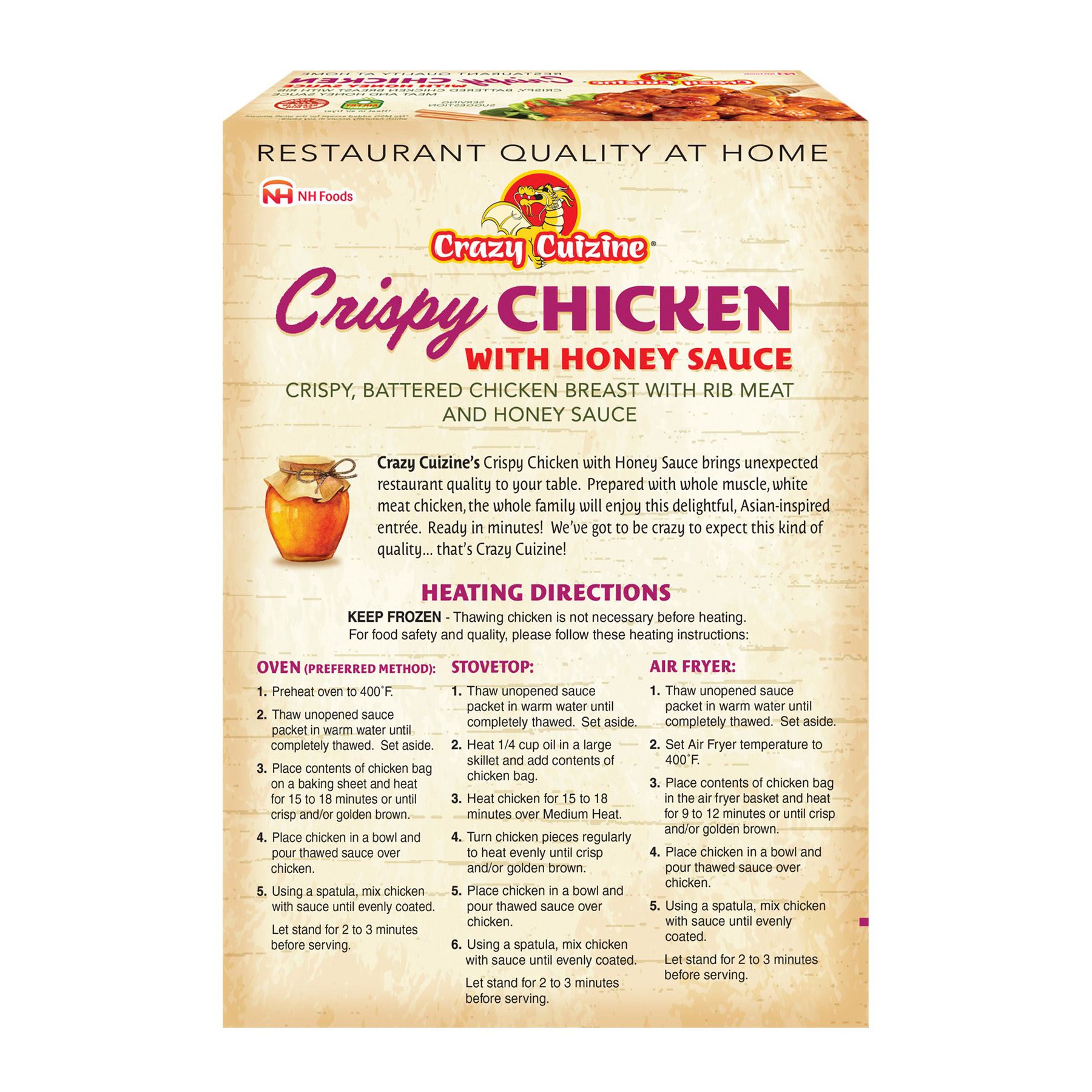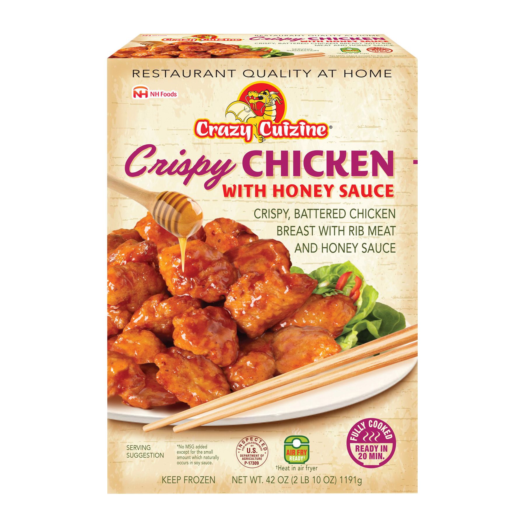 Crazy Cuizine Crispy Chicken with Honey Sauce brings unexpected restaurant quality to your table. Prepared with whole muscle, white meat chicken, savor the authentic flavors only found in traditional Chinese kitchens. Ready in minutes! No added flavors, colors, preservatives, or MSG. So convenient in your air fryer.