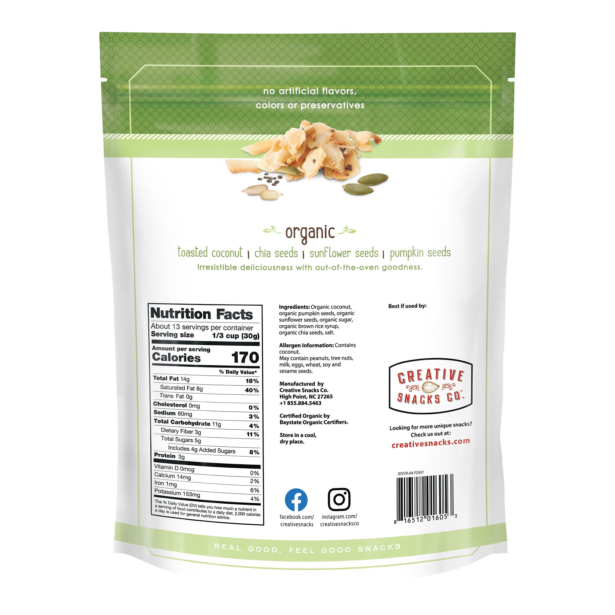 USDA Certified Organic Coconut Clusters Flaky Layers of toasted coconut with chia seeds, sunflower seeds, and pumpkin seeds No artificial ingredients Eat as a snack or mix in to yogurt