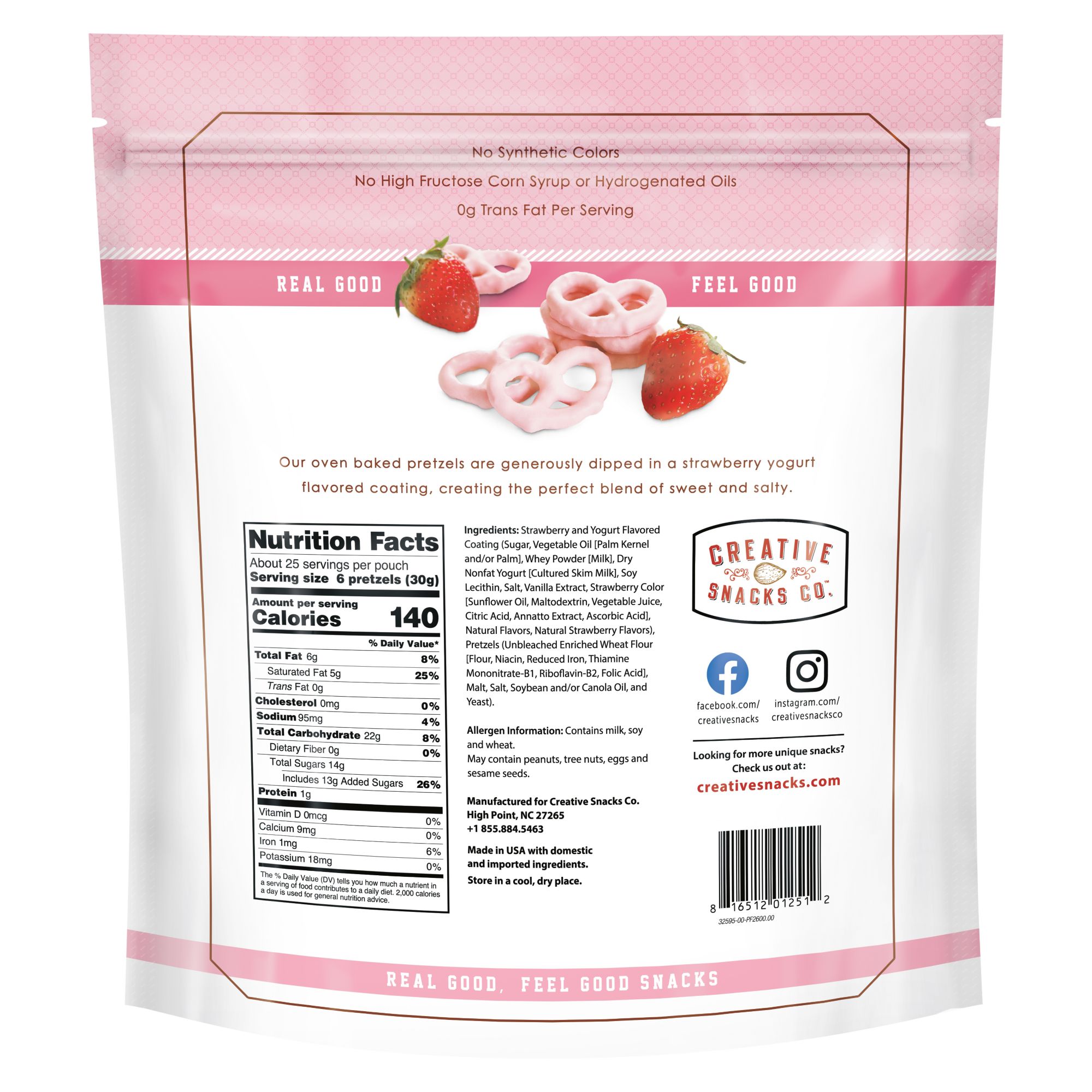 Ingredients: Strawberry and Yogurt Flavored Coating (Sugar, Vegetable Oil [Palm Kernel and/or Palm], Whey Powder [Milk], Dry Nonfat Yogurt [Cultured Skim Milk], Soy Lecithin, Salt, Vanilla Extract, Natural Flavor, Natural Strawberry Flavor, Pretzels (Unbleached Enriched Wheat Flour [Flour, Niacin, Reduced Iron, Thiamine Mononitrate-B1, Riboflavin-B2, Folic Acid], Malt, Salt, Soybean and/or Canola Oil, and Yeast).