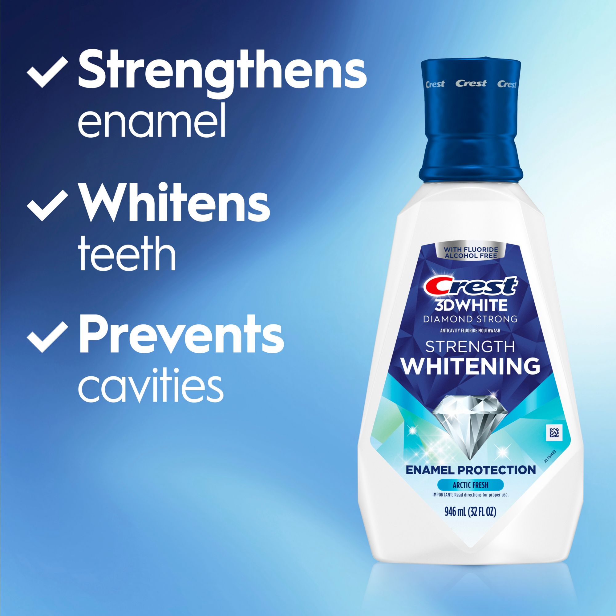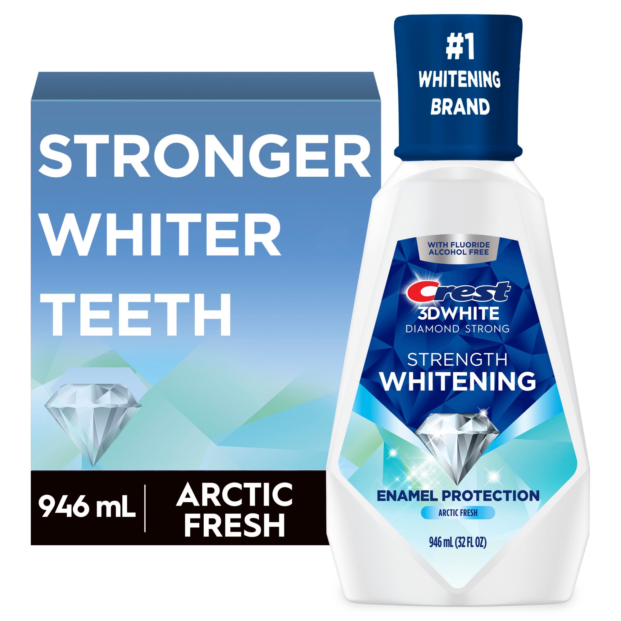 Reveal a stronger, more vivid smile with Crest 3D White Strength Whitening Mouthwash. The powerful peroxide and fluoride-infused rinse gently whitens teeth in just 7 days while also strengthening weakened tooth enamel to help prevent cavities. Strength Whitening's multi-benefit formulation goes beyond by killing millions of bad breath germs, leaving you feeling refreshed with a 100% whole mouth clean without the harsh burn of alcohol. For optimal results, use twice a day - both morning and night.