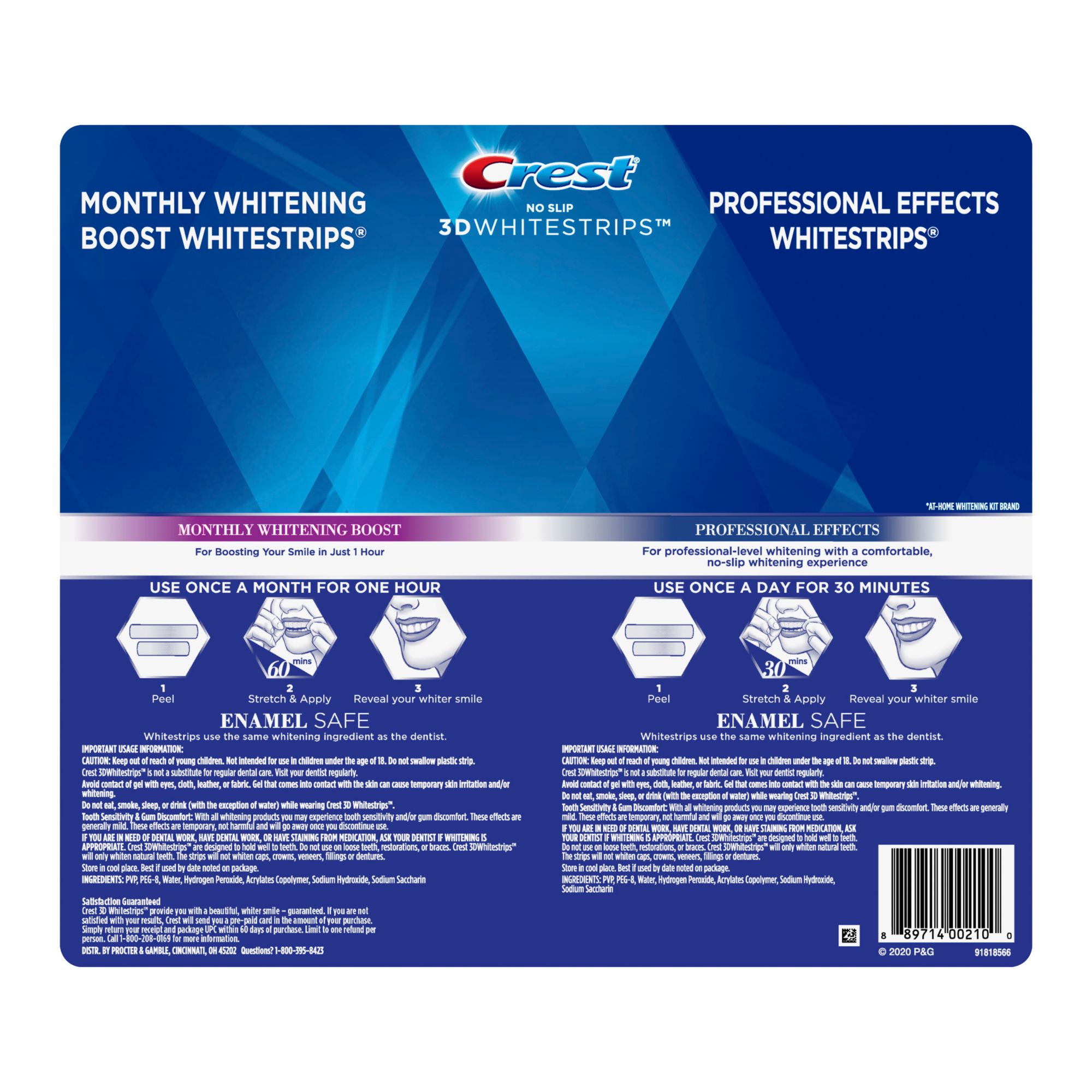 Kit includes 20 Professional Effects whitening strip treatments, and 12 Monthly Whitening Boost whitening treatments, each with 1 upper and 1 lower strip Professional Effects: a professional level whitening experience Monthly Whitening Boost: for a monthly boost to whiten your smile and touch-up between whitening treatments Advanced Seal Technology’s no slip grip stays put so you can talk and drink water while whitening teeth Safe on enamel using the same whitening ingredient as dentists