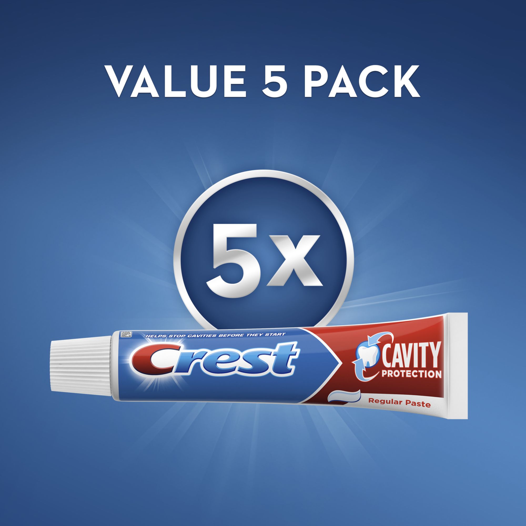 Includes five 8.2 oz. tubes of Crest Cavity Protection toothpaste