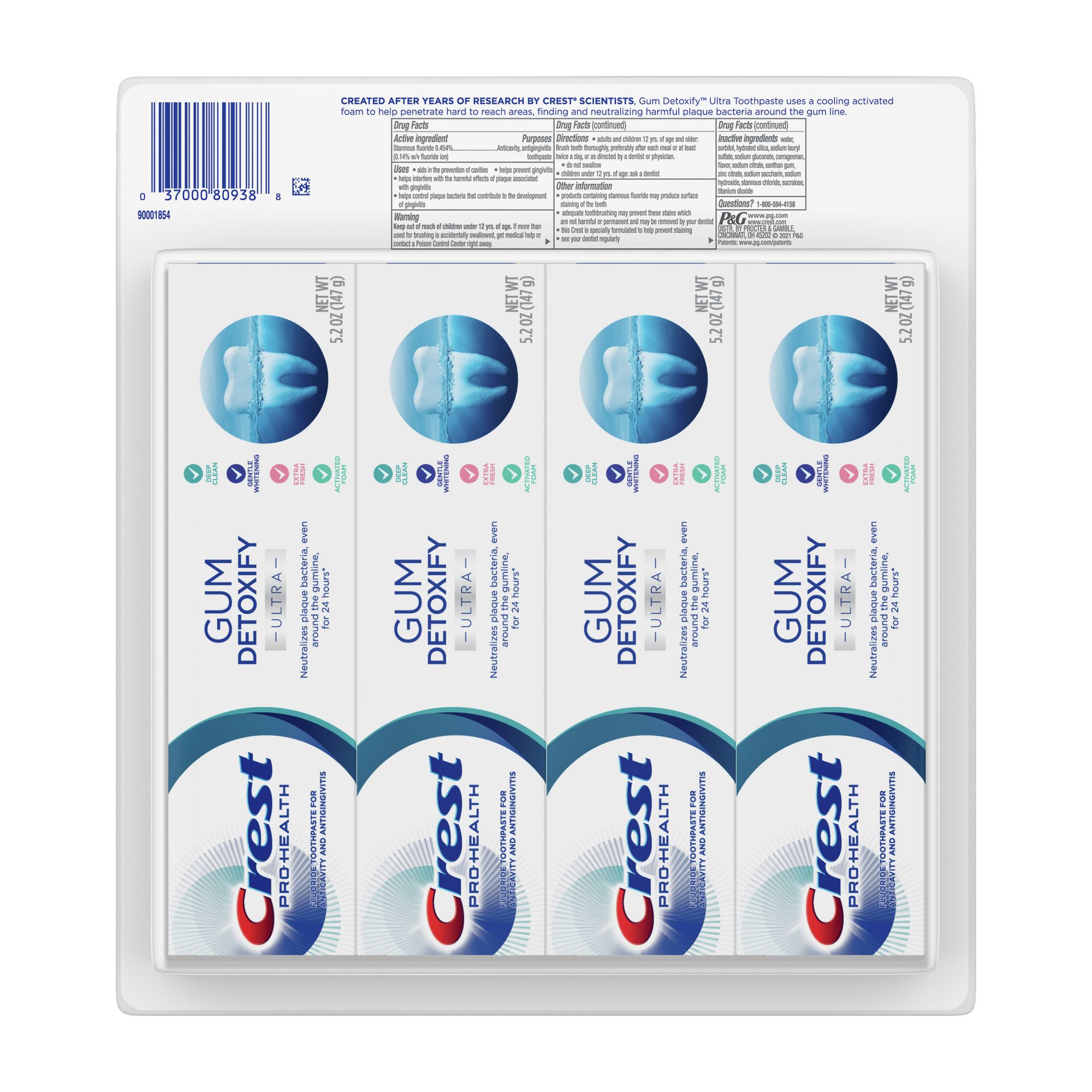 Includes four 5.2 oz tubes of Crest Gum Detoxify Deep Clean Toothpaste Includes four 5.2 oz tubes of Crest Gum Detoxify Deep Clean Toothpaste Neutralizes plaque bacteria, even around the gum line to fight gingivitis Clinically proven healthier gums Activated foam seeks out plaque bacteria in hard to reach places Gently cools gums during and after brushing